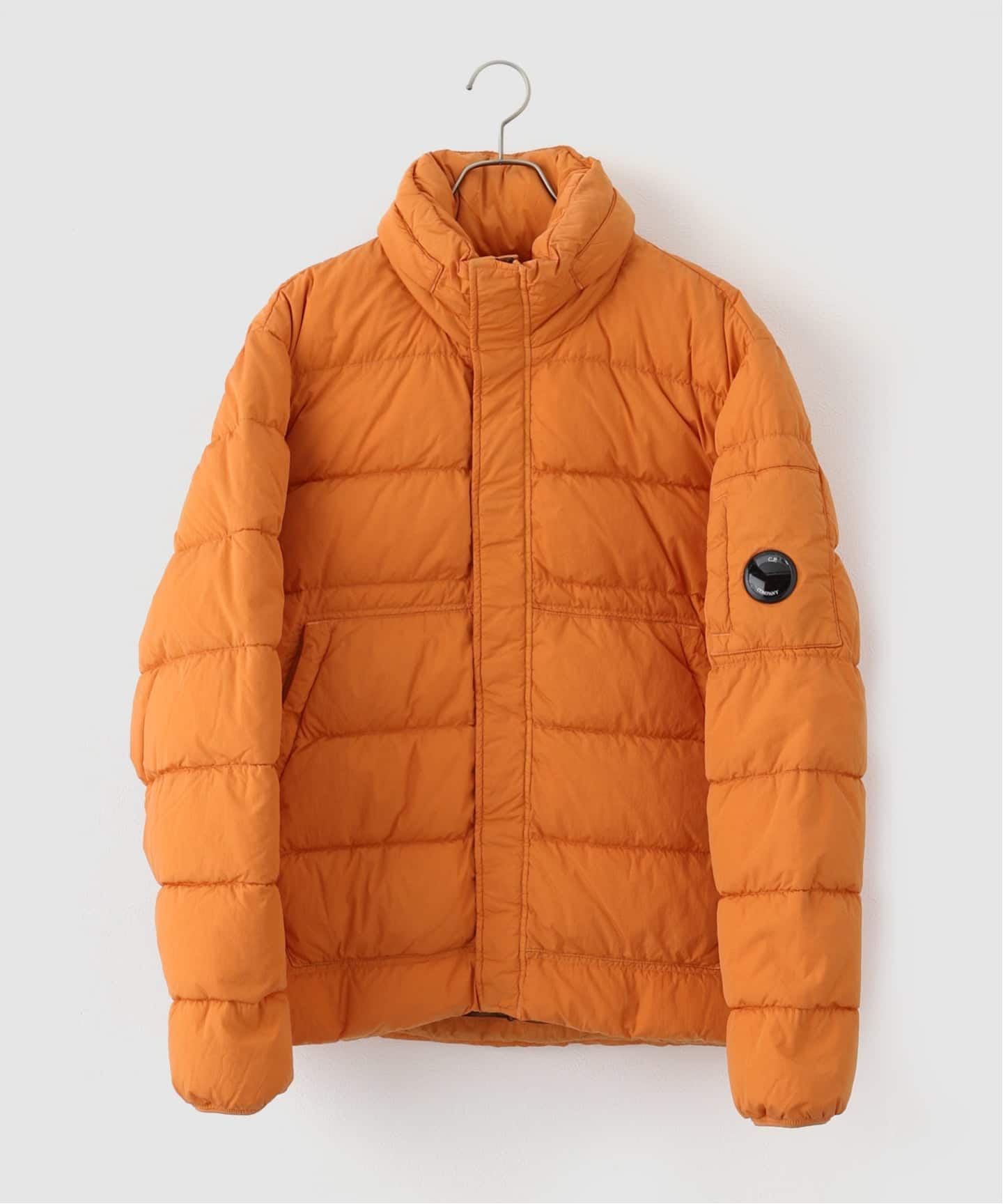 C.P. Companyのアイコニックなレンズディテールを備えた、収納可能なフードが付いたショート丈のダウンジャケット。