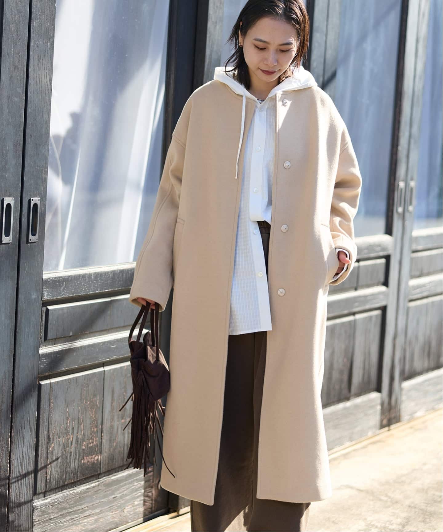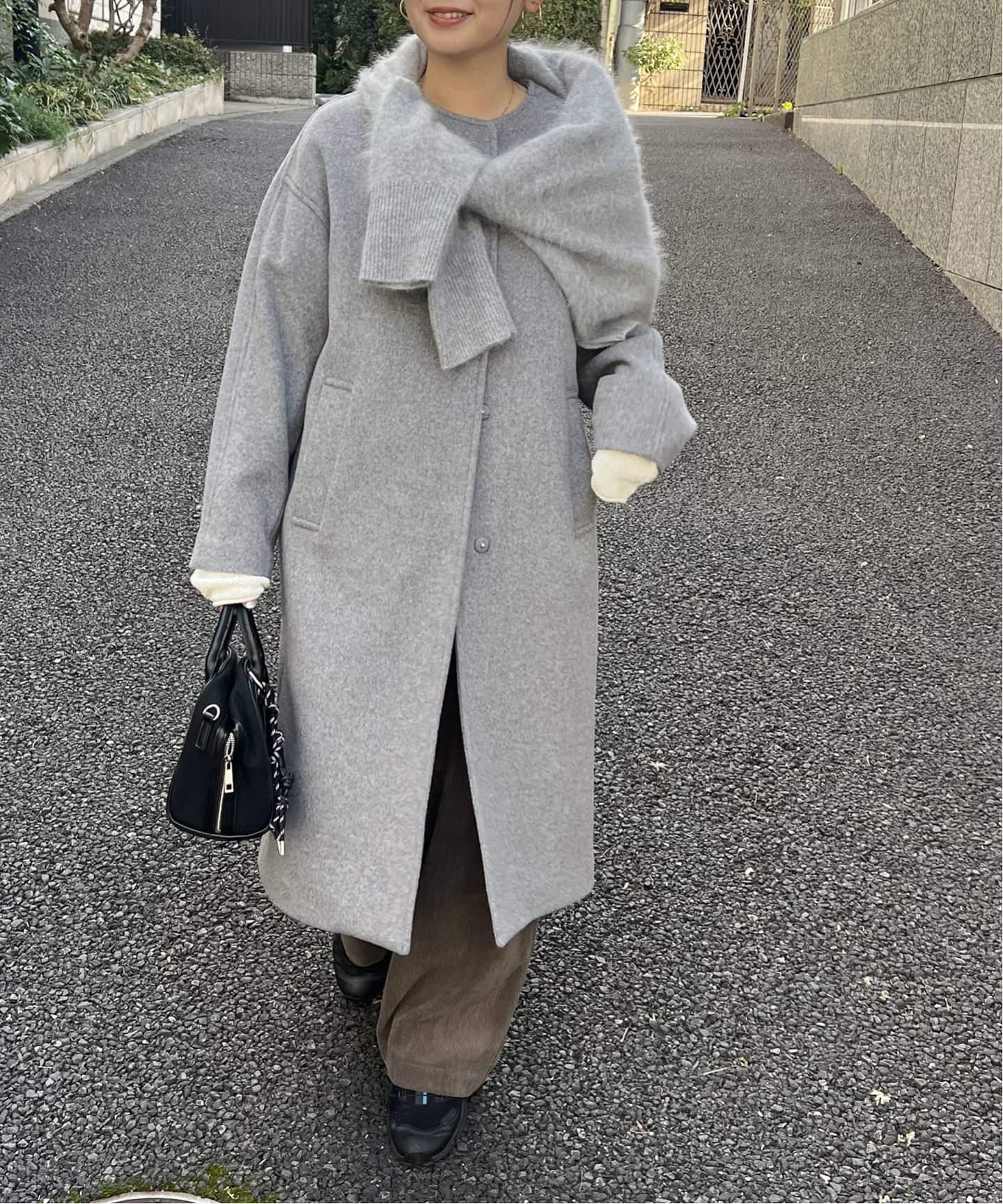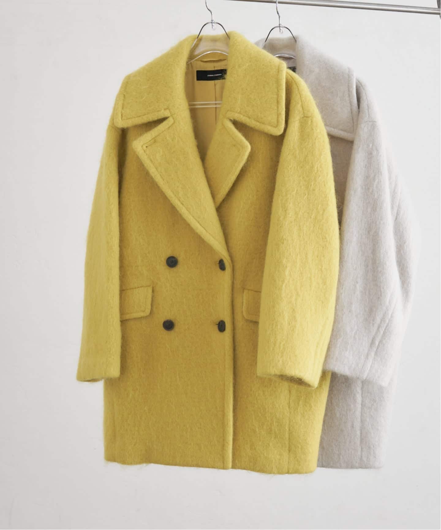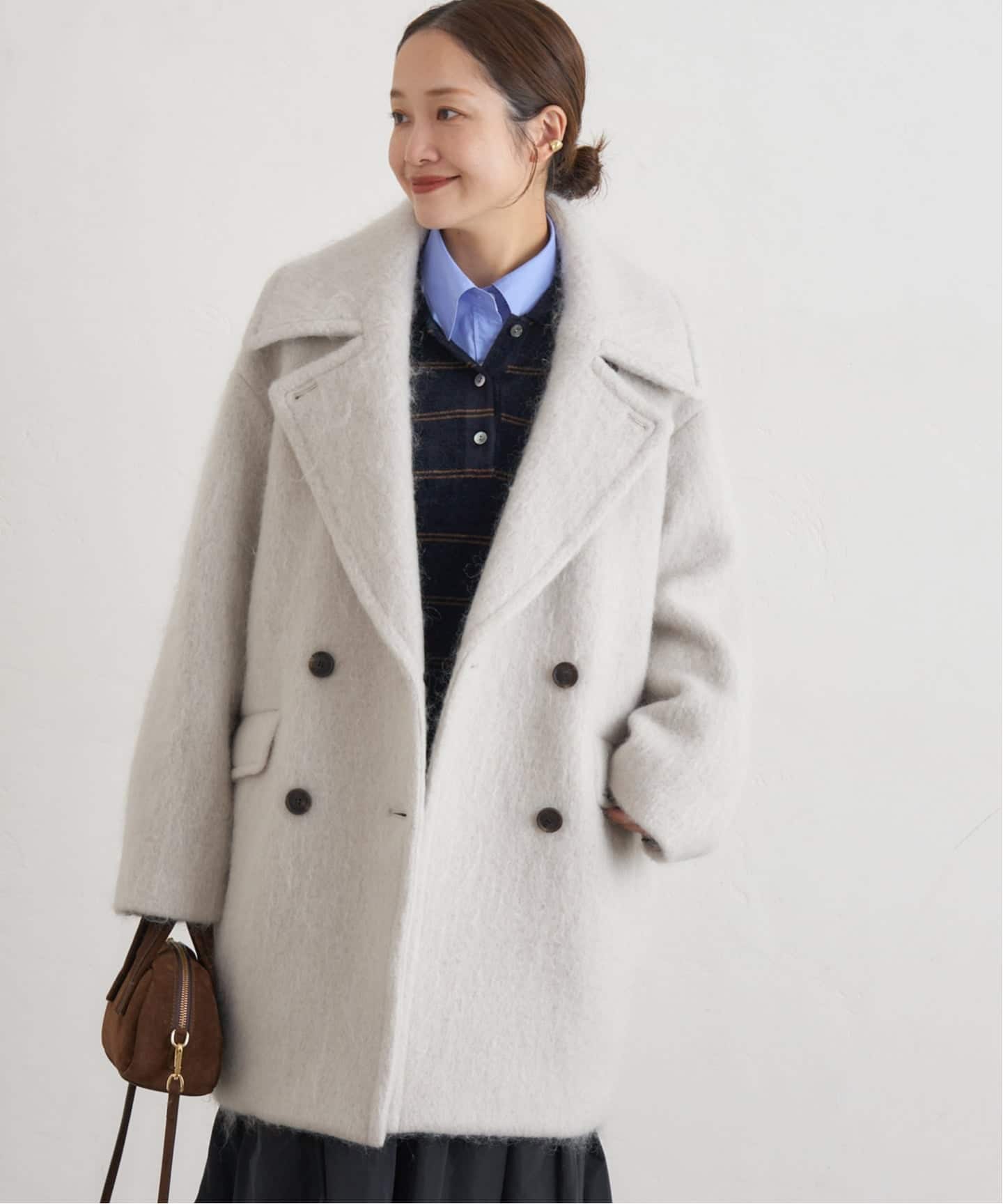 ウールにモヘヤをブレンドし、シャギー加工で毛足の長さが特徴の生地で仕立てたミドル丈のコート。