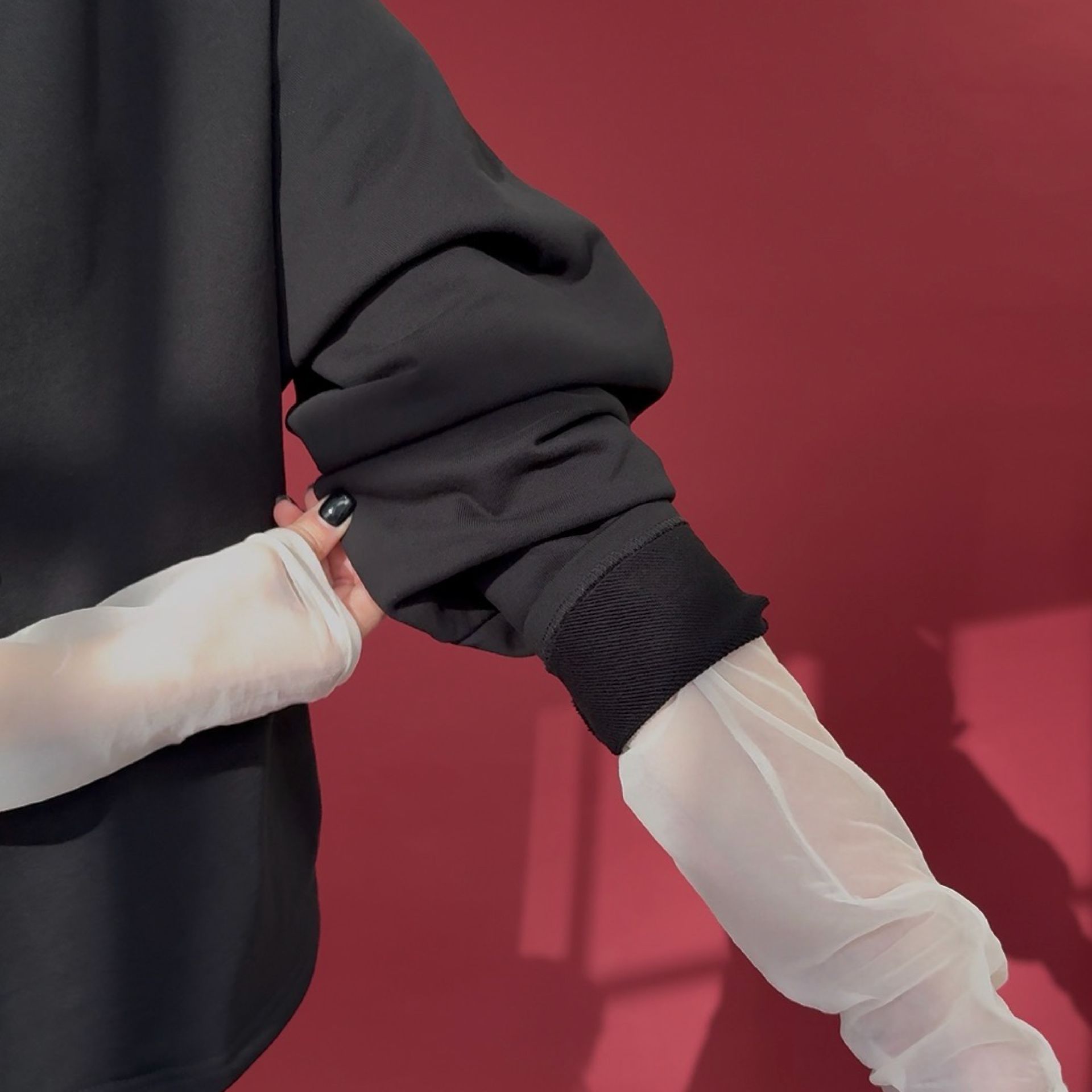 シアー素材とのレイヤードは、ふんわりした生地との対比で違和感のあるモードな着こなしに。
