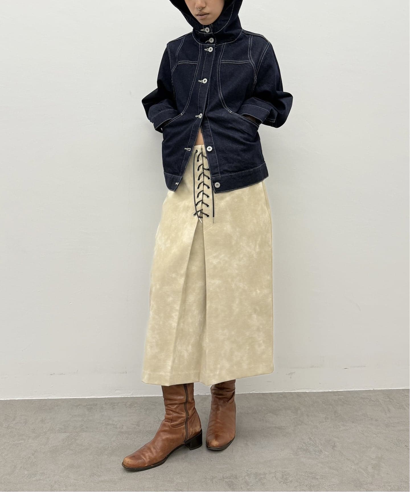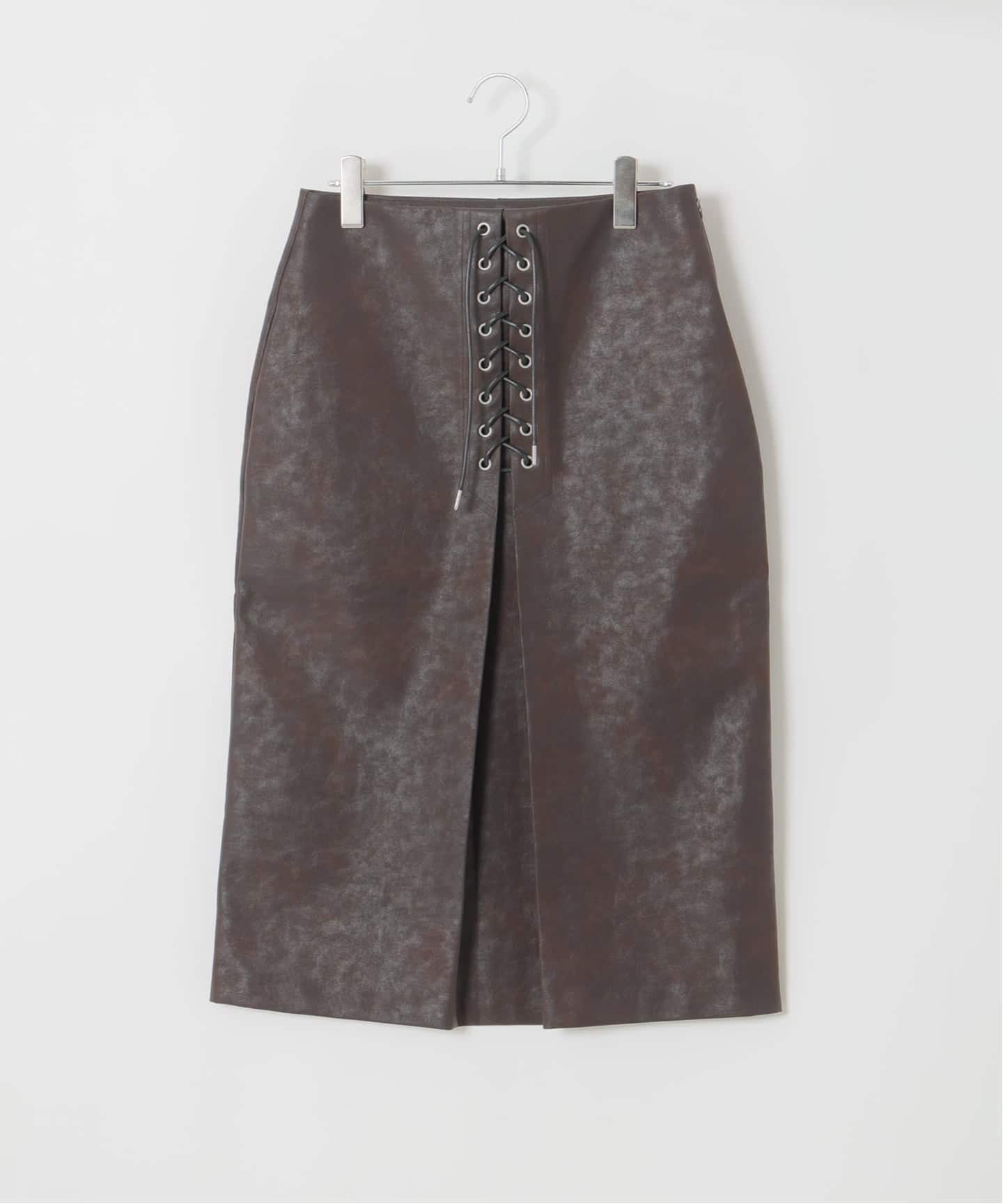 上品な雰囲気に仕上げた、レースアップがポイントのフェイクレザースカート。
