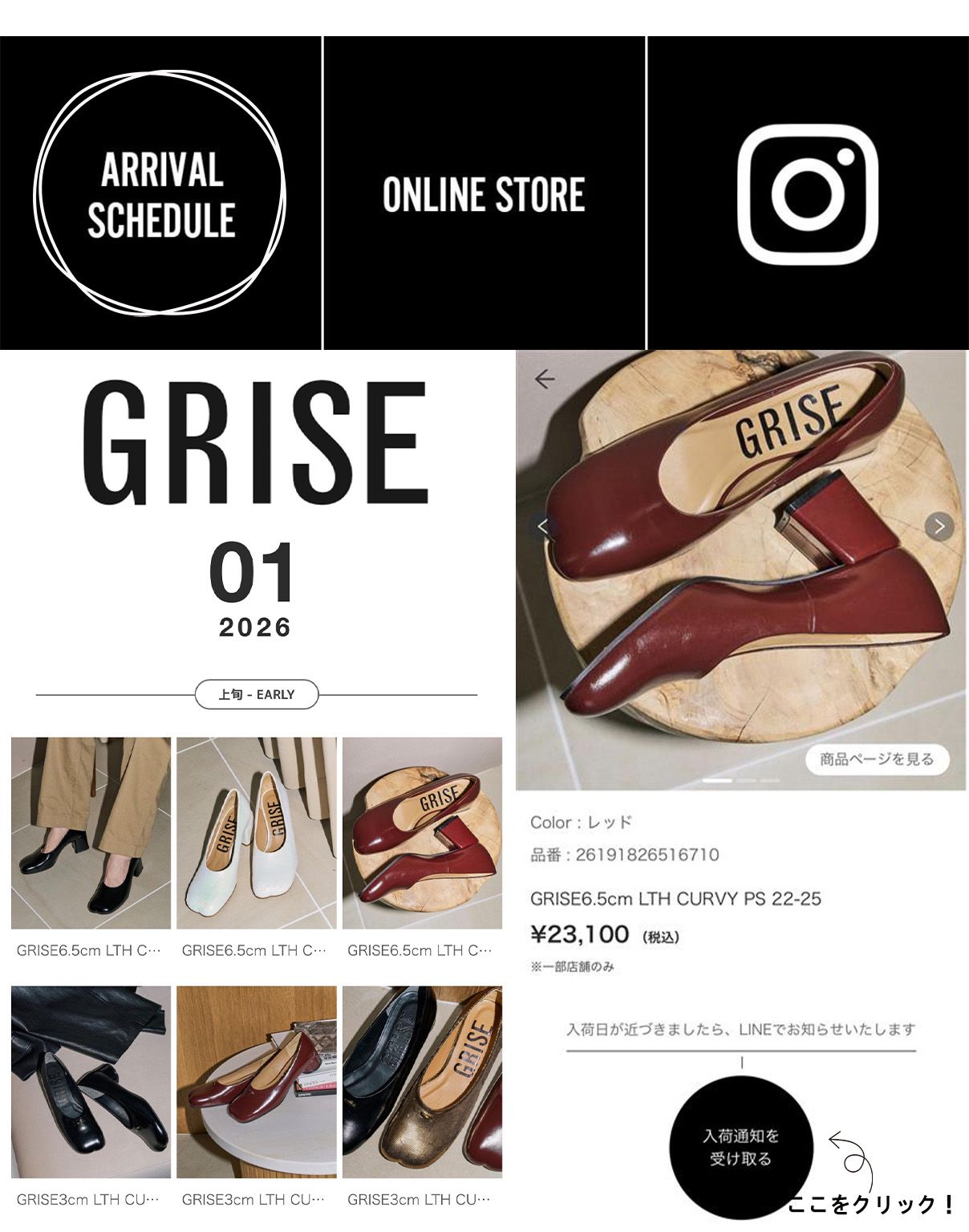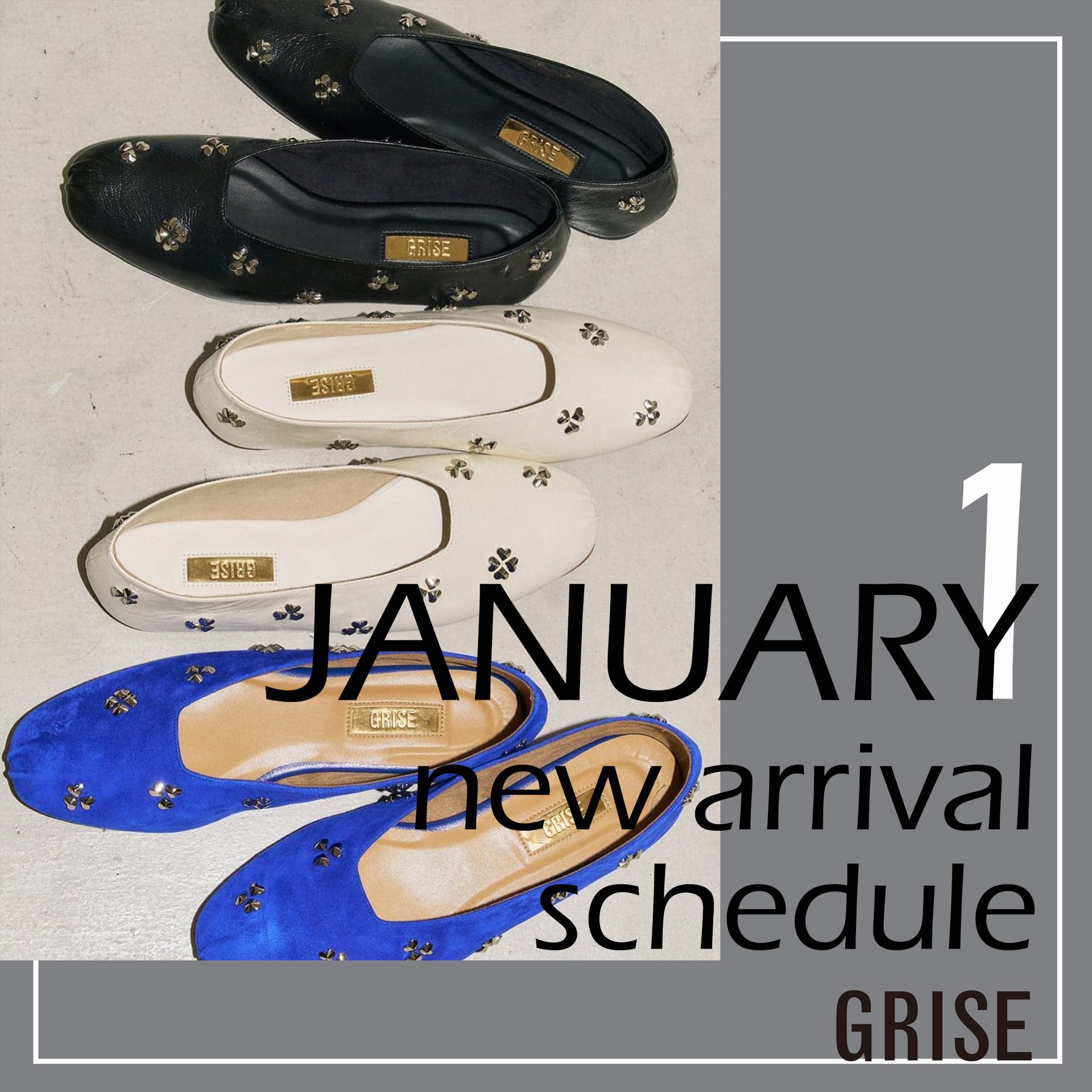 GRISE Online Store EC STAFF M GRISE|1月の入荷スケジュールをいち早くチェック! 2026.01.03 注目の1月入荷アイテムを一挙にご紹介。店舗・オンラインストアへ入荷するタイミングでお知らせも配信中!LINEで簡単に受付できますので、是非リンクからご登録ください。 ※BLOG・LINE掲載の入荷予定は変更となる可能性がございます。予めご了承くださいませ。 GRISE GRISE3cmレザーCURVYバレリーナ ゴールド | 23.5 ¥22,000 GRISE GRISE6.5cmレザーCURVYパンプス ホワイト | 23.5 ¥23,100 GRISE GRISEレザーCLOVERスタッズフラット ブルー | 23.5 ¥24,200 GRISE 《予約》GRISEレザーミラーワークフラット ベージュ | 23.5 ¥22,000 GRISE 《追加》GRISEスクエアグリッターフラット ネイビー | 23.5 ¥13,200 GRISE GRISE6cmレザースクエアツイストパンプス シルバー | 23.5 ¥22,000 GRISE GRISEレザースクエアクロスシームアンクルフラット ホワイト A | 23.5 ¥22,000 GRISE GRISEレザースクエアプリーツフラット ホワイト A | 23.5 ¥18,700 GRISE GRISEオブリークマニッシュ ナチュラル | 23.5 ¥18,700 GRISE GRISE VIBRAM ダブルストラップバレリーナ ベージュ | M ¥19,800 GRISE 《追加》GRISE VIBRAM メリージェーンスニーカー ブラック | M ¥18,700 ▼【最新特集】 GRISE nostalgic holidays