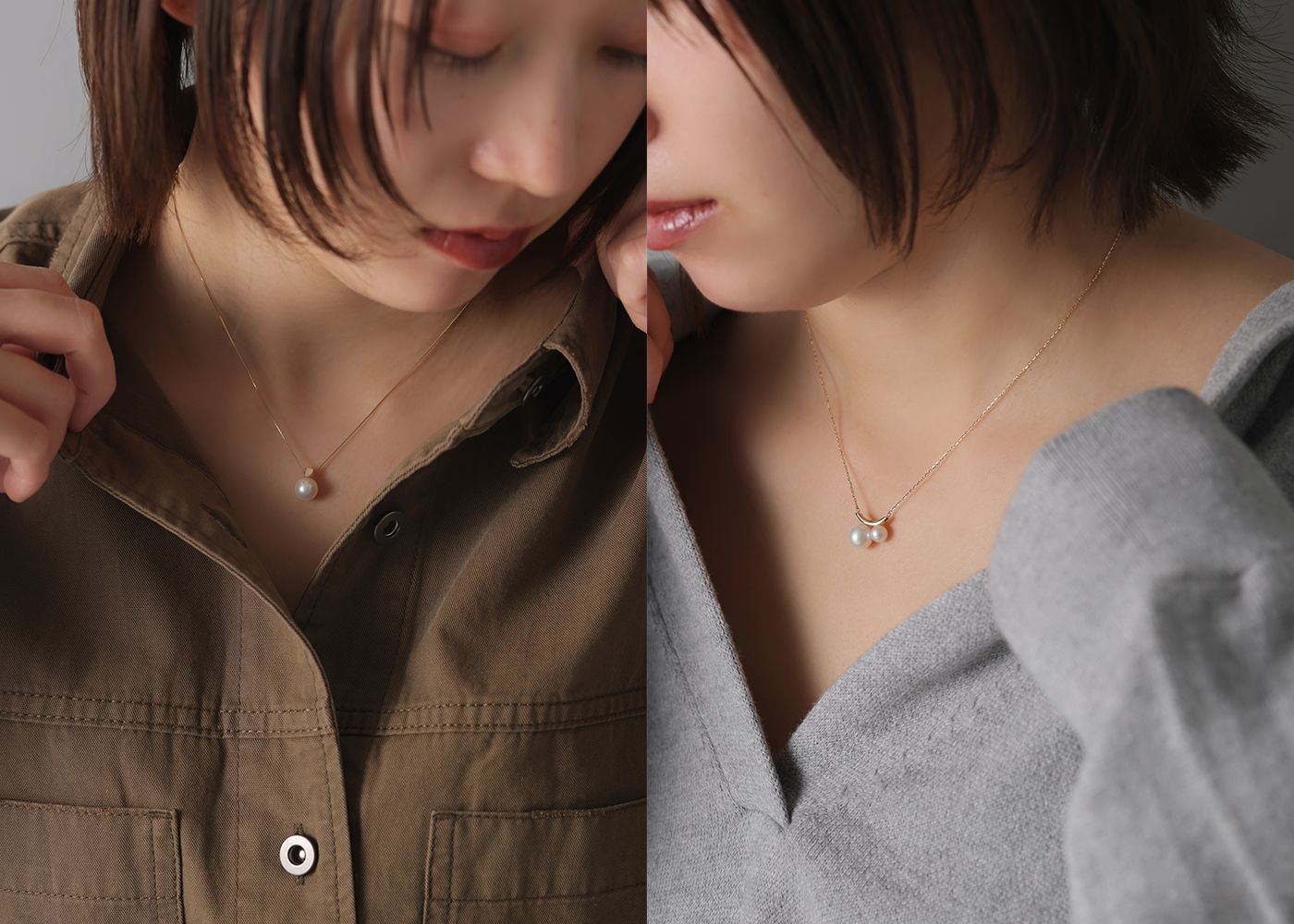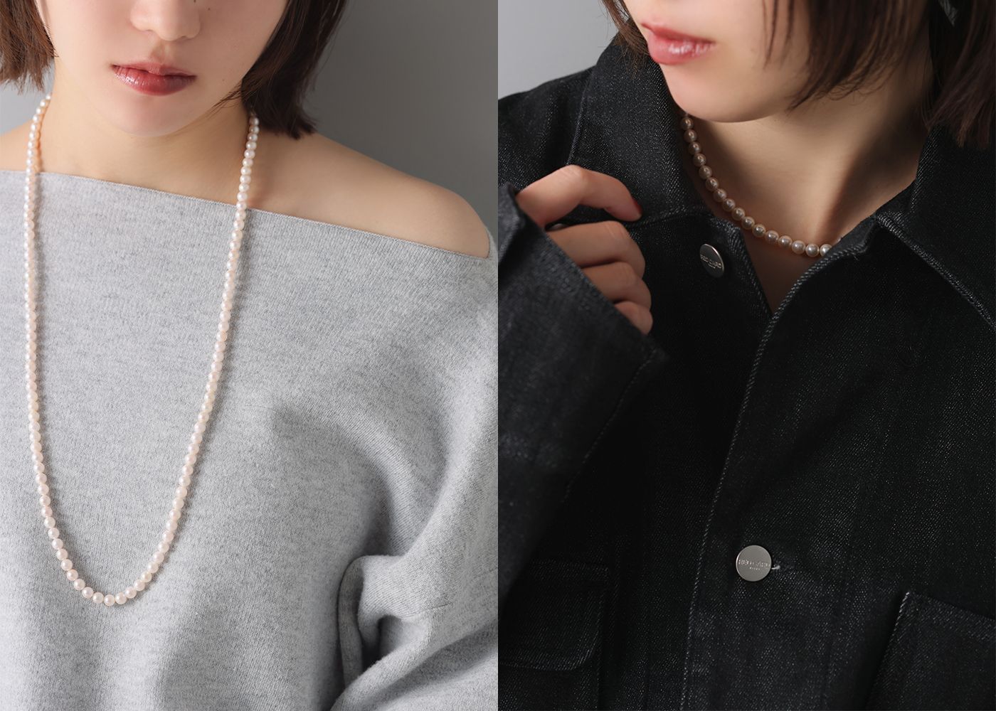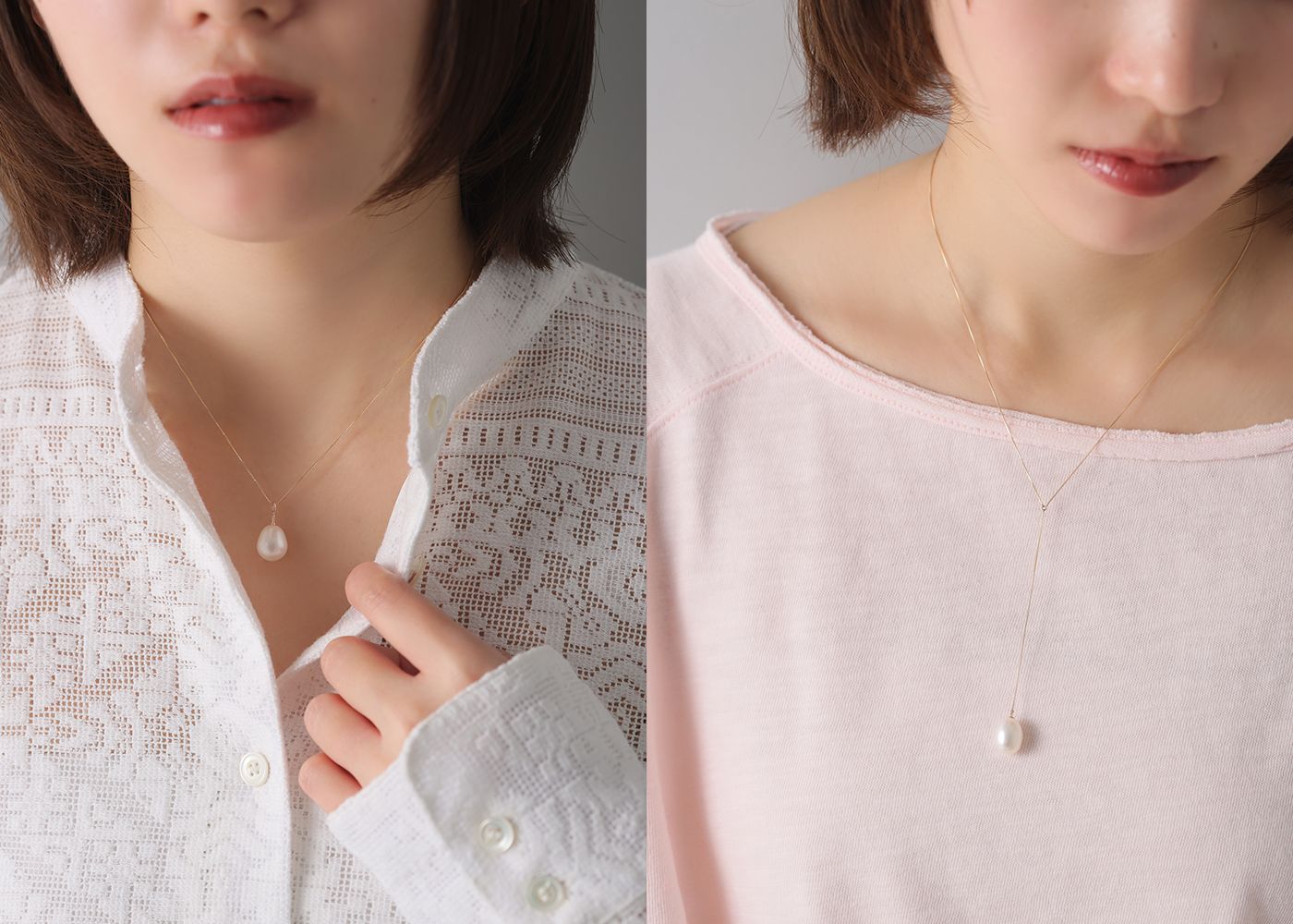 首元を上品に演出する程よい長さ。シンプルに一つで、または重ね付けでアレンジも自在。どちらも、パールならではの柔らかな輝きで、シンプルながら洗練された印象を与える一本です