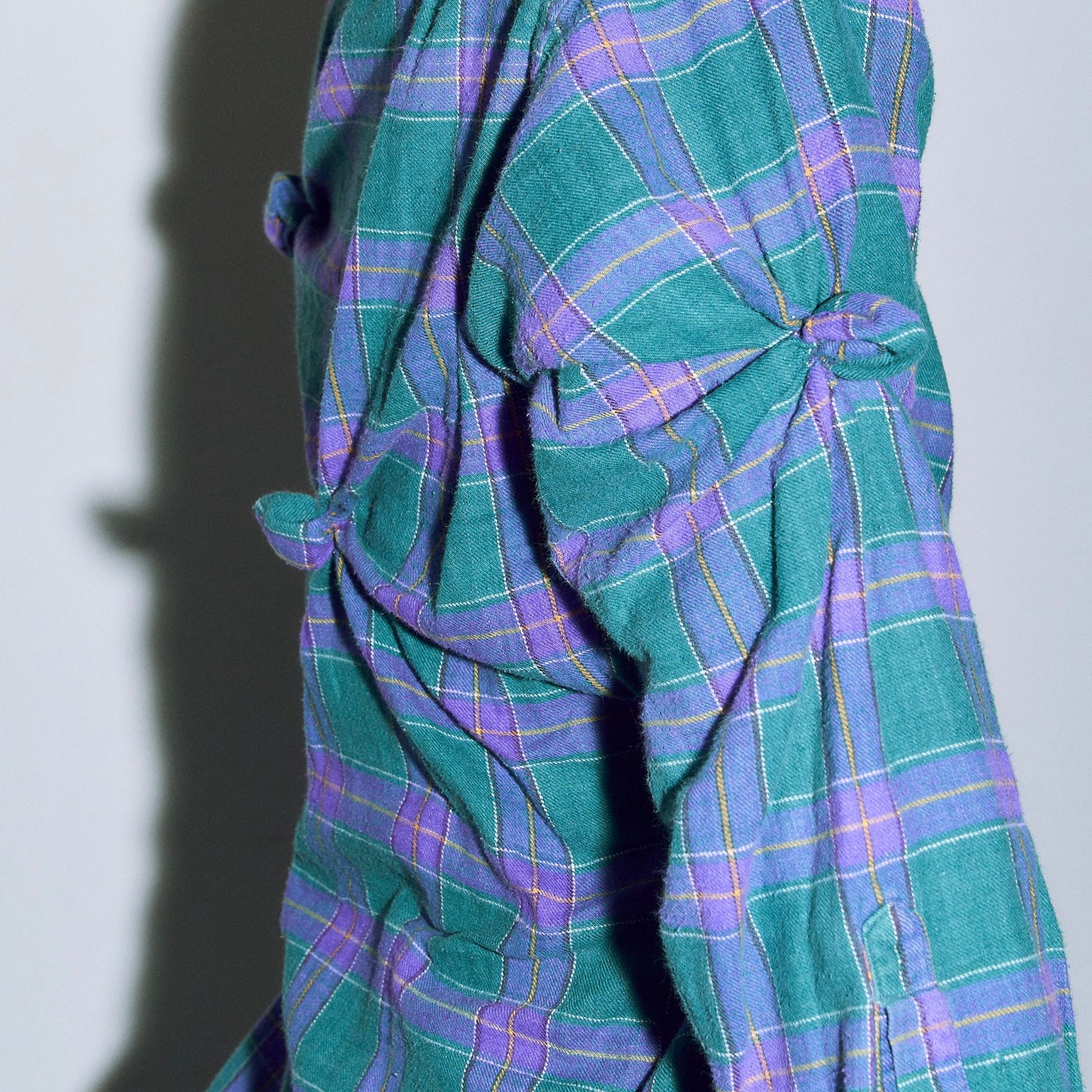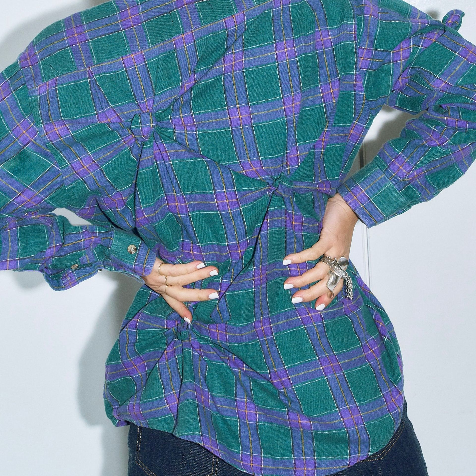 表情のあるチェック柄を厳選し、起毛生地のやわらかさを活かしつつ、ラフに寄りすぎないようウエストに絞りを加えたり、装い全体を程よく引き締めたデザイン。