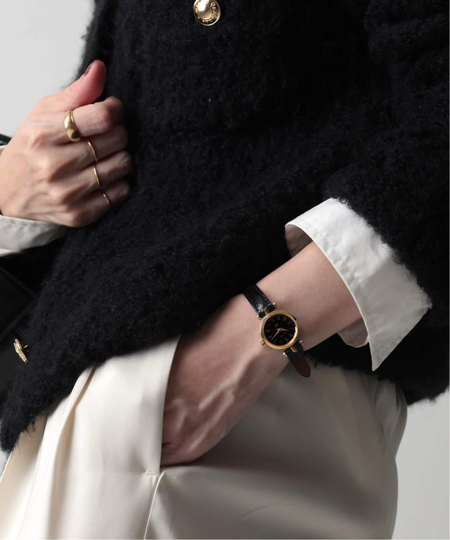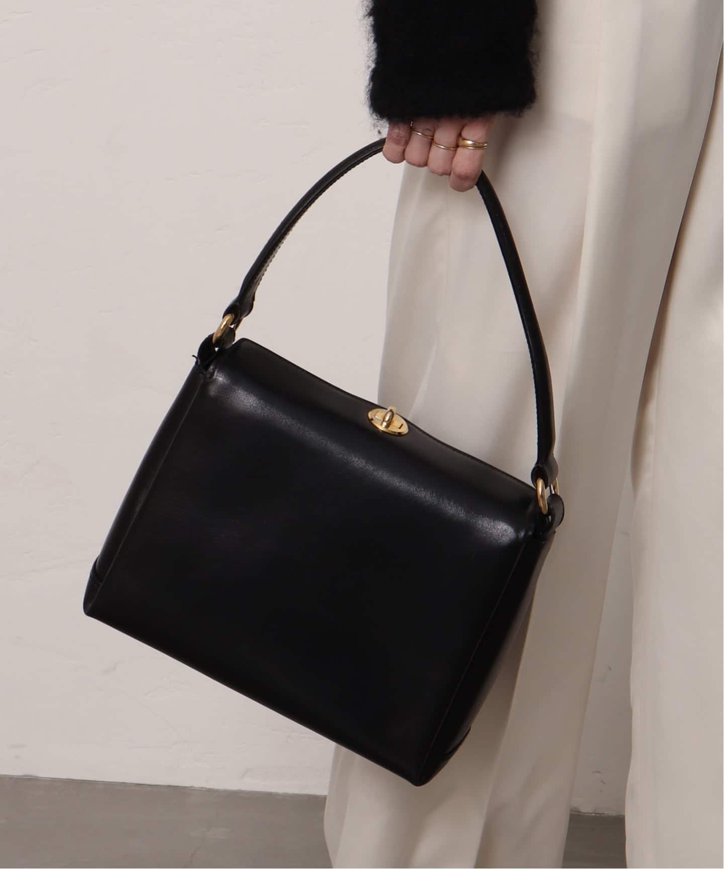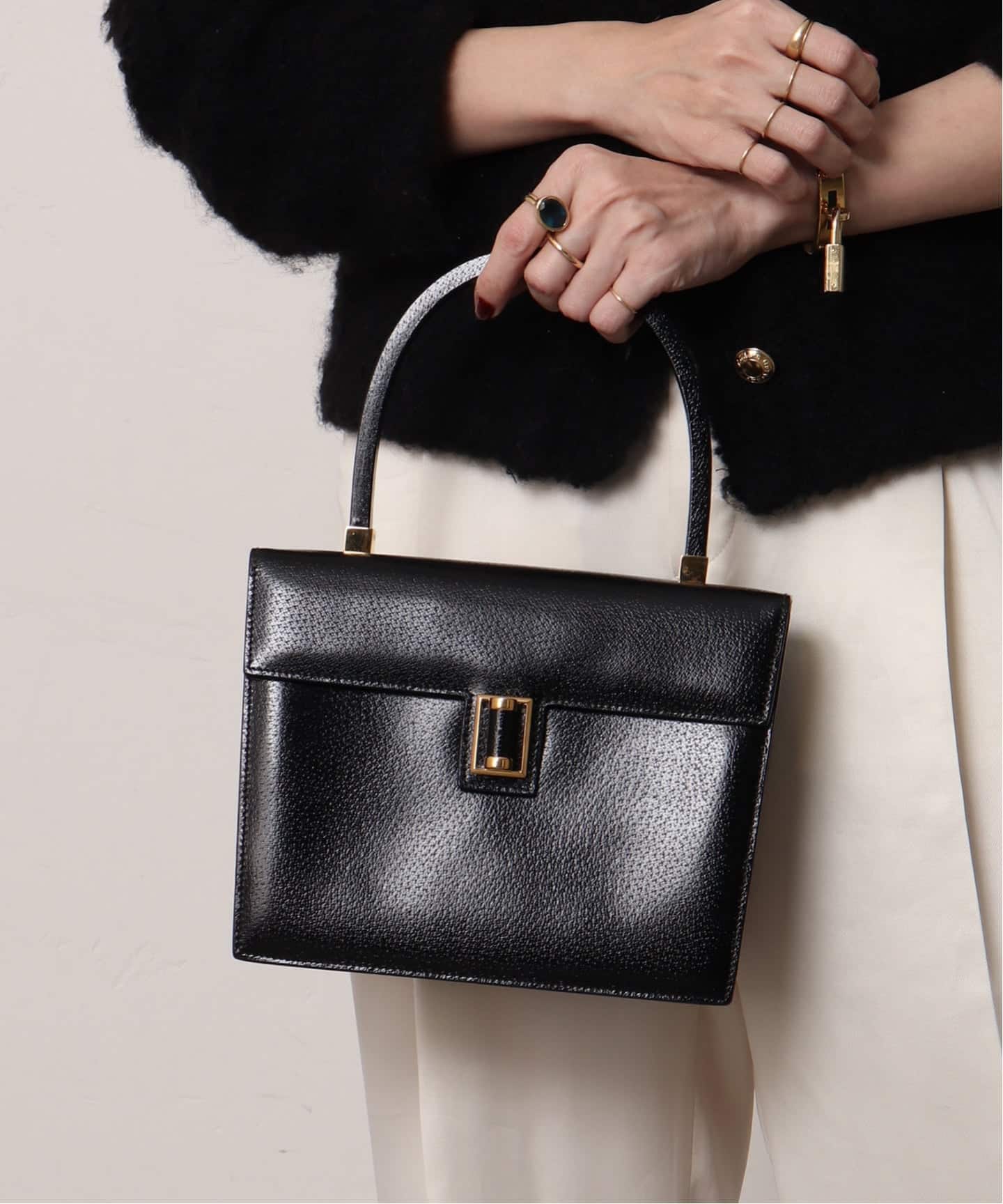 バニティバッグのハンドルに施されたホースビット金具が、控えめながらエレガントな雰囲気に。