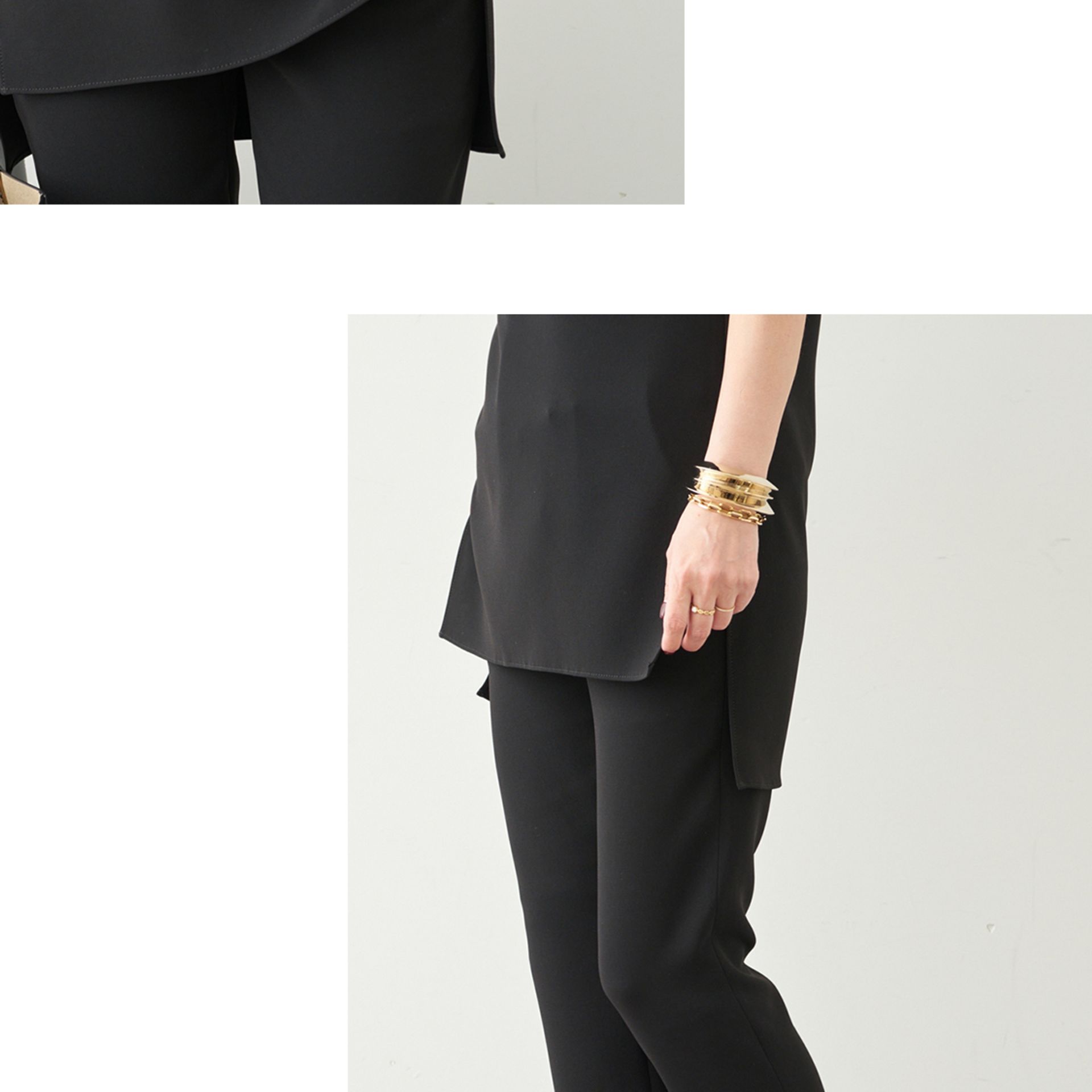 セットアップのNEWボトムはナチュラルなストレッチが心地よく、程よくゆとりをつくることで身体のラインをより綺麗に引き立てます。