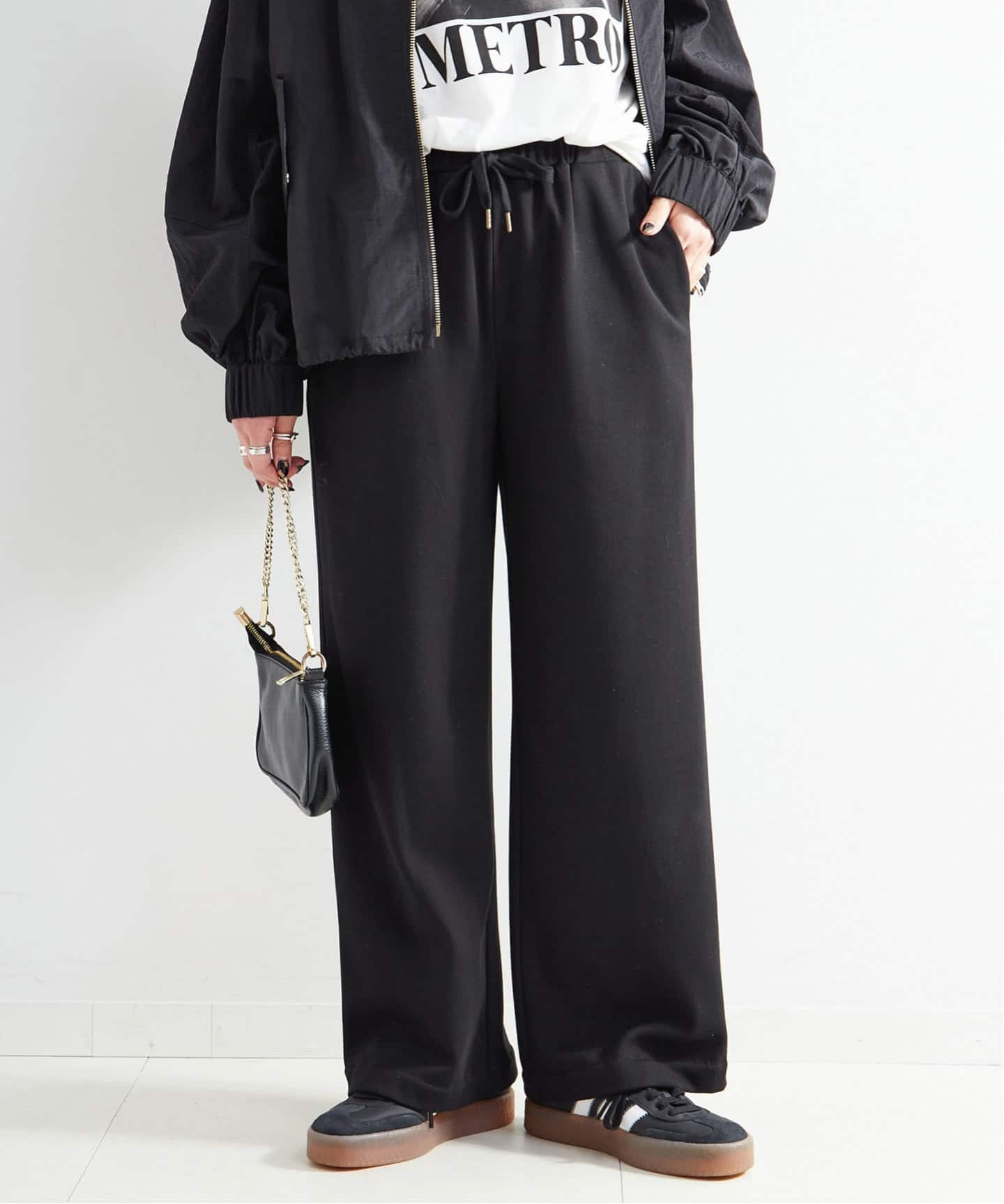 堀井さんはベルトを最大限に絞ったシルエットもお気に入り。「おにぎりバッグ」と命名したシャープなフォルムが、ぐんと辛口なムードに。