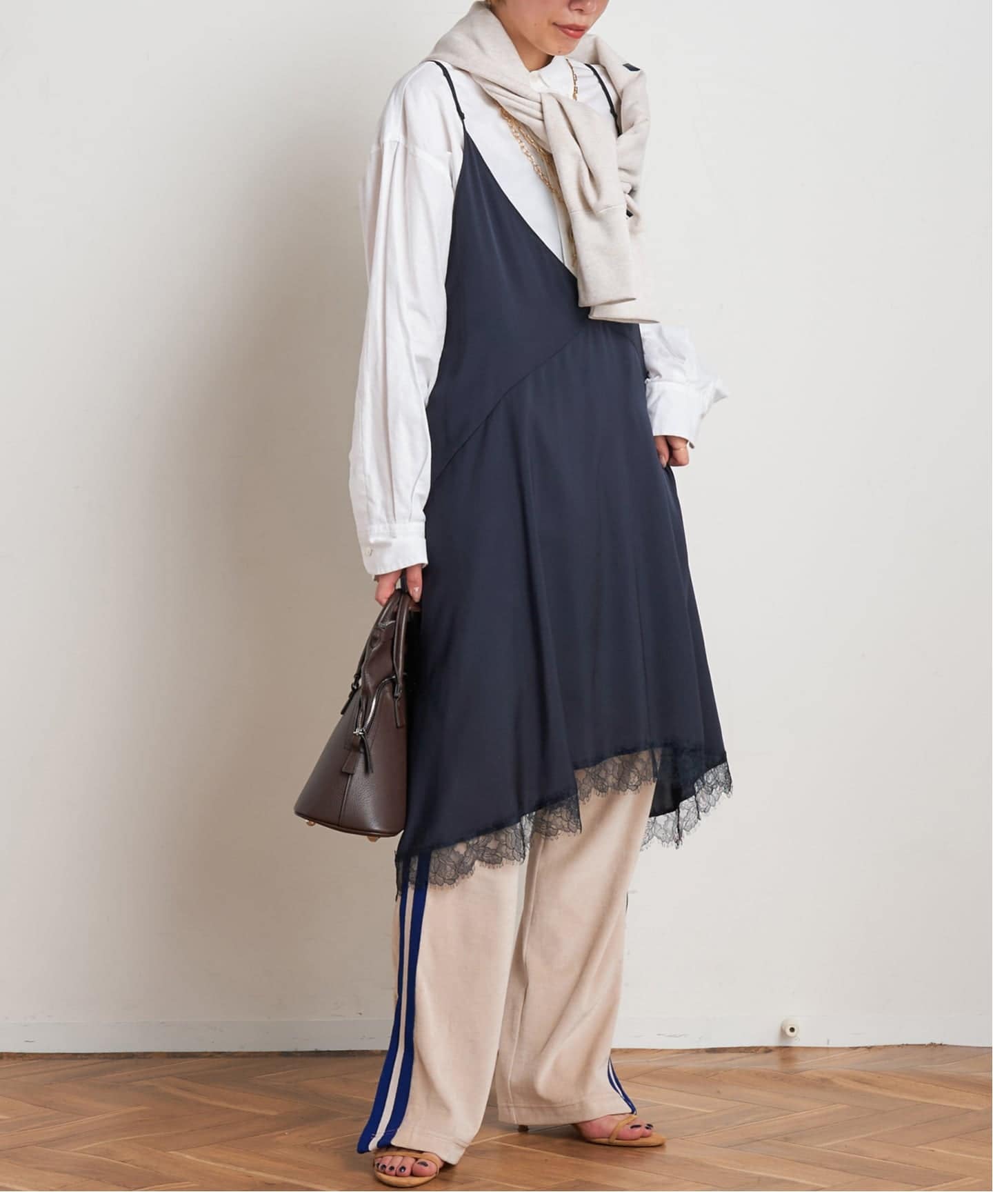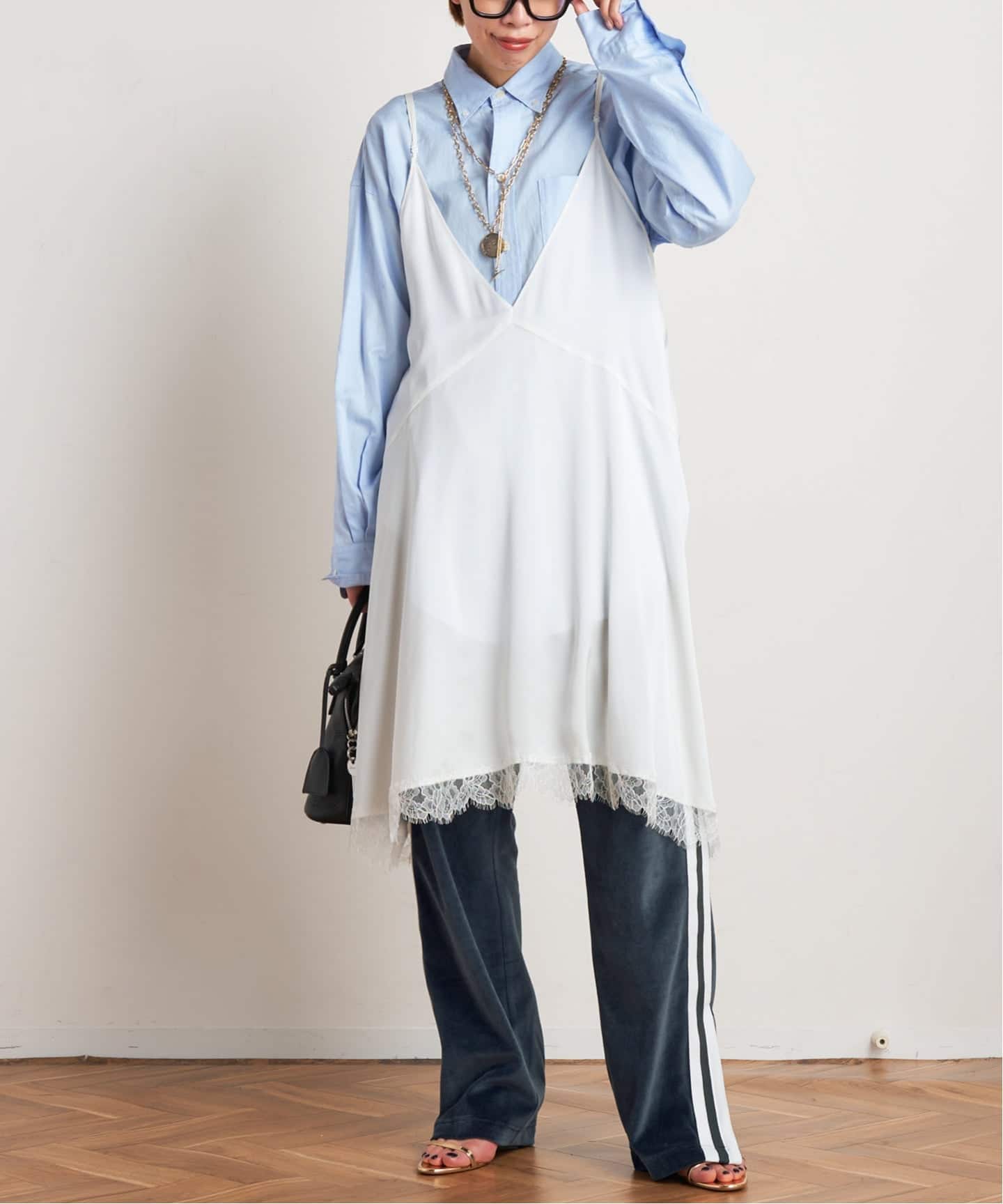 カジュアルなスウェットに合わせたいのは、レースキャミソール。