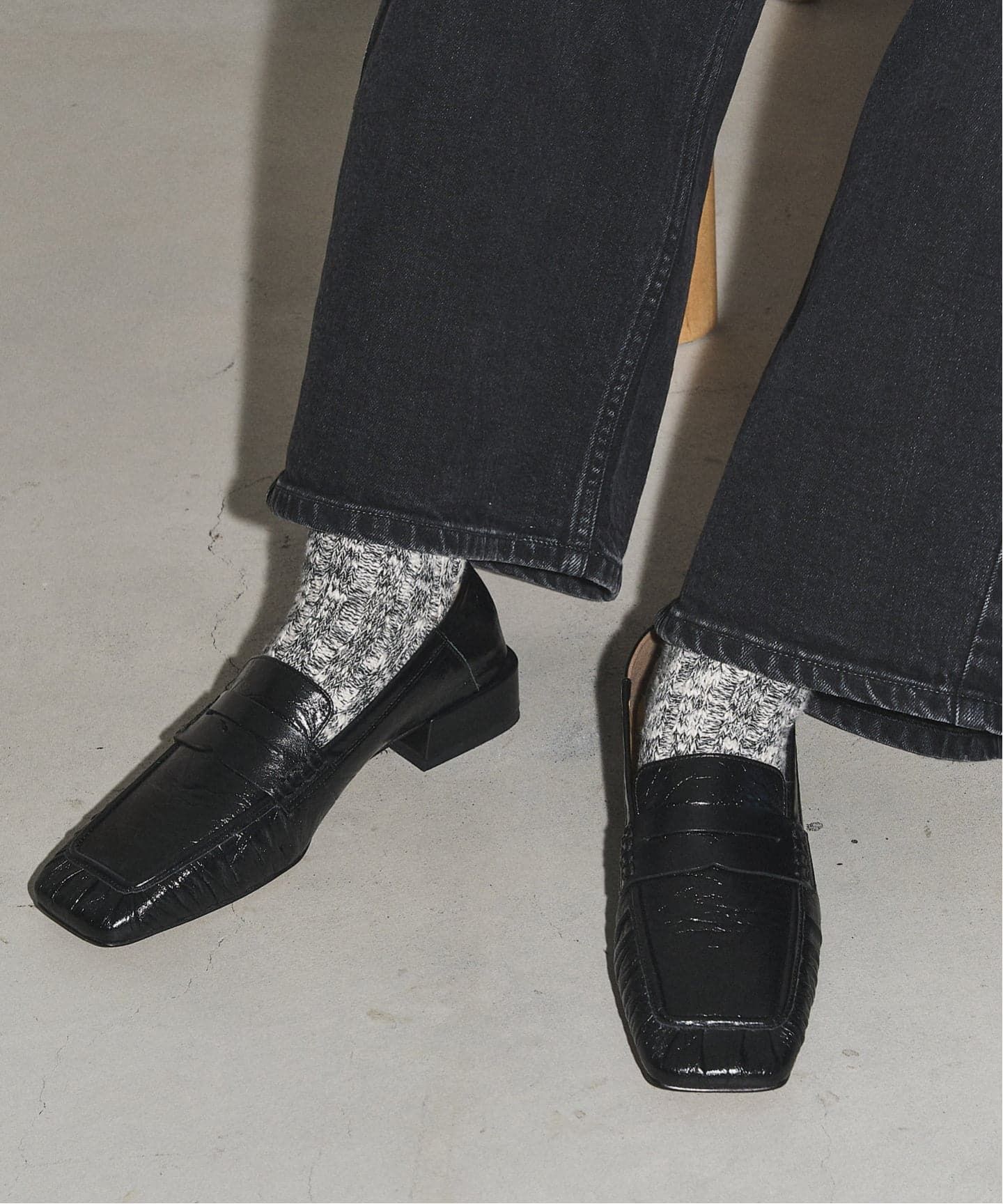 ワイドスクエアにギャザーディテールを組み合わせ、モードな中にも柔らかさを表現したローファー。踵を柔らかく仕上げバブーシュとしてもお使い頂けます。