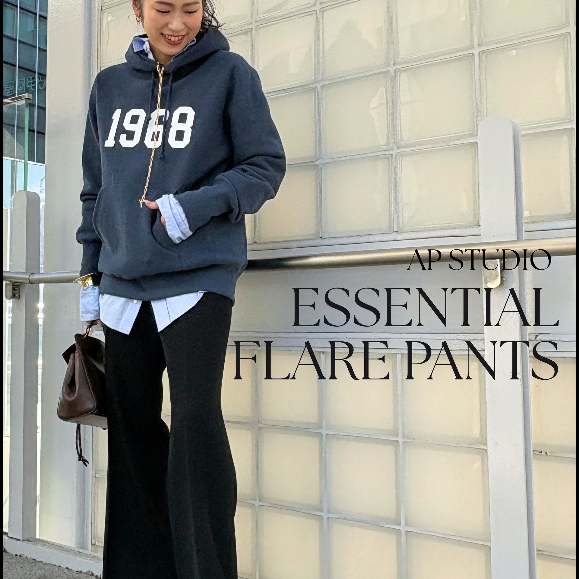 EVERYDAY I LIKE.のエッセンシャルフレアパンツは、ジャストウエストの程よいフレアシルエットが特徴です。