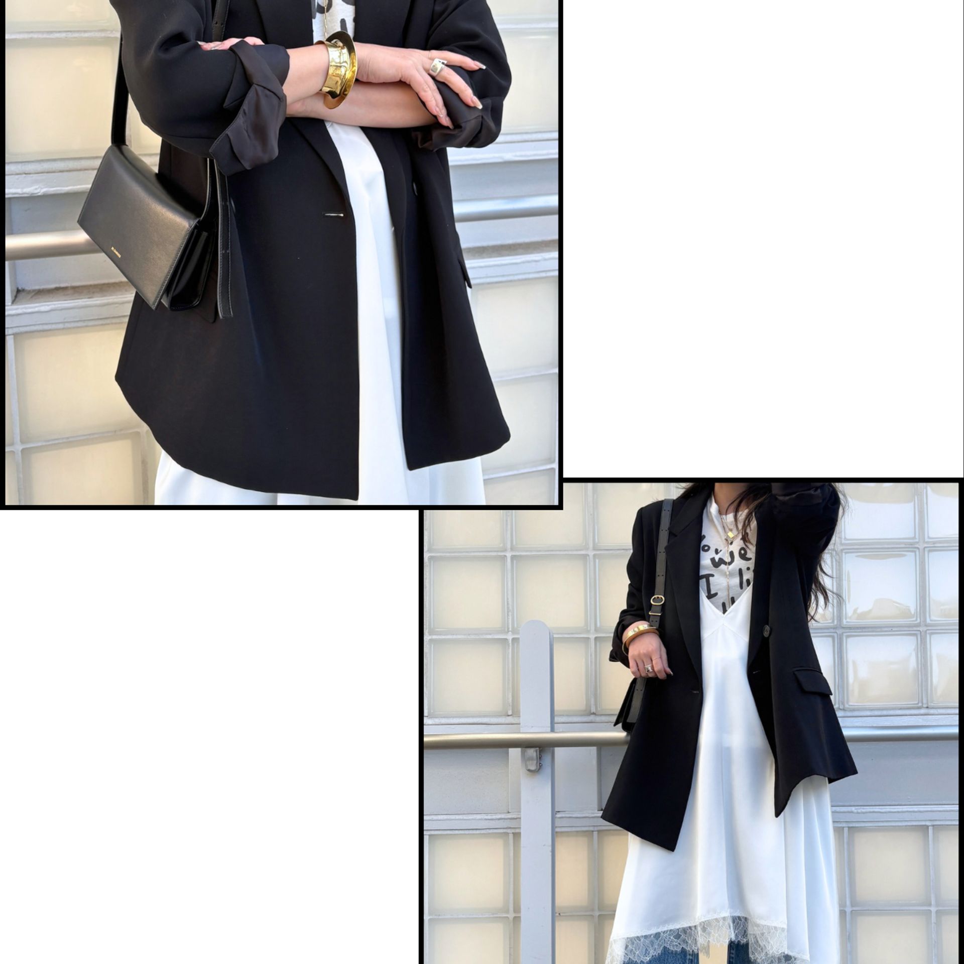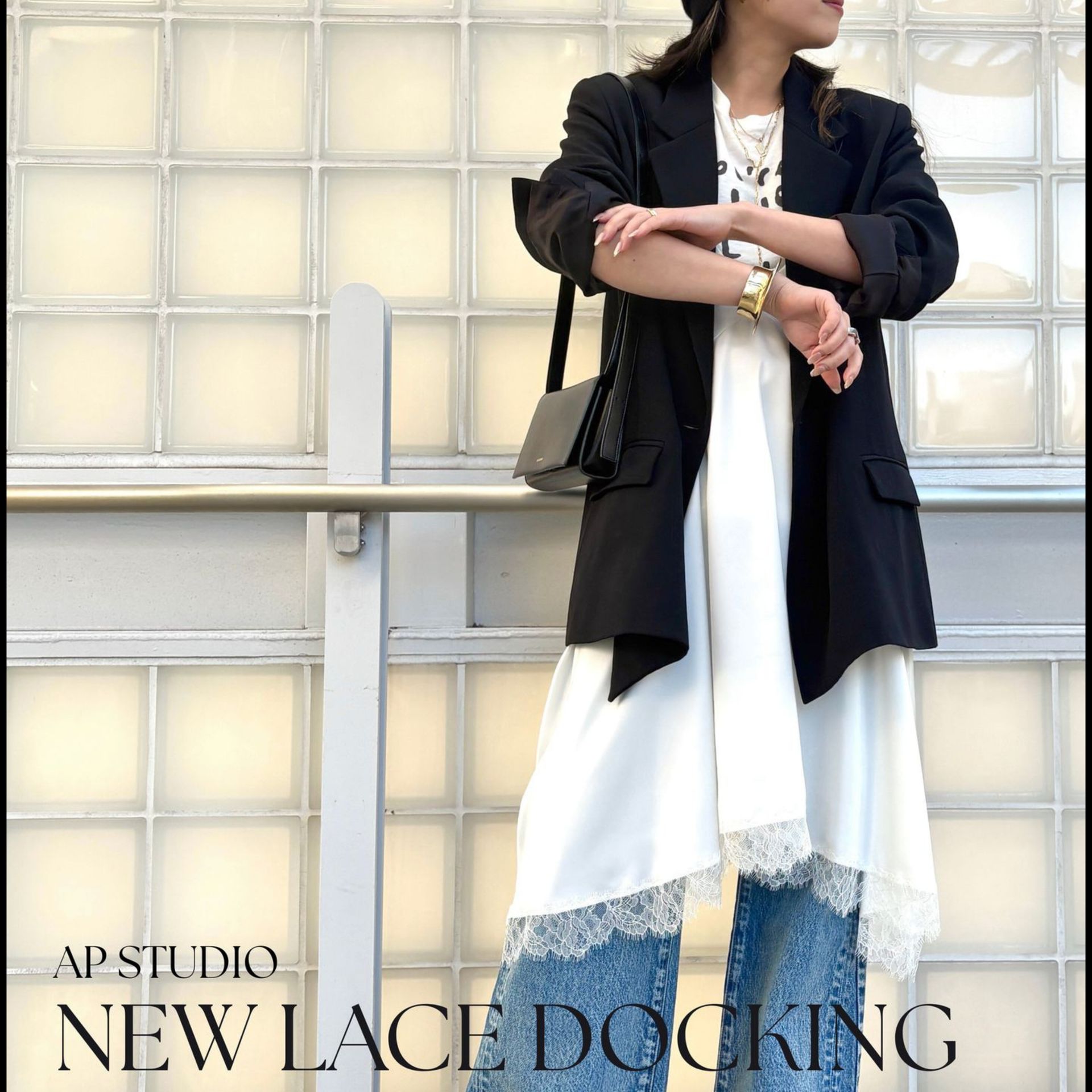 ベーシックなジャケットには、軽やかなNEWレースドッキングキャミワンピースをレイヤードして春の気分に更新。