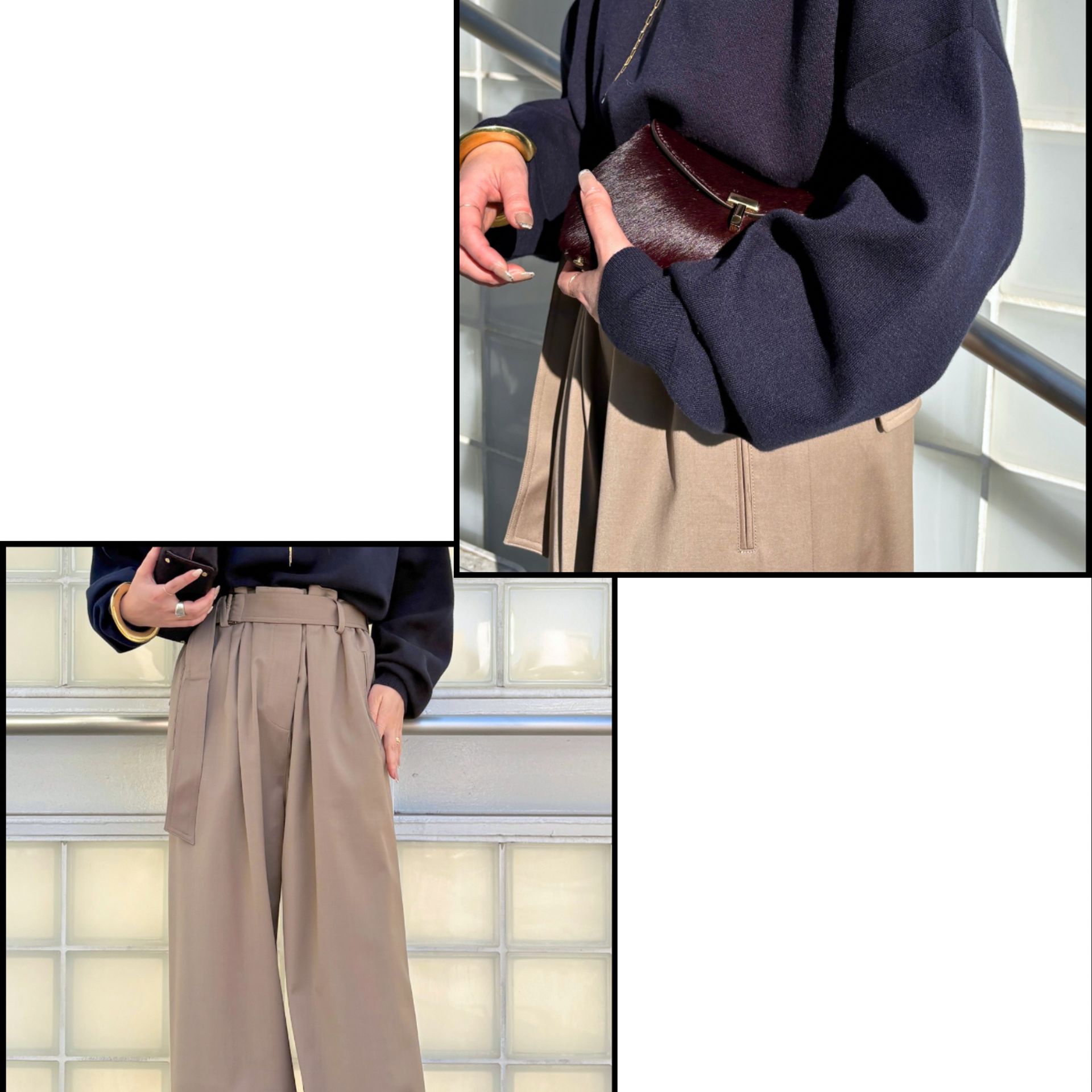 シンプルなニットには、スタイリングの主役になるデザインの効いたワイドパンツが穿きたくなります。