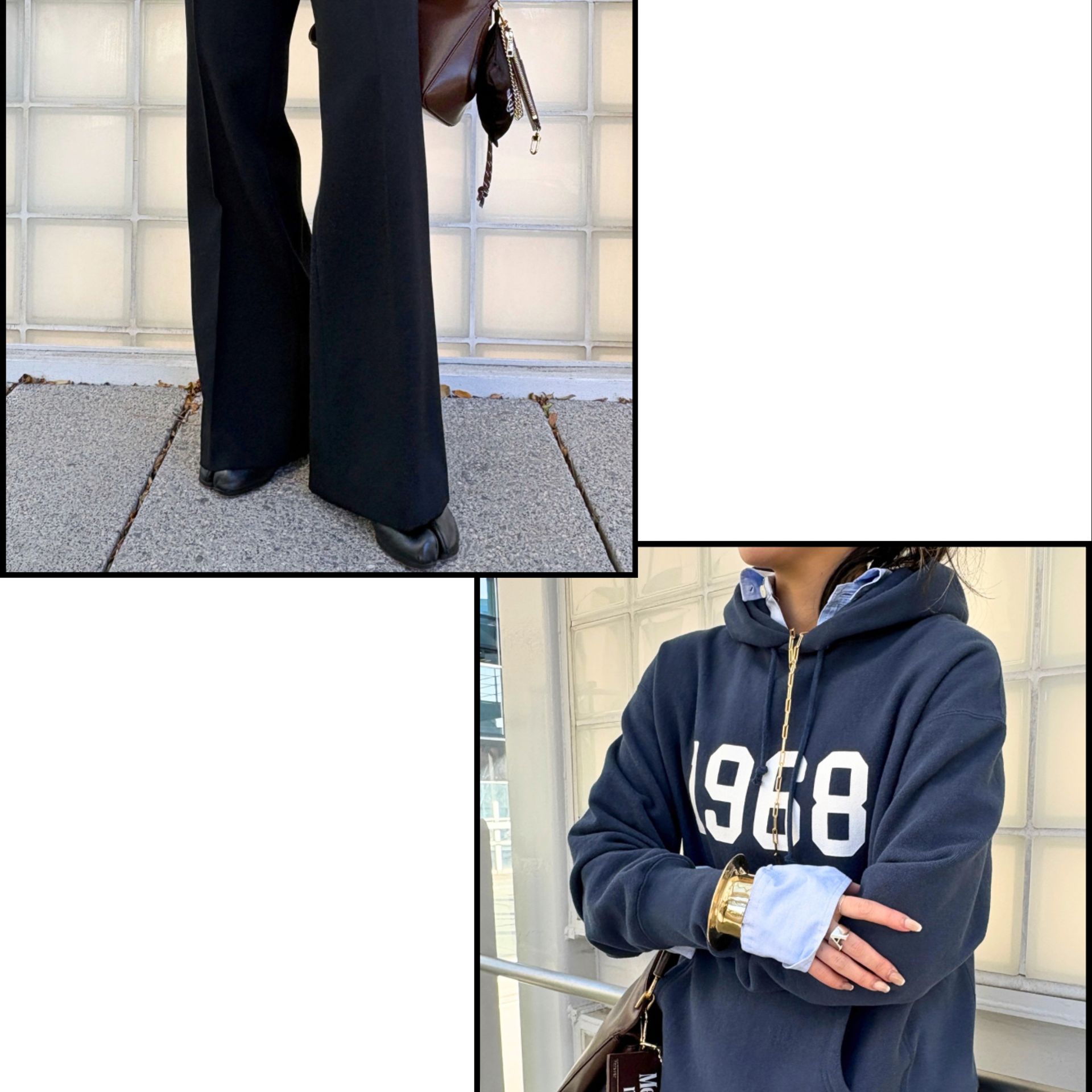 ▼ON/OFF使える定番のブラックスラックスは、気分のフーディでアップデート
