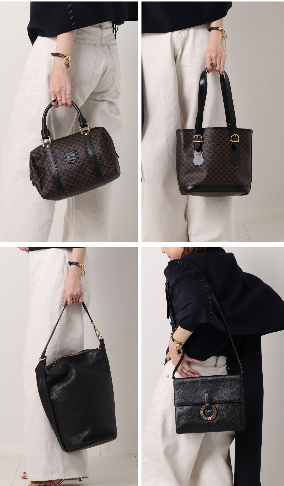VIBTAGE CELINEで軽やかにブラックを楽しむ。抜け感あるカラーのスタイルと合わせるブラックマカダム。かしこまり過ぎない、どことなくカジュアルなスタイルに綺麗に合わせるバランスが大人にはちょうどいい。よりクラシカルを感じられるレザーバッグも同時発売。