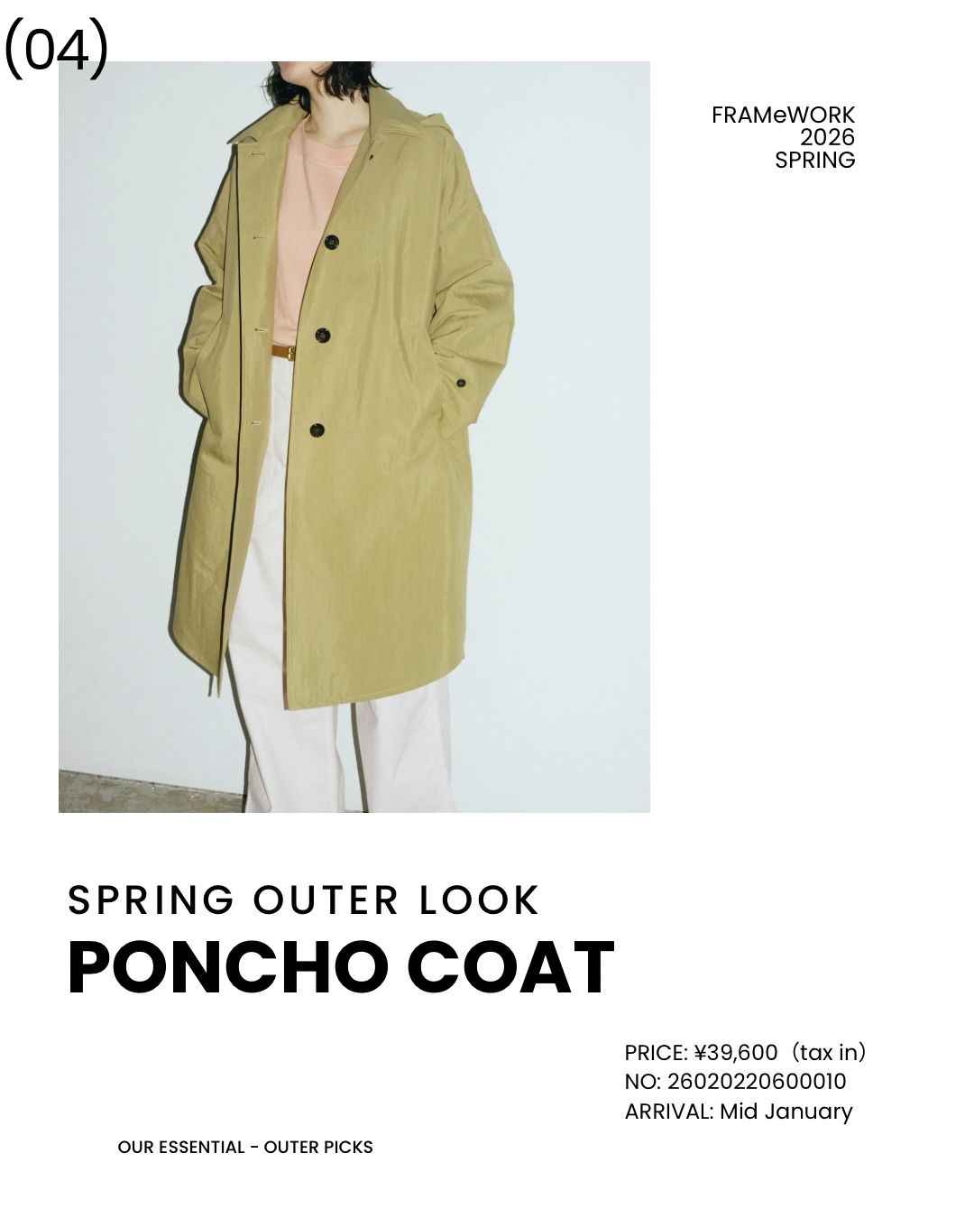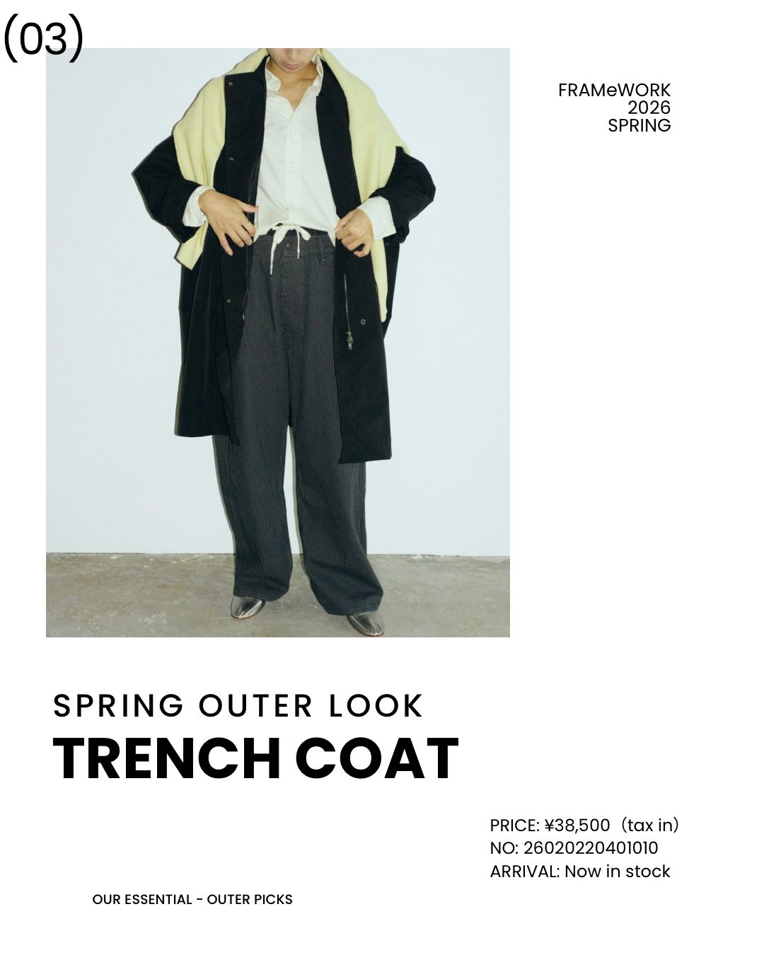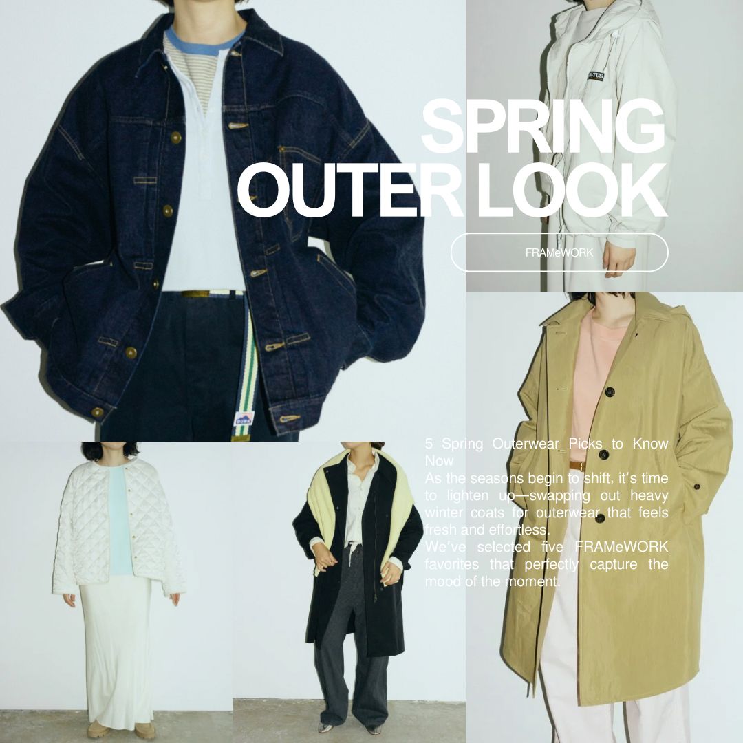 FRAMeWORK 本社 FRAMeWORK Official SPRING OUTER LOOK | 今おさえておきたい、春アウター5選 2026.01.06 𝗦𝗣𝗥𝗜𝗡𝗚 𝗢𝗨𝗧𝗘𝗥 𝗟𝗢𝗢𝗞 今おさえておきたい、春アウター5選。 重たい冬アウターから、少しずつシフトしたいこれからの時期。 いまから春まで楽しめる、FRAMeWORKいちおしのアウターをピックしました。 春の気分を取り入れたスタイリングもあわせてチェックしてみて。 FRAMeWORK ≪追加≫エクストララージデニムジャケット ネイビー | フリー ¥35,200 FRAMeWORK ≪追加≫エクストララージデニムジャケット グレーA | フリー ¥35,200 FRAMeWORK ≪追加≫エクストララージデニムジャケット ネイビー | フリー ¥35,200 TOPS / FRAMeWORK / ¥13,200(税込) FRAMeWORK マルチボーダーロンT イエロー | フリー ¥12,100 FRAMeWORK BURK 別注 ガチャベルト付きチノパン ネイビー | M ¥17,600 FRAMeWORK 2WAYキルティングショートブルゾン ナチュラル | 38 ¥31,900 FRAMeWORK 2WAYキルティングショートブルゾン ブラック | 38 ¥31,900 FRAMeWORK 2WAYキルティングショートブルゾン ナチュラル | 38 ¥31,900 FRAMeWORK SPRING-ニット ブルー A | フリー ¥18,700 FRAMeWORK ≪追加≫シルキーキュプラバイアススカート 2 ホワイト A | 38 ¥18,150 FRAMeWORK ≪追加≫撥水ポンチョトレンチコート ブラック | 38 ¥38,500 FRAMeWORK ≪追加≫撥水ポンチョトレンチコート ベージュ | 38 ¥38,500 FRAMeWORK ≪追加≫撥水ポンチョトレンチコート ブラック | 38 ¥38,500 FRAMeWORK ≪追加≫コットンレギュラーカラーシャツ イエロー B | フリー ¥12,100 FRAMeWORK ≪追加≫カノコ2WAYヘンリーニット 2 イエロー | フリー ¥15,400 FRAMeWORK PAYDAY/ペイデイ 別注レイヤードヒッコリーパンツ ブラック D | 38 ¥25,300 FRAMeWORK ポンチョコート ベージュ | 38 ¥39,600 FRAMeWORK ポンチョコート ネイビー | 38 ¥39,600 FRAMeWORK ポンチョコート ベージュ | 38 ¥39,600 FRAMeWORK リヨセルコットンボートネックSWEAT ピンク B | フリー ¥14,300 FRAMeWORK ライトミリタリースラブベイカーパンツ ピンク A | 38 ¥22,000 FRAMeWORK ≪追加≫ALTUS/アルタス 別注W ZIPマウンテンパーカー ホワイト | フリー ¥25,300 FRAMeWORK ≪追加≫ALTUS/アルタス 別注W ZIPマウンテンパーカー ブラック D | フリー ¥25,300 FRAMeWORK ≪追加≫ALTUS/アルタス 別注W ZIPマウンテンパーカー ブラウン C | フリー ¥25,300 FRAMeWORK ≪追加≫ALTUS/アルタス 別注W ZIPマウンテンパーカー ホワイト | フリー ¥25,300 TOPS / FRAMeWORK / ¥14,300(税込) SKIRT / FRAMeWORK / ¥15,400(税込)
