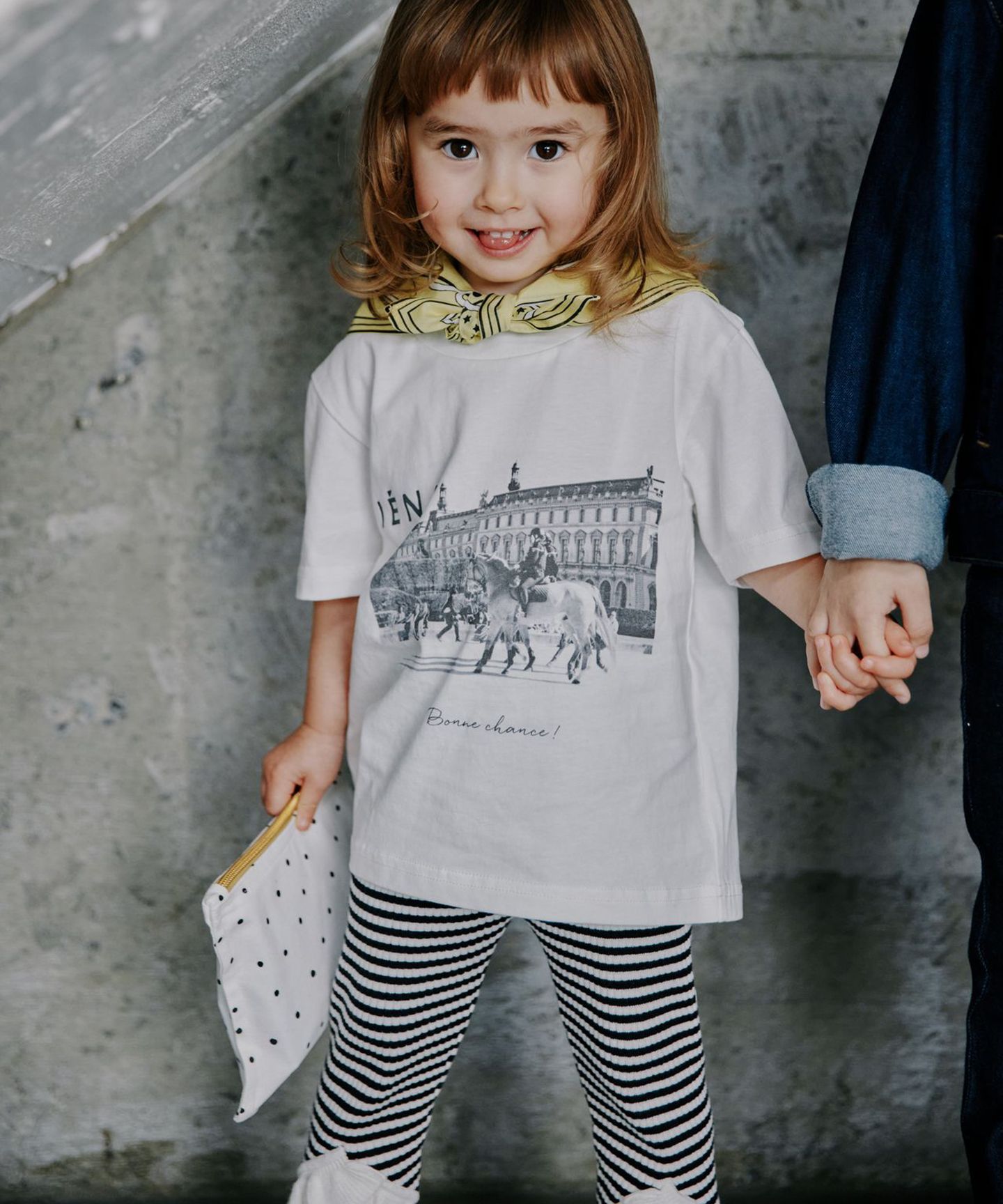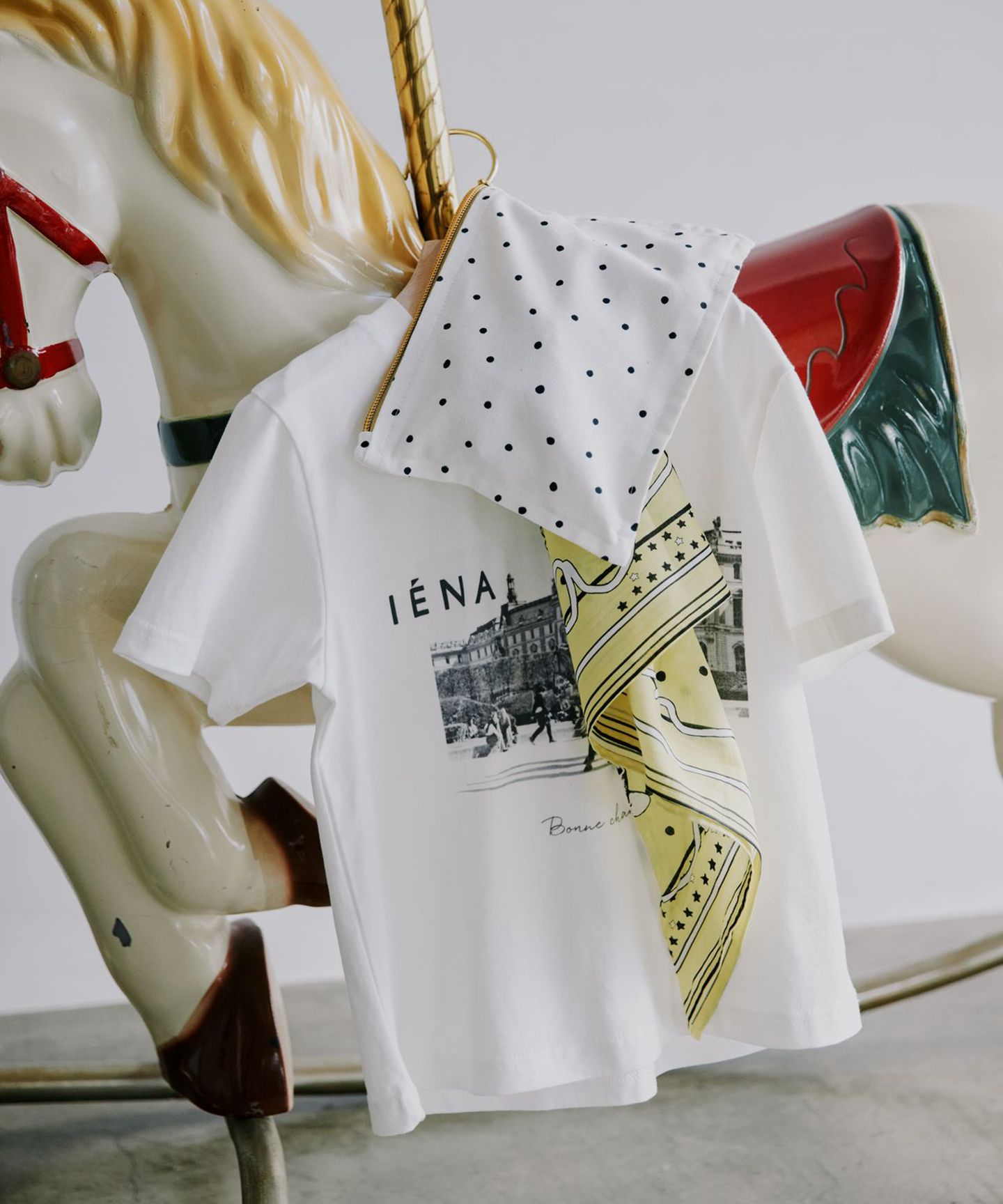 干支“馬”をモチーフにしたプリントTシャツ、デザイナーが一から描き下ろしたアートバンダナ、そしてIENA ENFANTのアイコンである手書き風ドット柄のマルチポーチを組み合わせました。