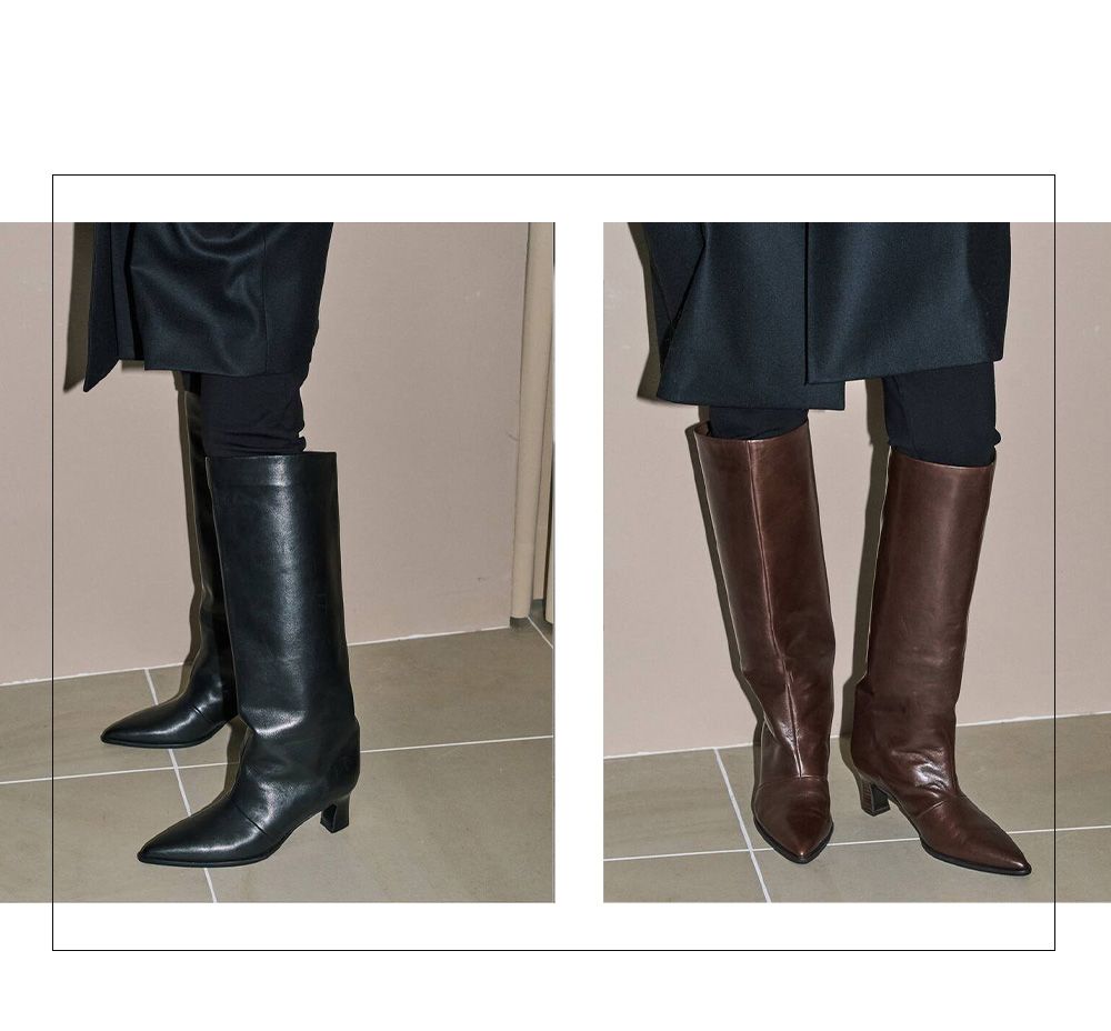 甲から立ち上がるストレートなシルエットと、後ろ下がりのトップラインでスタイルアップできるロングブーツ。