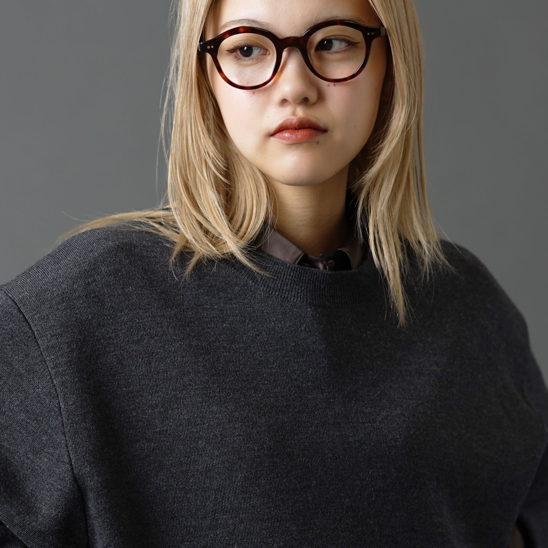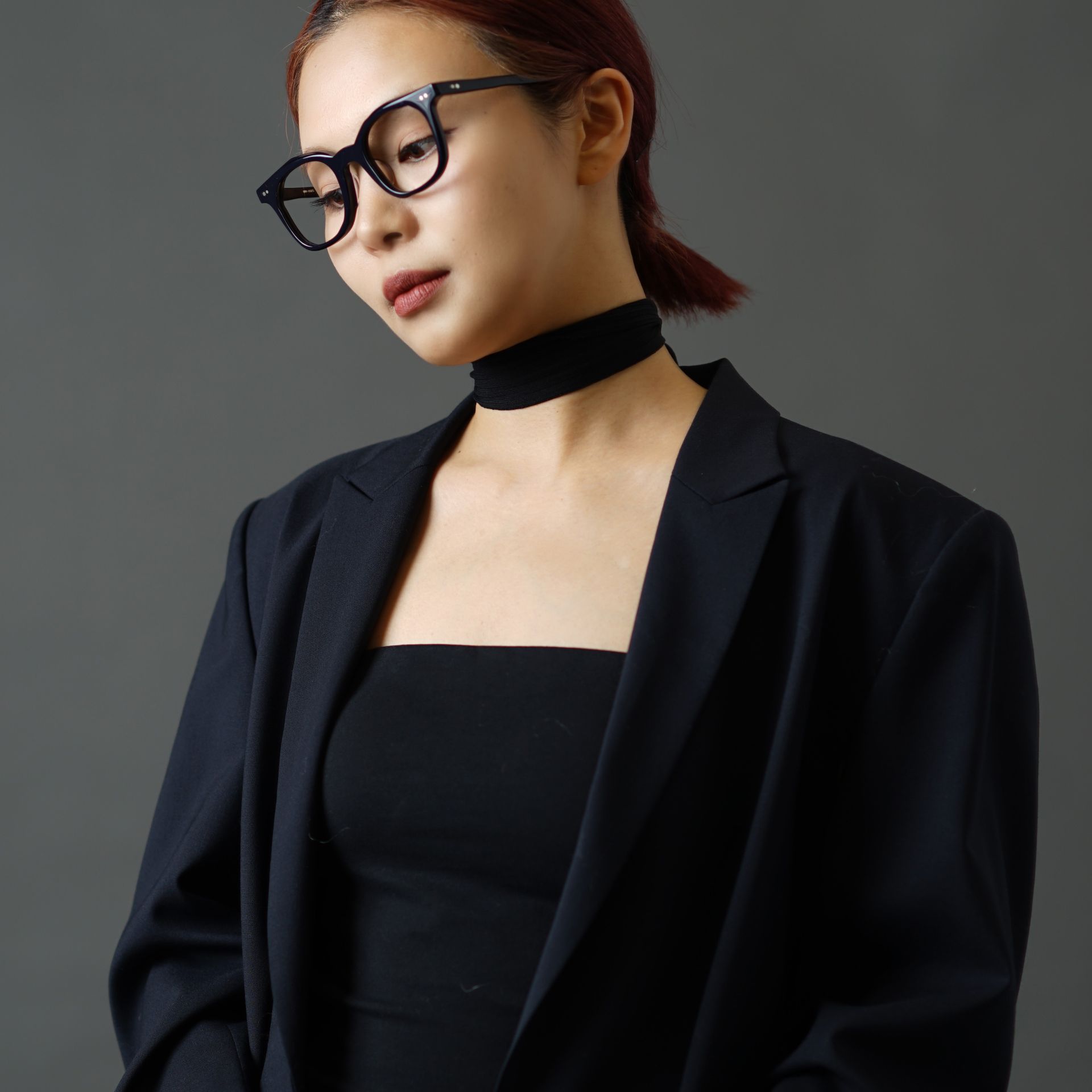 ラウンド型のフレームシェイプは、クラシックな印象になりすぎないように、セットアップで全体的に女性らしい印象にしています。