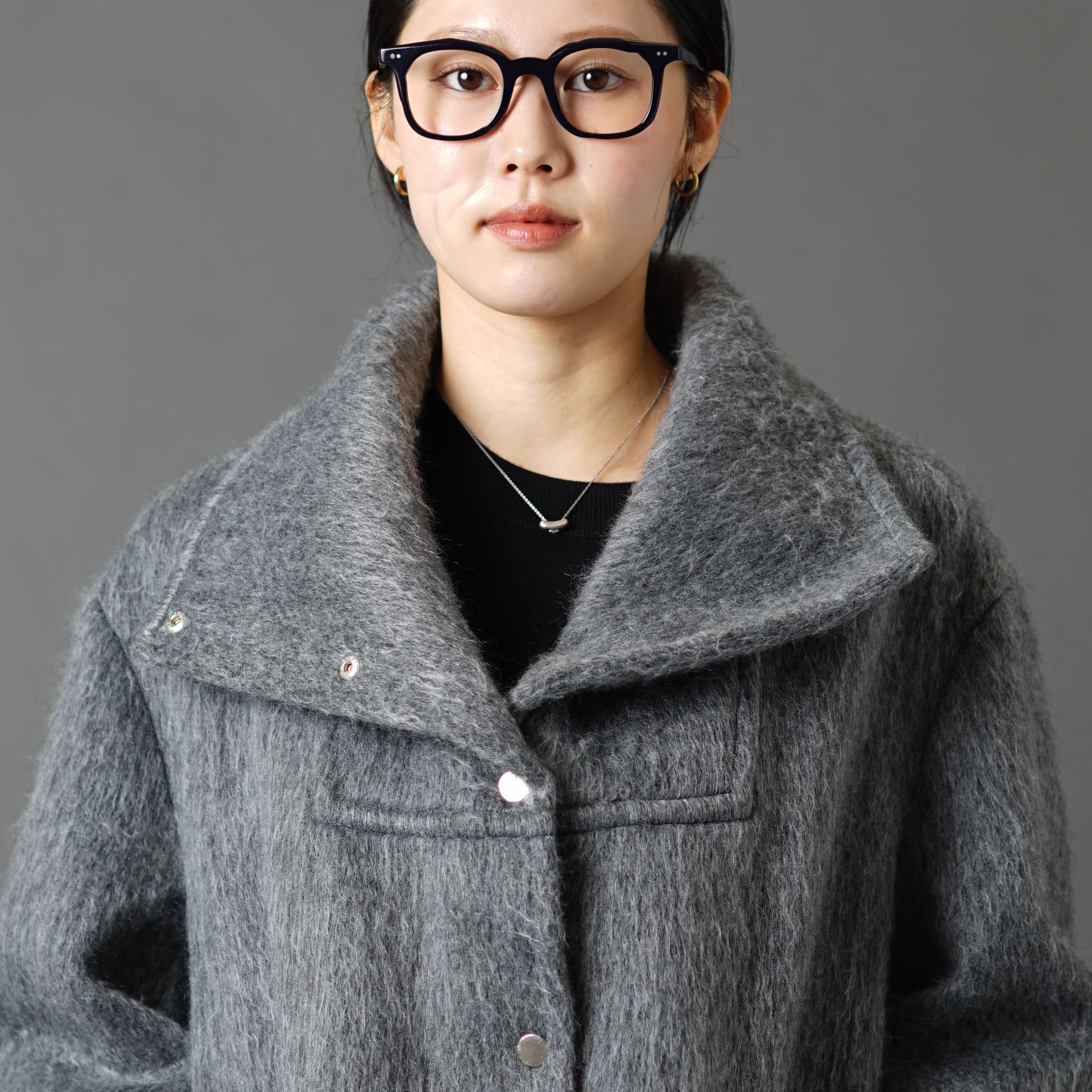 スクエアベースでキリッとした印象を与えてくれるフレームは、起毛感のあるオーバーサイズアウターとレギンスの組み合わせで女性らしさを。