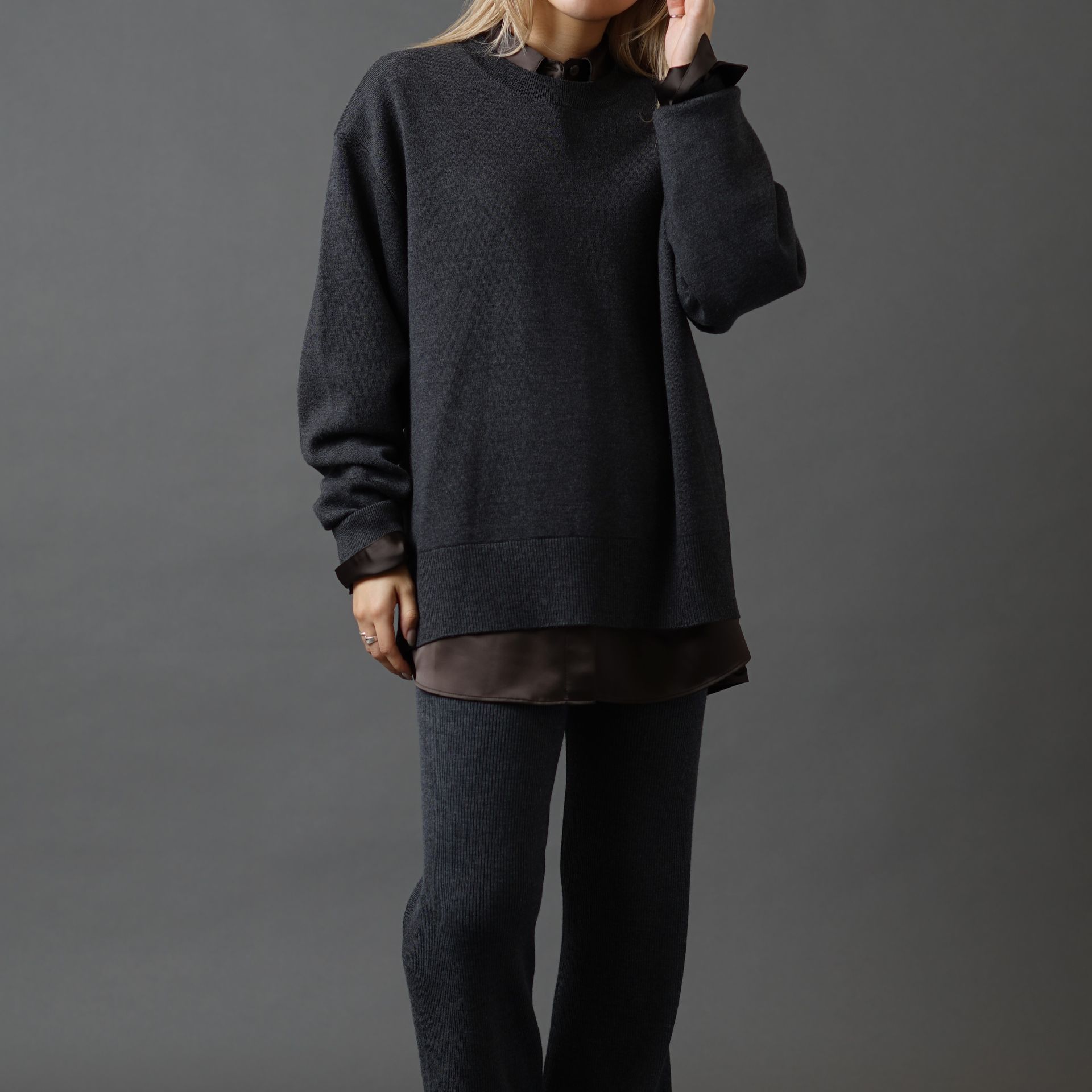 インナーの艶のあるシャツは眼鏡と同色のブラウンで合わせ、統一感のありながらも上品で洗練されたスタイリングにしました。
