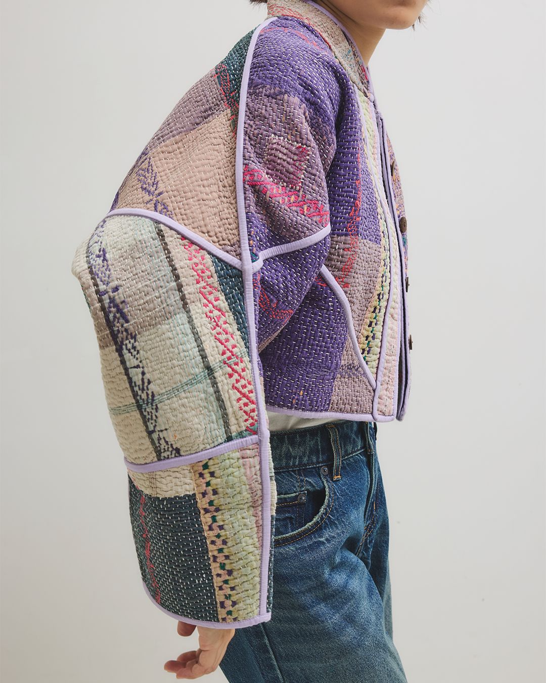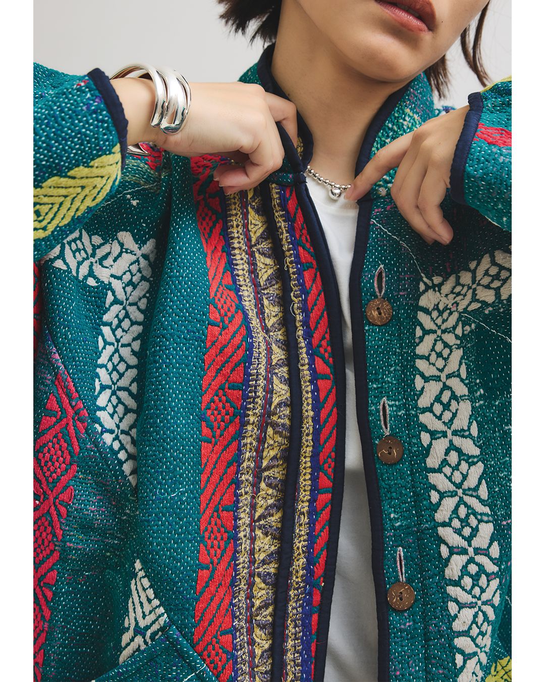 インドのアンティークのテキスタイル「カンタキルト」を再利用し、季節を問わず一年中身につけられる、唯一無二の服を生み出しています。