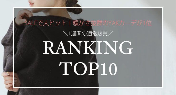 抜群の暖かさと可愛さを備えるYAKのカーディガンやスタイリングにさり気ない華やかさを添えるジップスカートなど、SALEと通常売りのアイテムをミックスしてRANKINGにてご紹介!