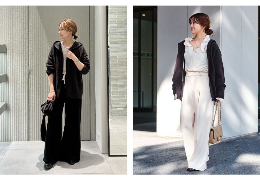 フードでカジュアルダウンさせつつもガウン風のデザインで、大人っぽくキレイめに決まるのが魅力。