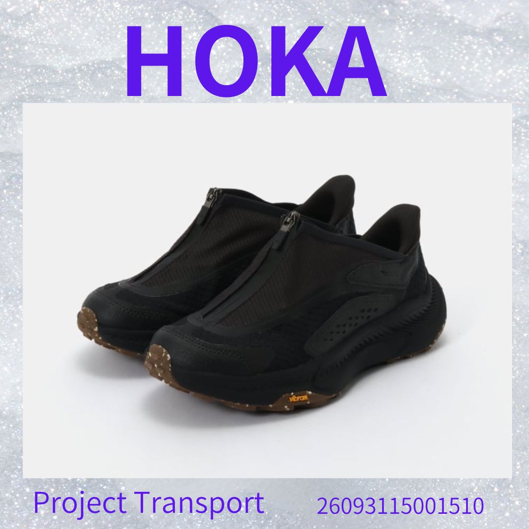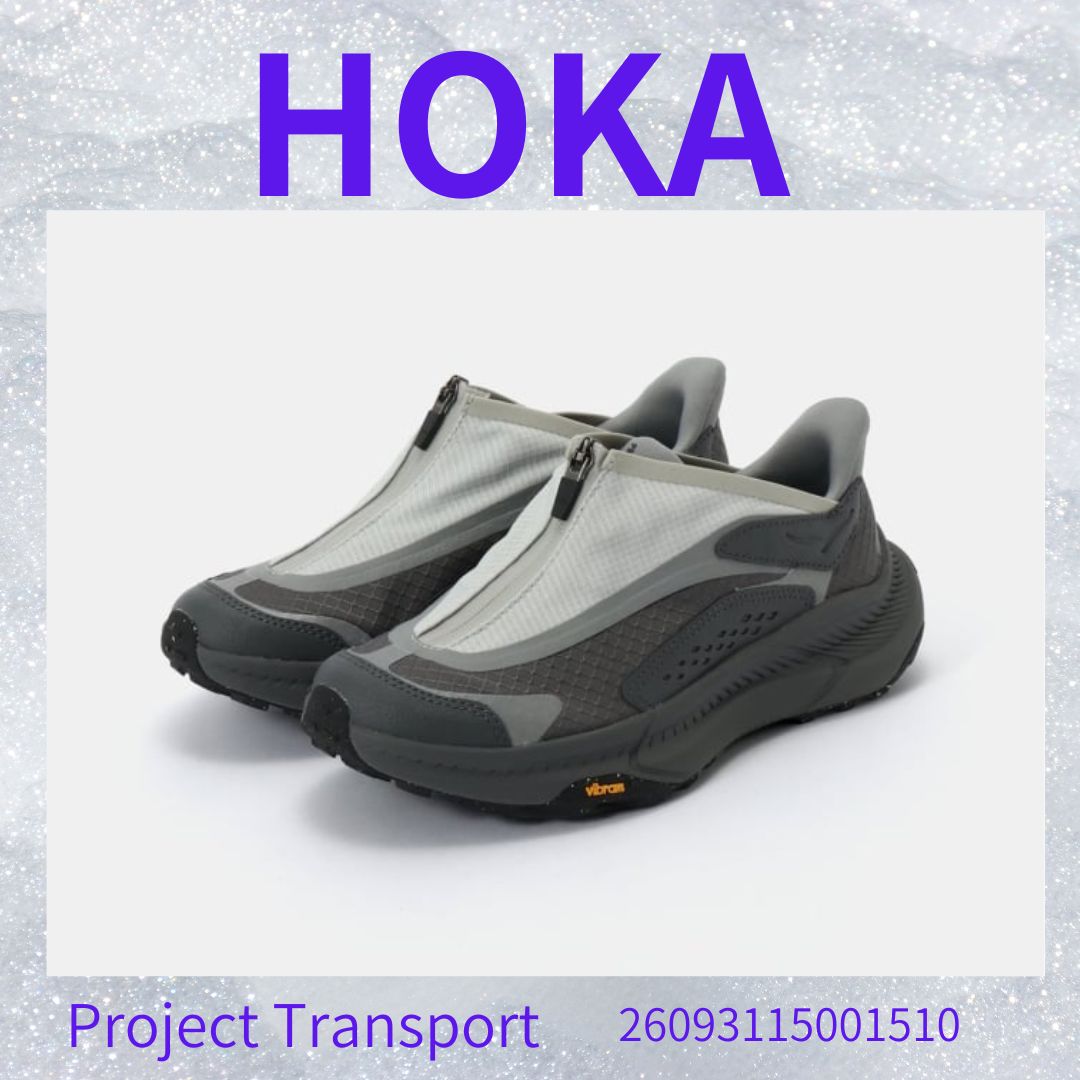 「PROJECT TRANSPORT(プロジェクト トランスポート)」は、HOKAならではの快適なクッション性とサポート力に、テック感とモードなデザインを融合させたアーバンアウトドアラインのスニーカーです。ジッパー式のシュラウド(カバー)の下にドローコードで調整できるクイックレースシステムが隠されており、リップストップ生地とシンセティック素材のアッパー、そしてグリップ力と耐久性に優れたVibram®(ビブラム)アウトソールが特徴で、街履きからアクティブなシーンまで幅広く対応します。
