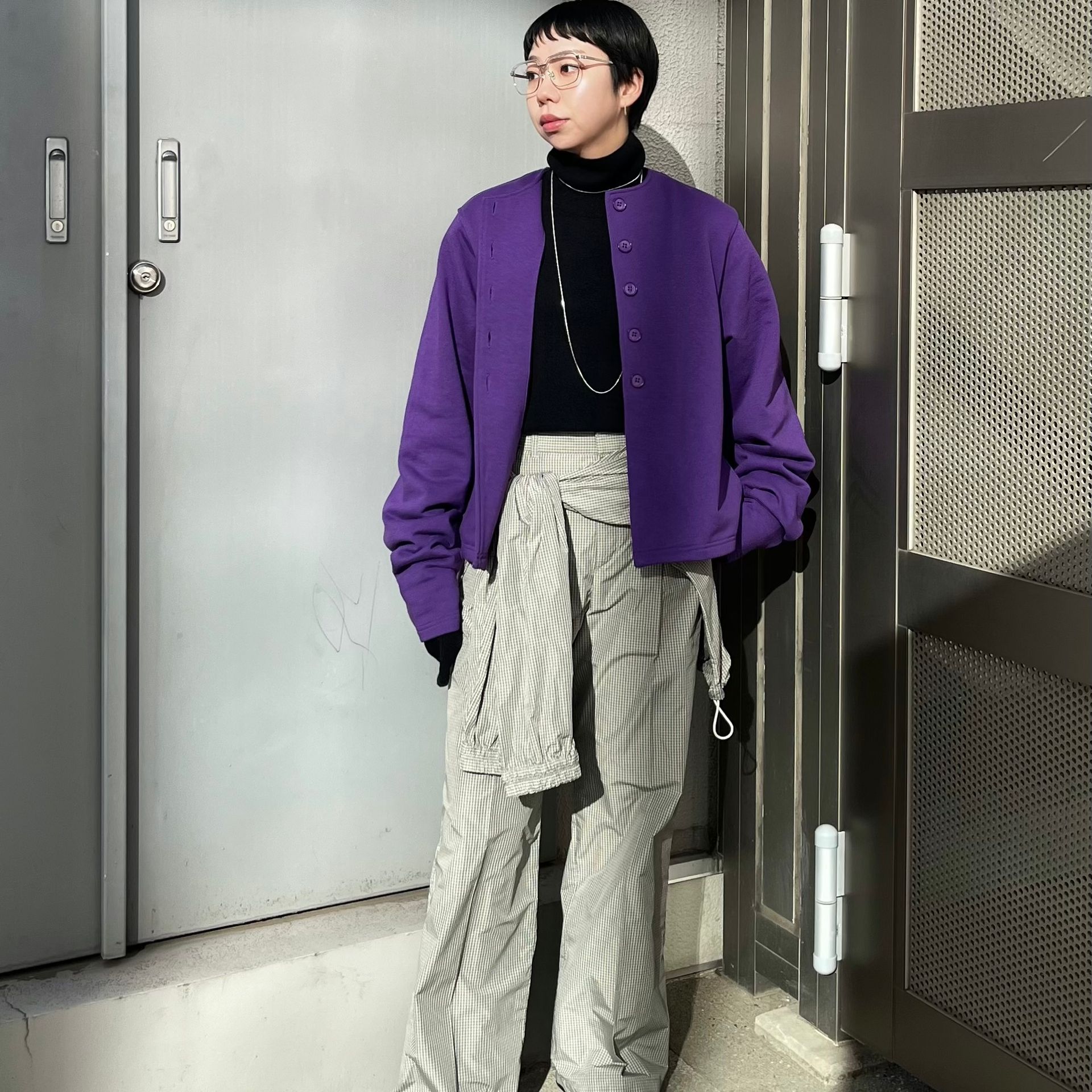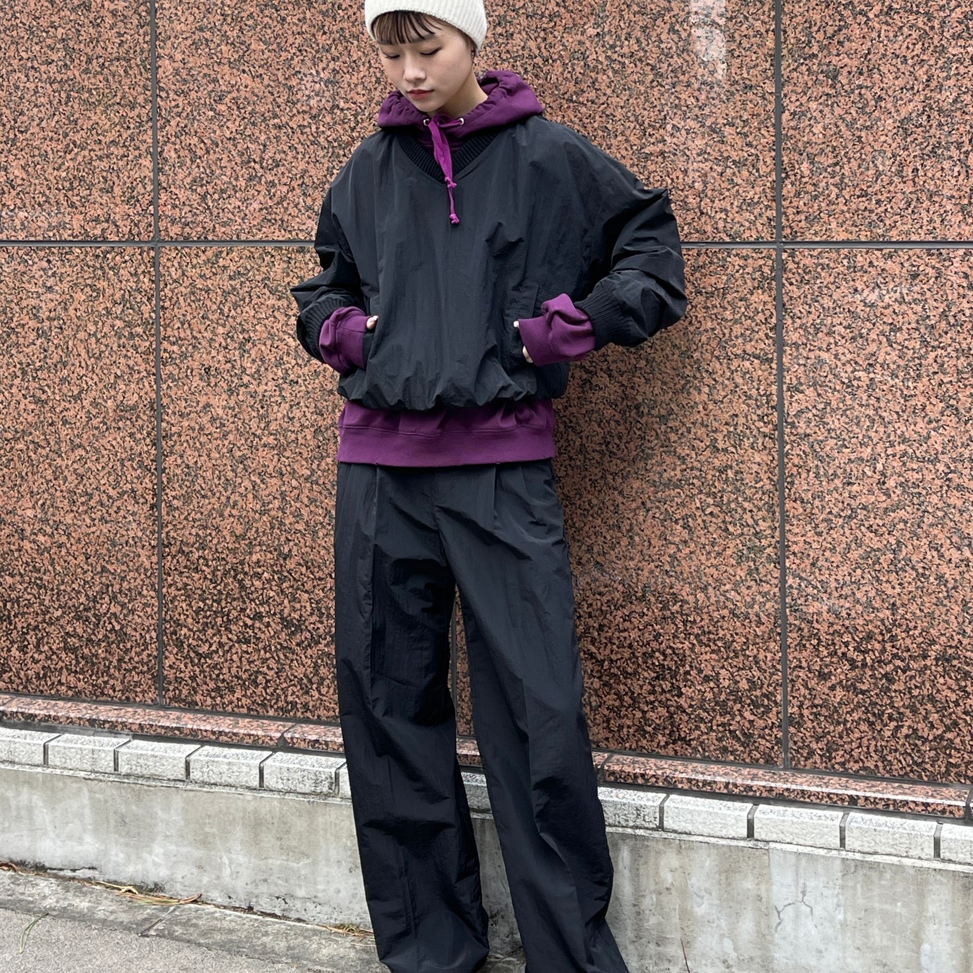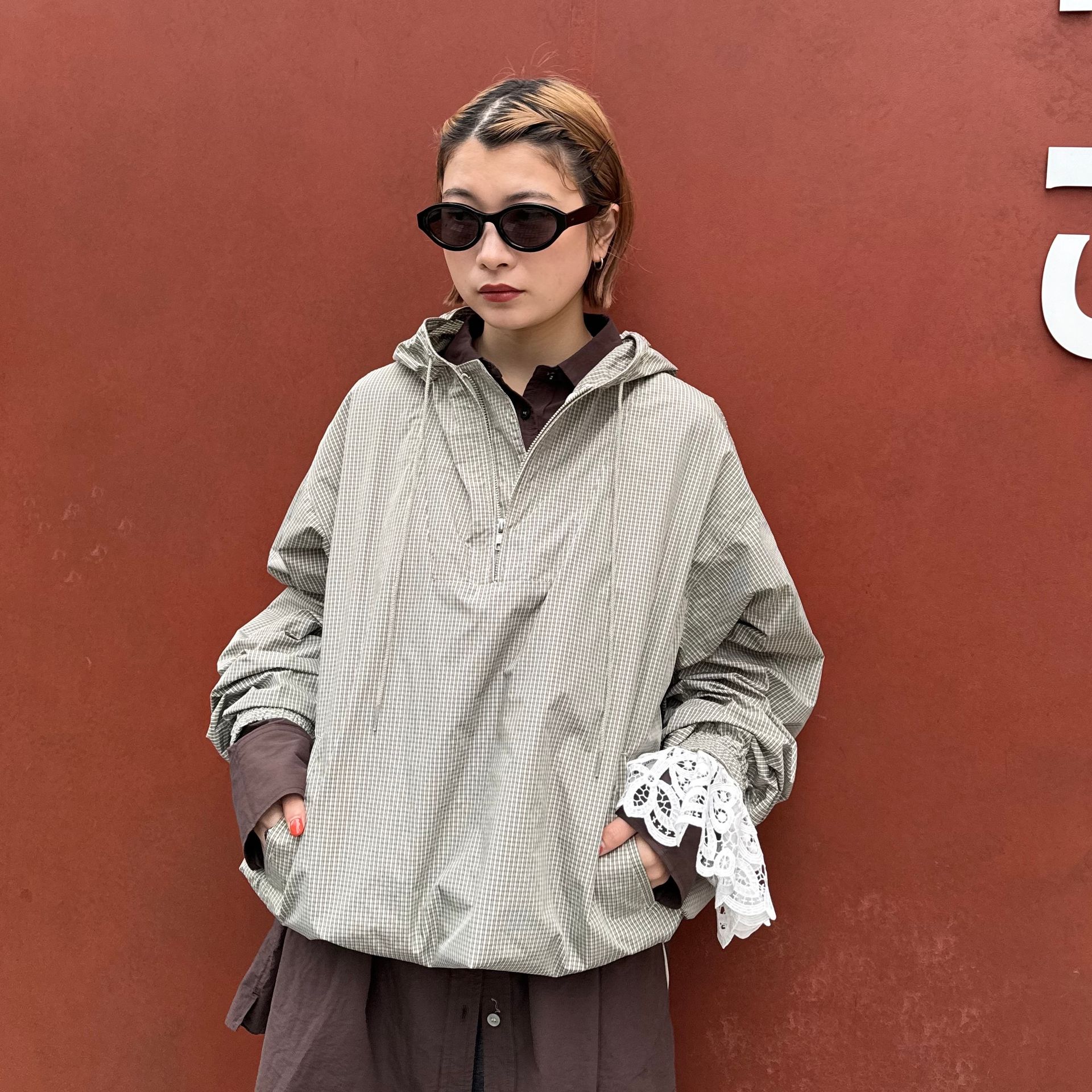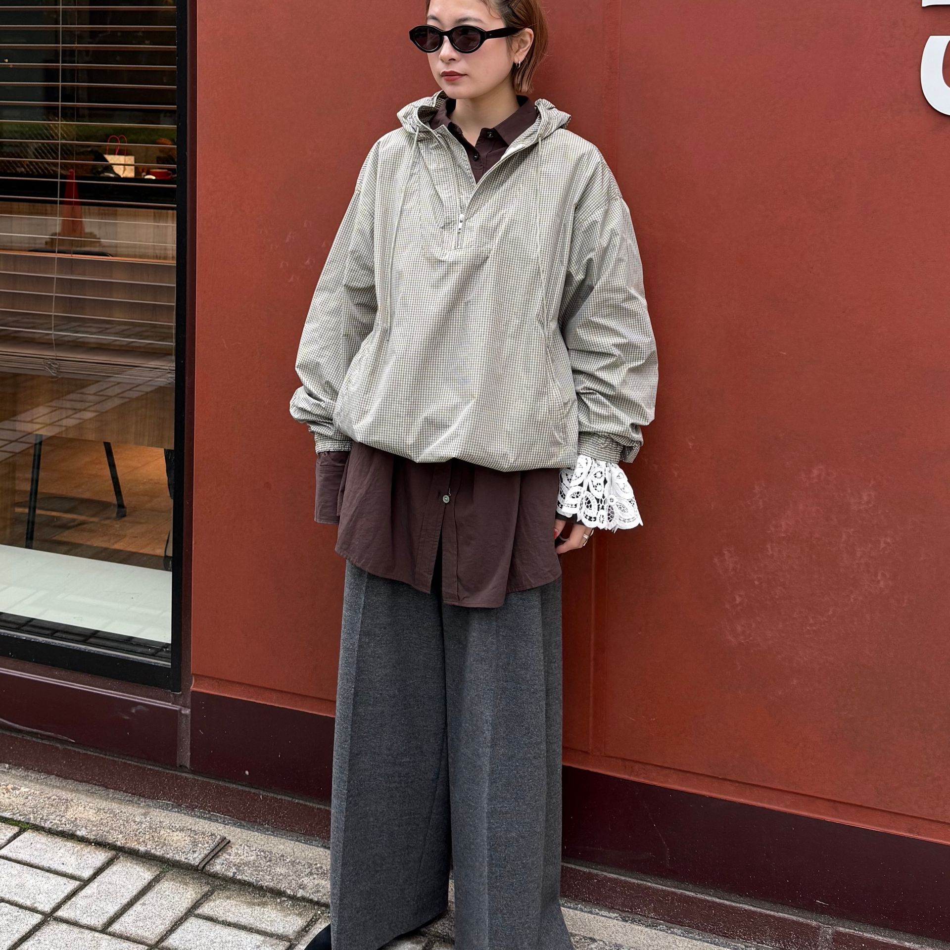 チェックの配色に対して、補色のパープルを合わせて色で遊んでみました!同じ柄のアノラックを腰巻きにすることでパンツの印象が変わるので絶対で上下セットで買うのがおすすめです!!