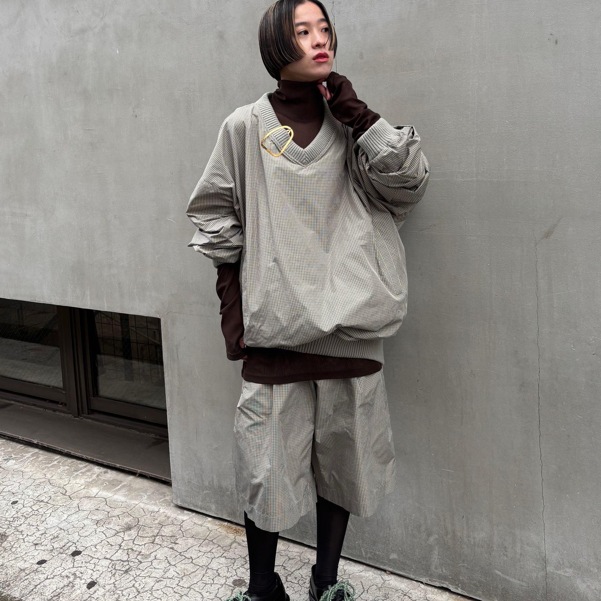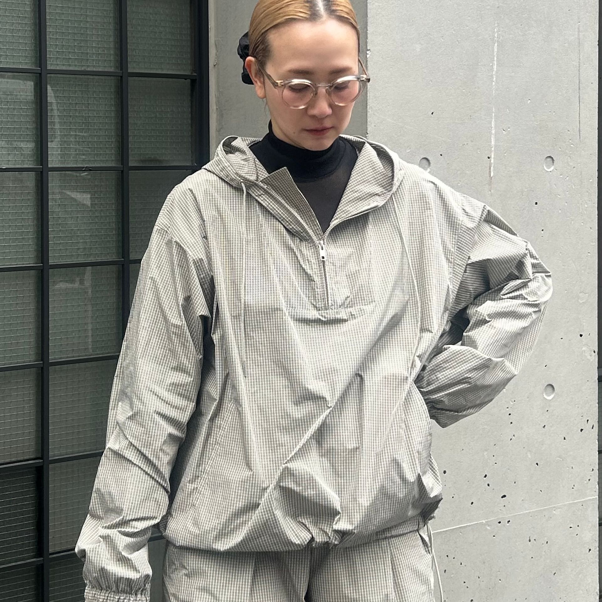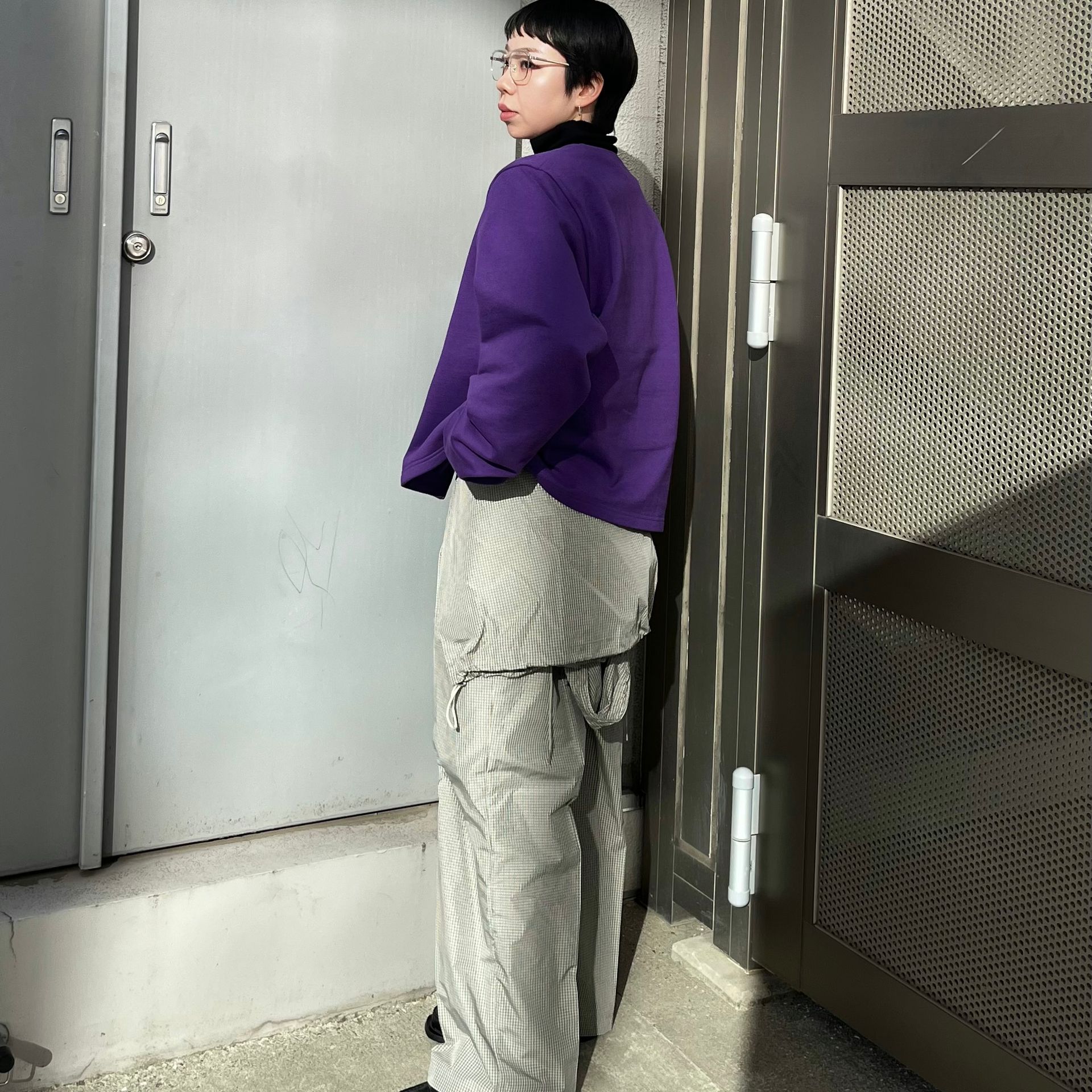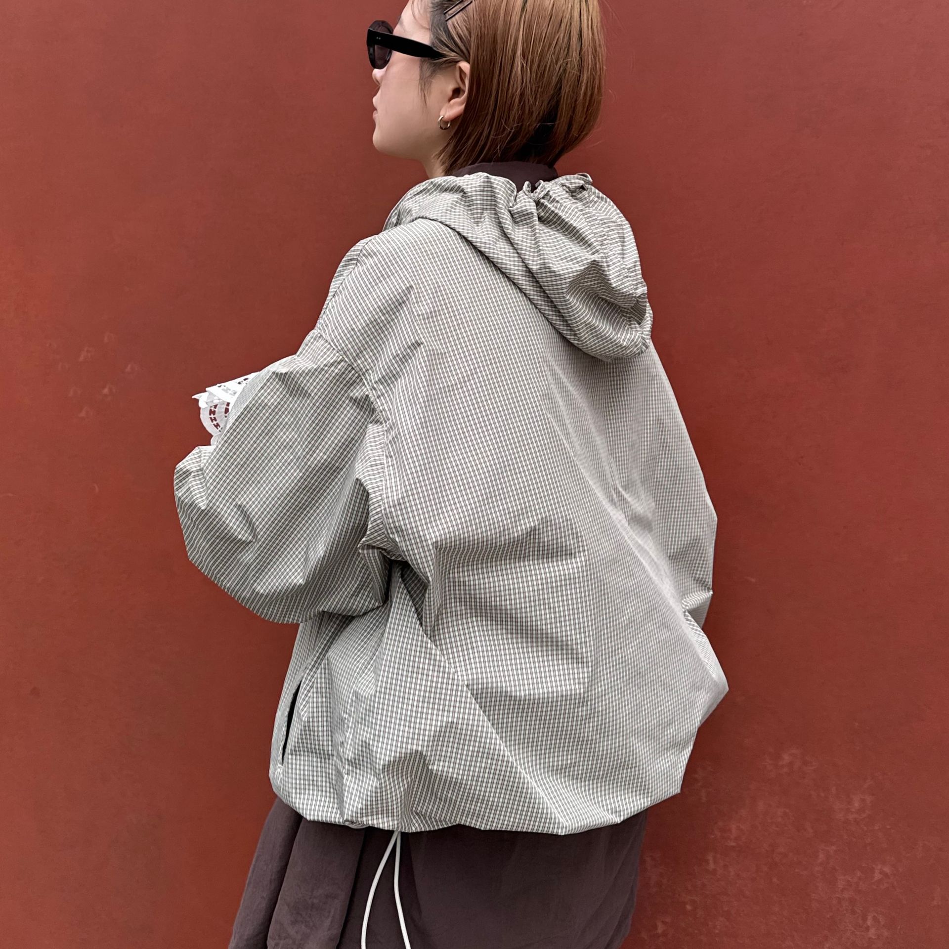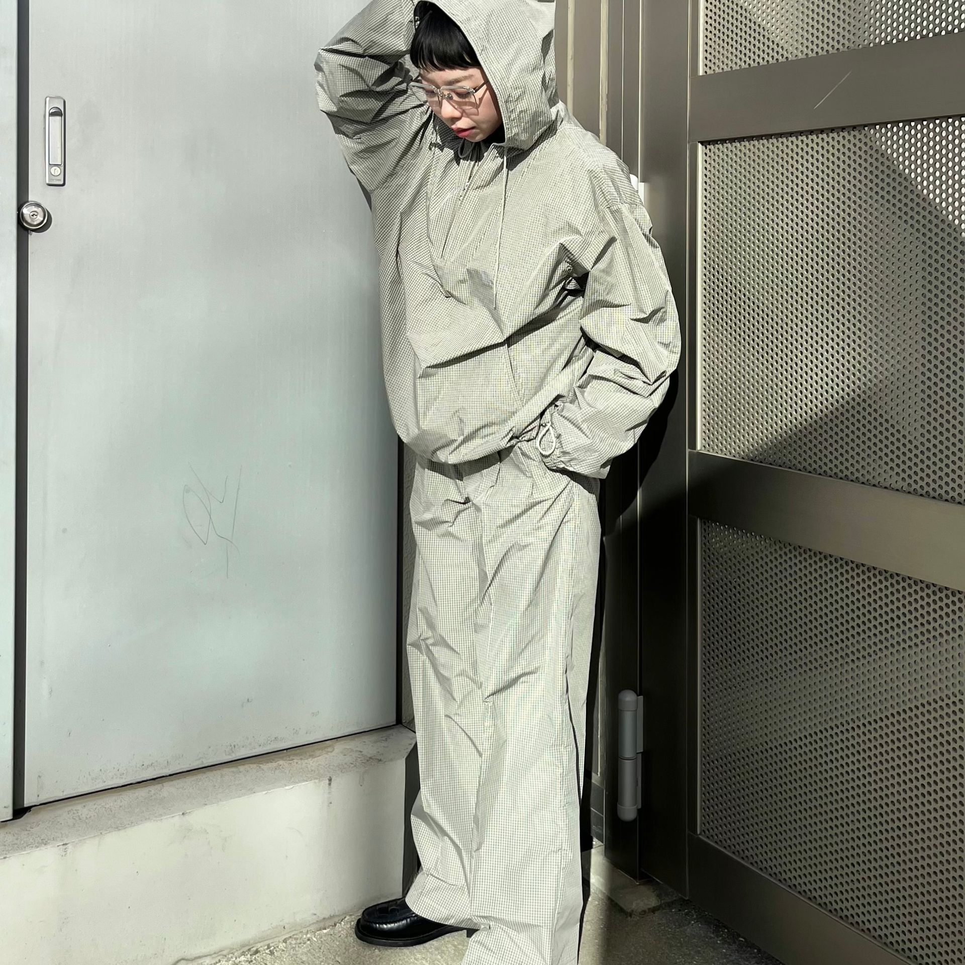 チェックの配色に対して、補色のパープルを合わせて色で遊んでみました!同じ柄のアノラックを腰巻きにすることでパンツの印象が変わるので絶対で上下セットで買うのがおすすめです!!