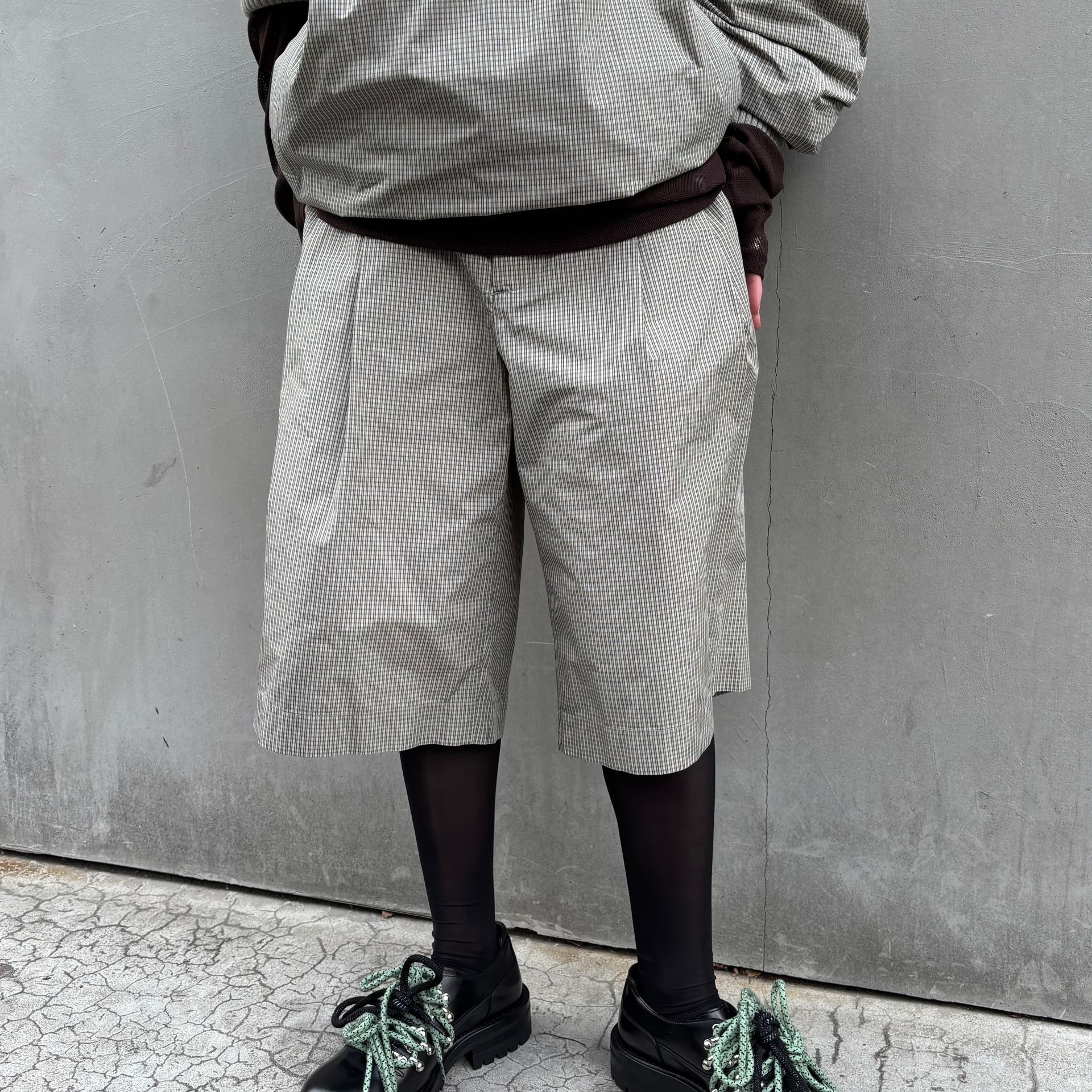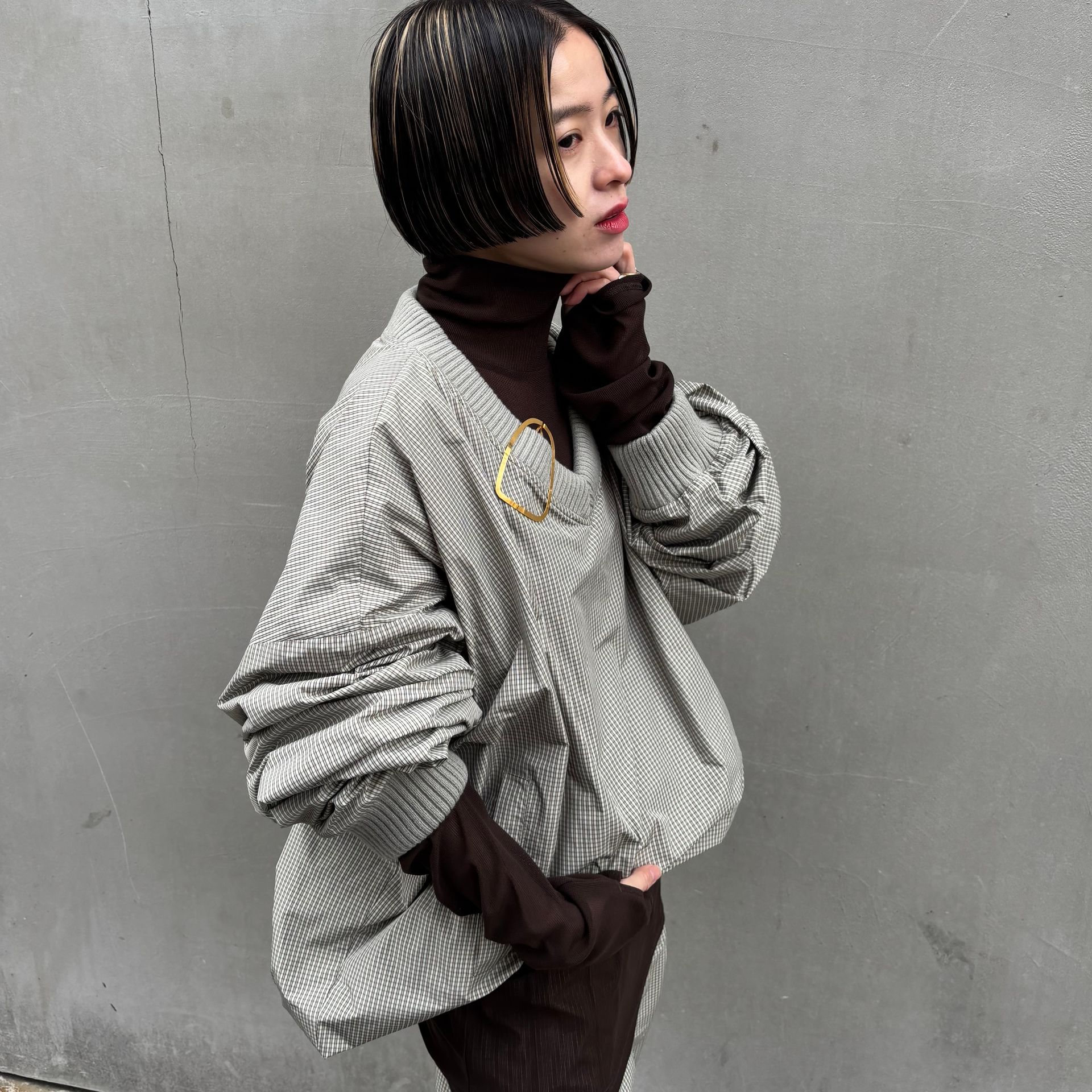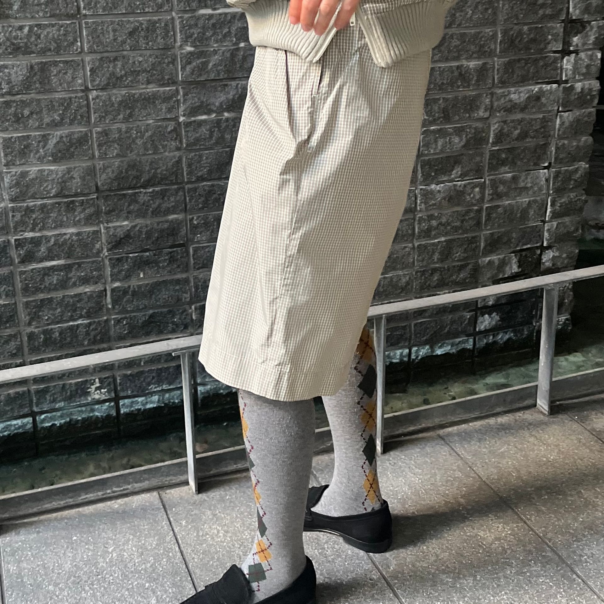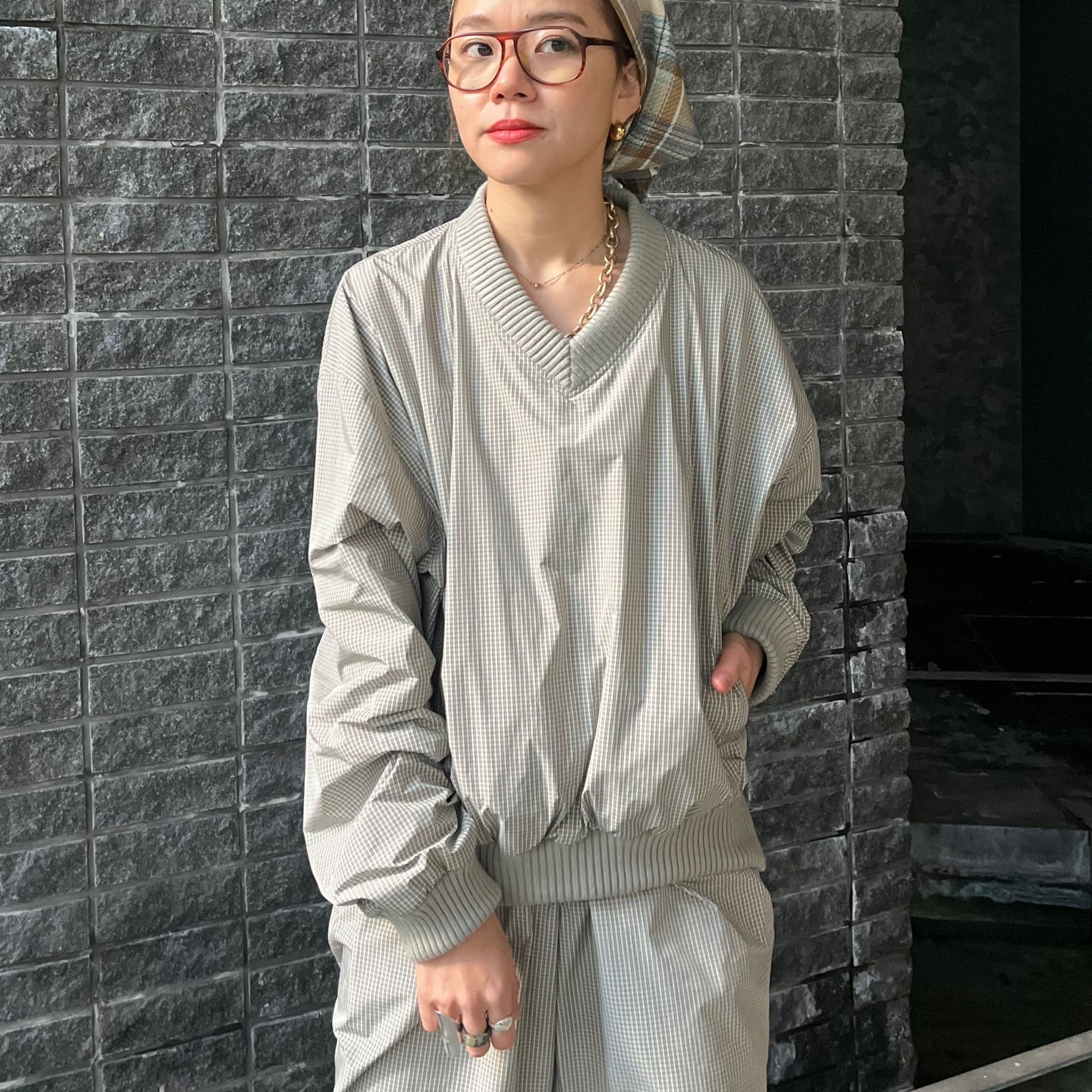 チェックの配色に対して、補色のパープルを合わせて色で遊んでみました!同じ柄のアノラックを腰巻きにすることでパンツの印象が変わるので絶対で上下セットで買うのがおすすめです!!