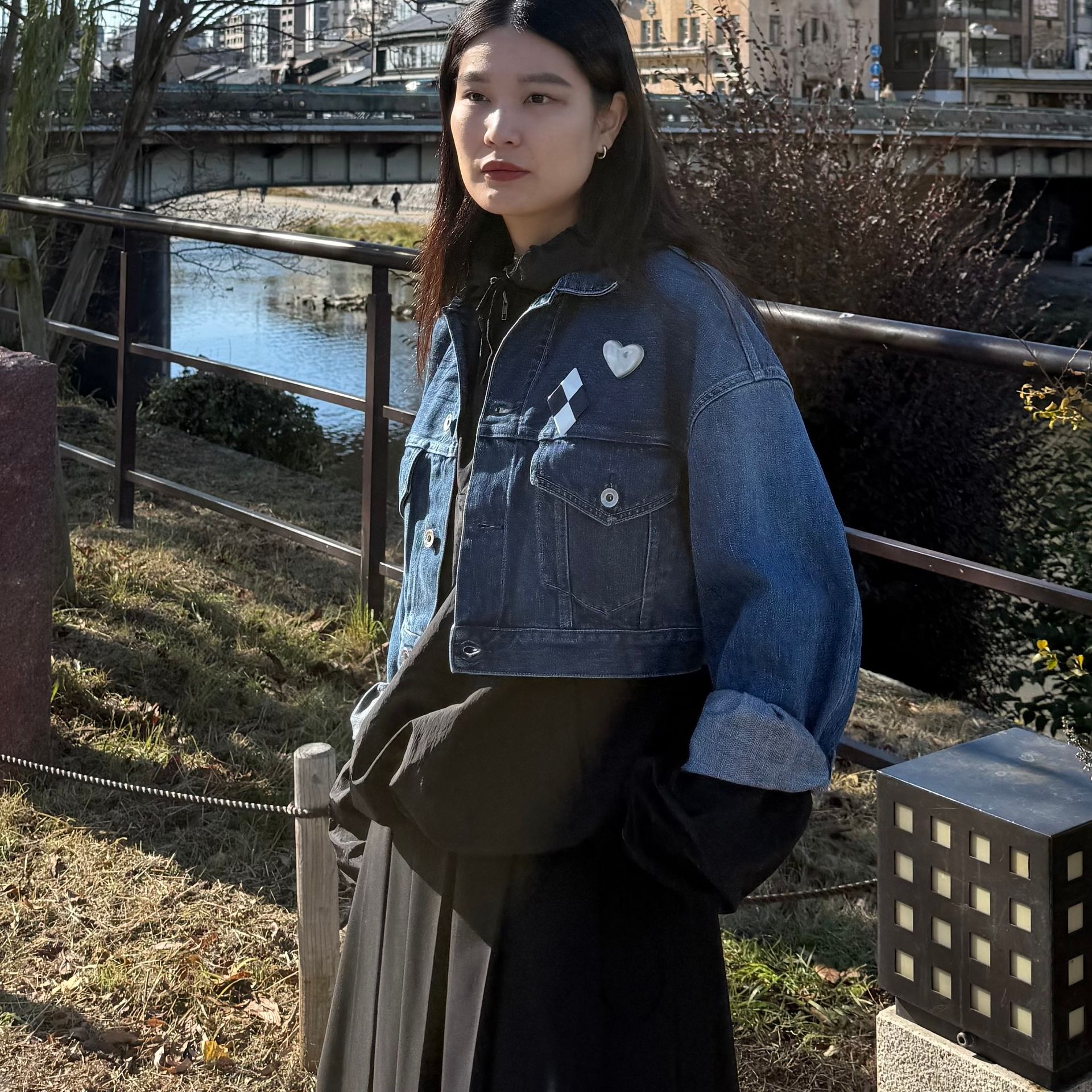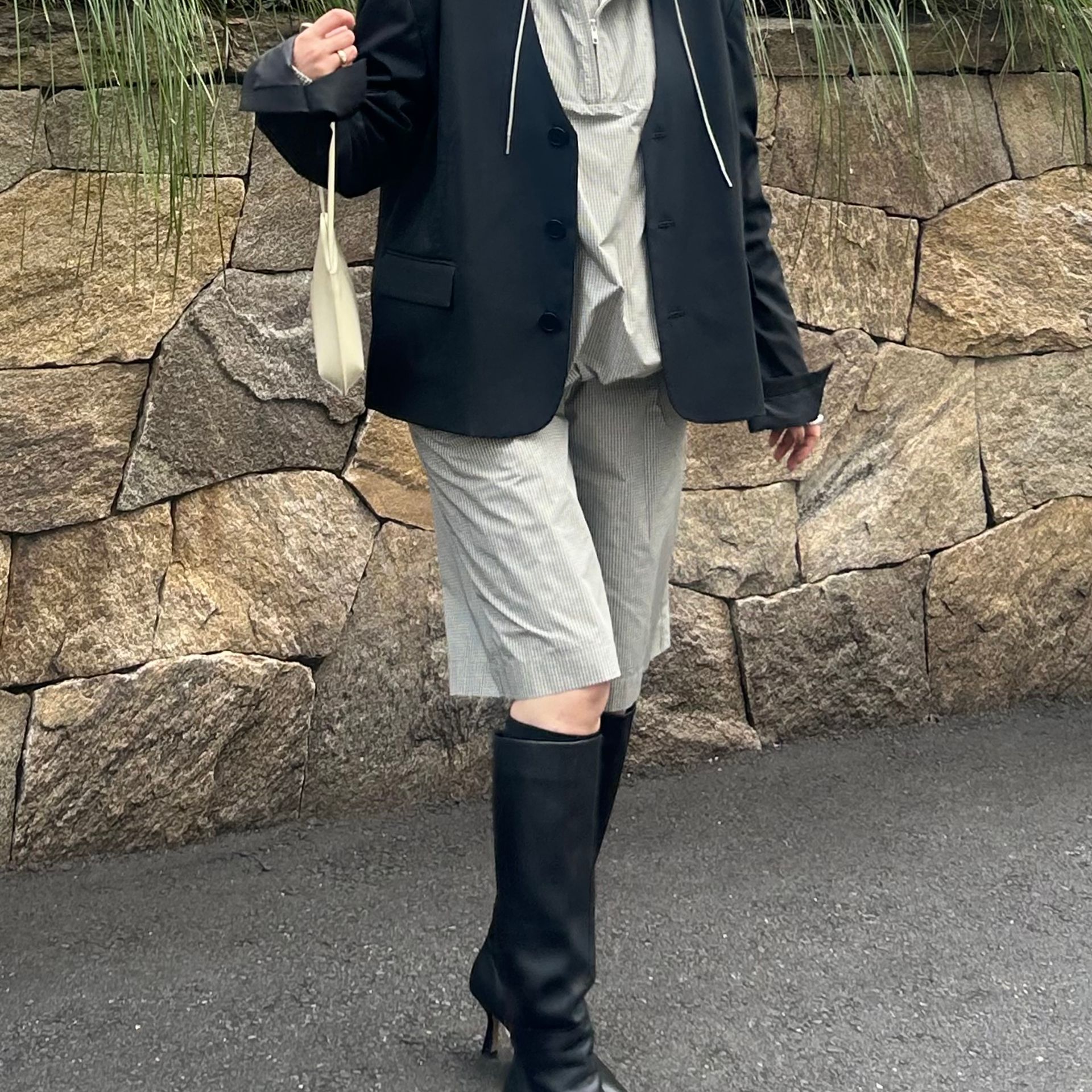 シンプルにパンツと合わせてみました。ハンサムすぎないように淡いピンクのボトムスを合わせて、サイドジップを開けて動きのあるスタイリングにすることで女性らしさがプラスできるので、ぜひお試しくださいね!!