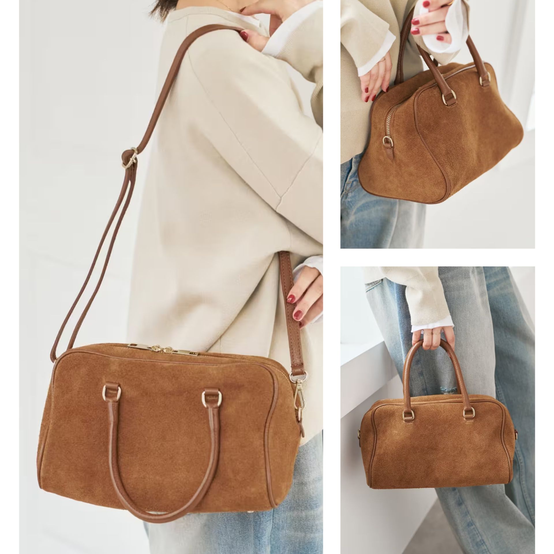素材とカラーを別注した、スエード素材のボストンバッグ。