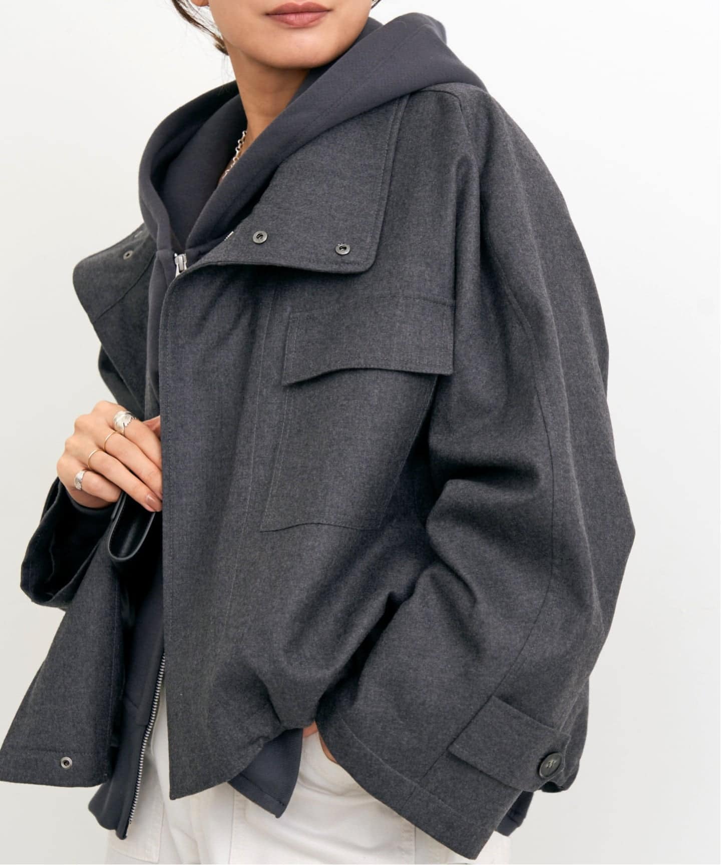 顔映りのいいほんのり赤みがかったグレーとスタイリングのアクセントになるイエロー。レイヤードや肩に掛けるなどのポイント使いにもおすすめな一着です。