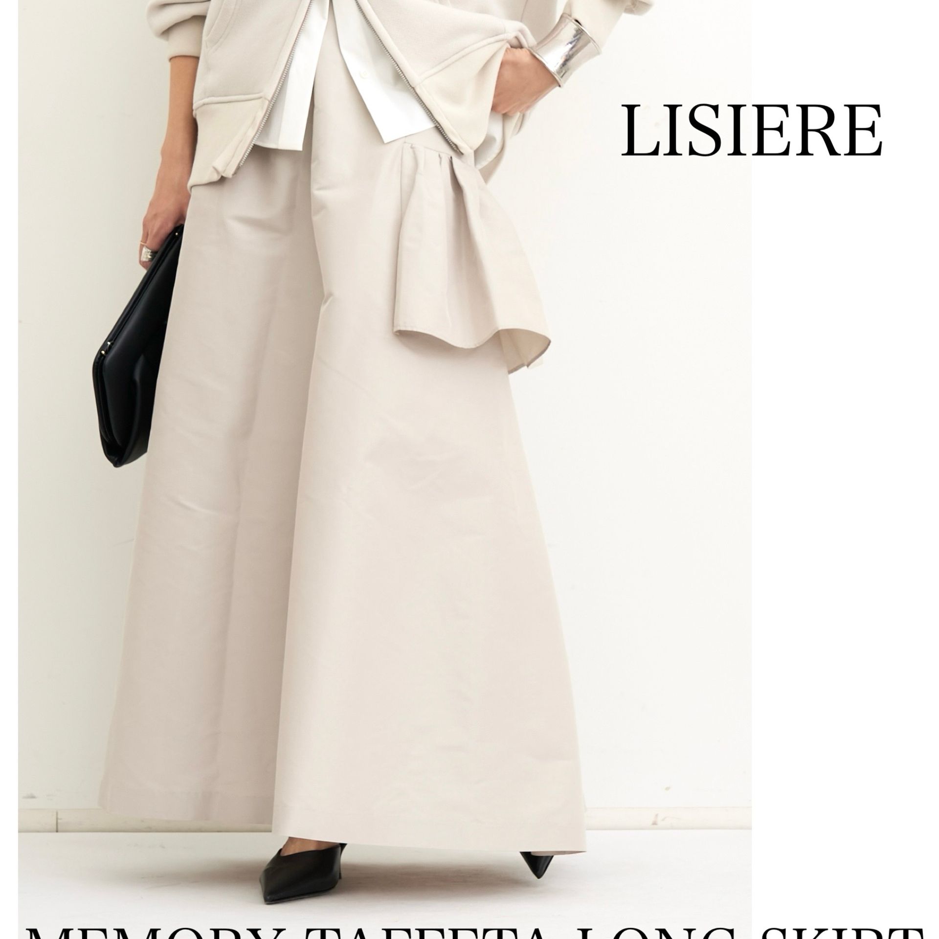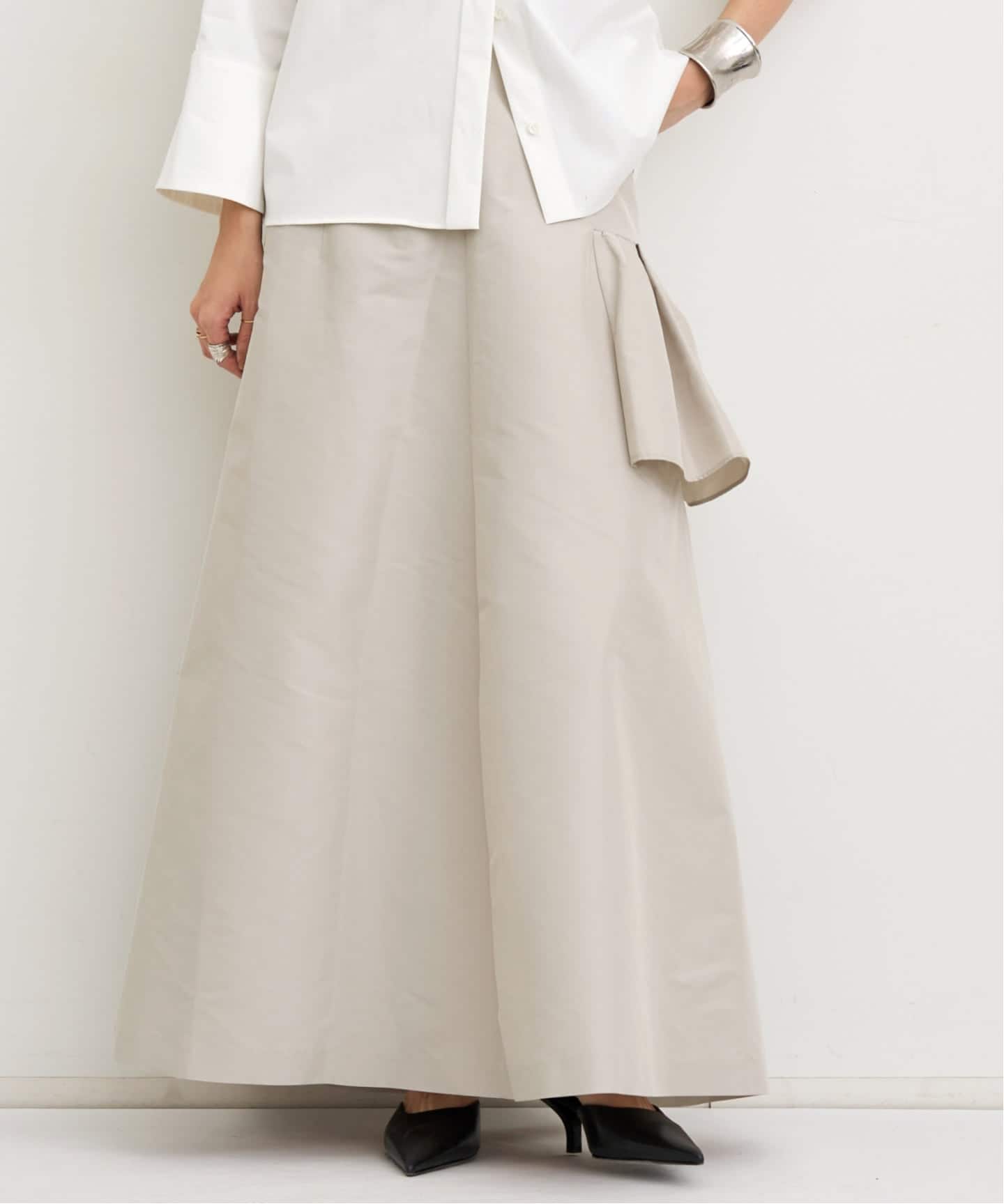 マットで上質な光沢感が美しいドラマティックなフレアシルエットのロングスカート。軽やかな動きが出る形状記憶素材を使用しているので、フェミニンな表情がありながらも甘くなりすぎず、大人らしく洗練された印象に。