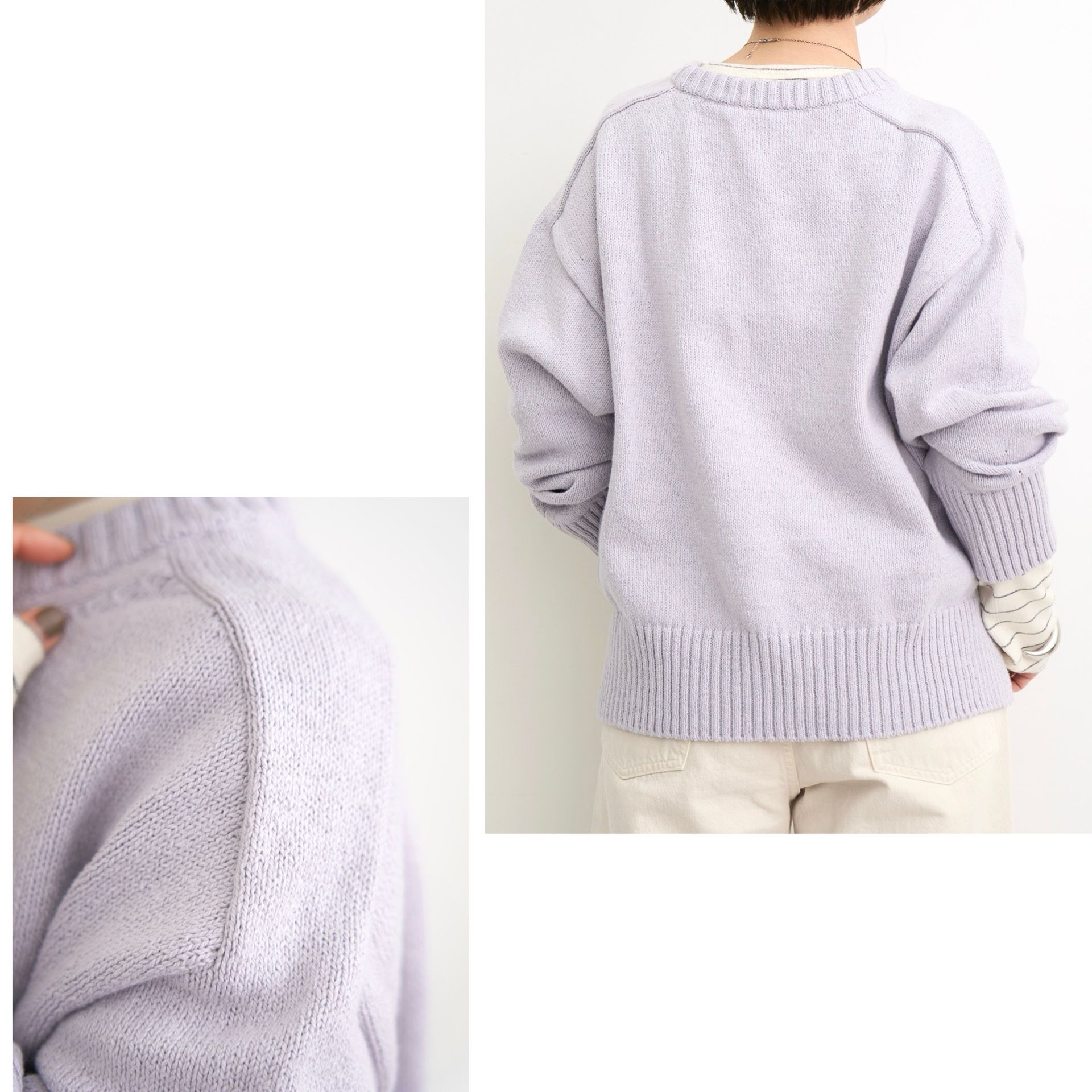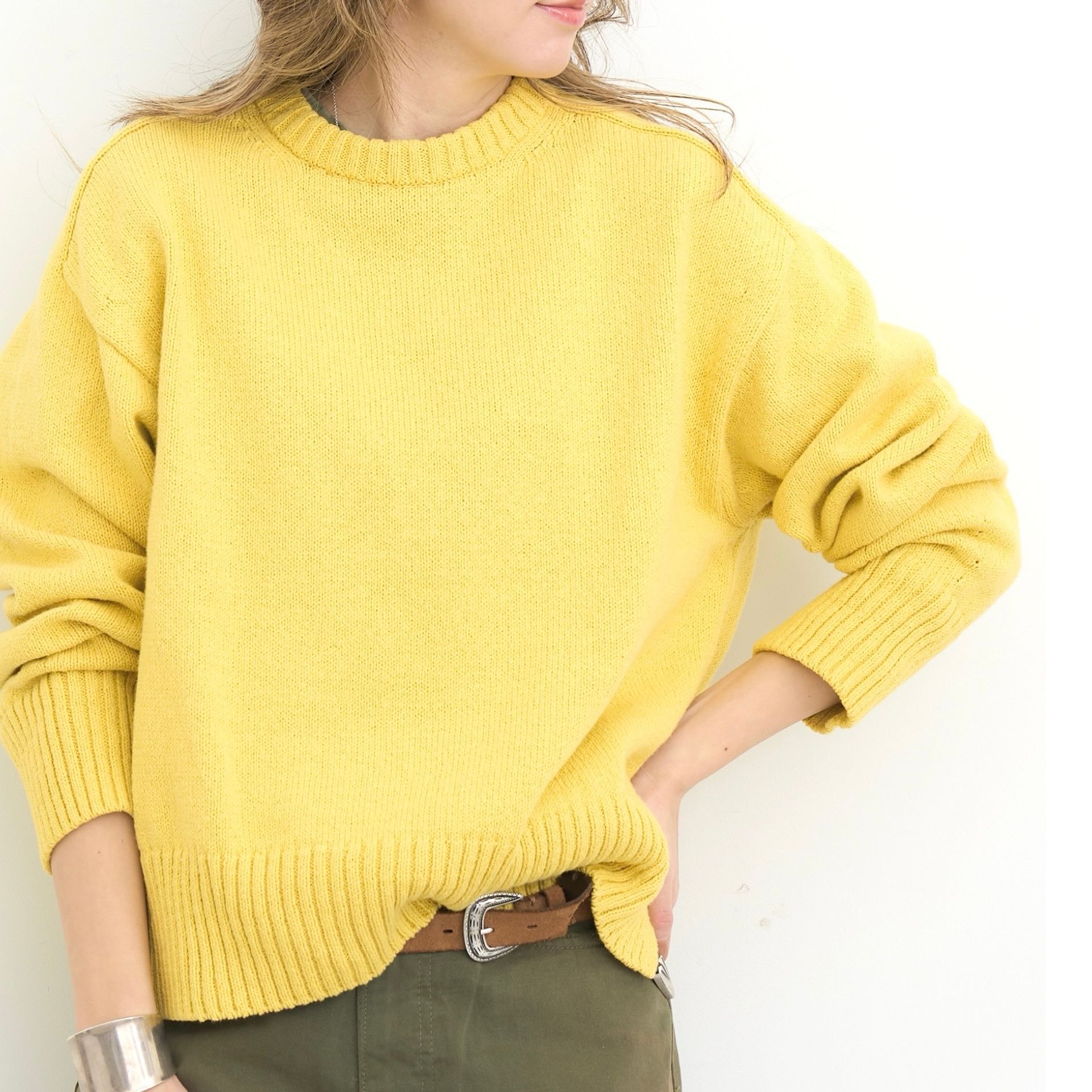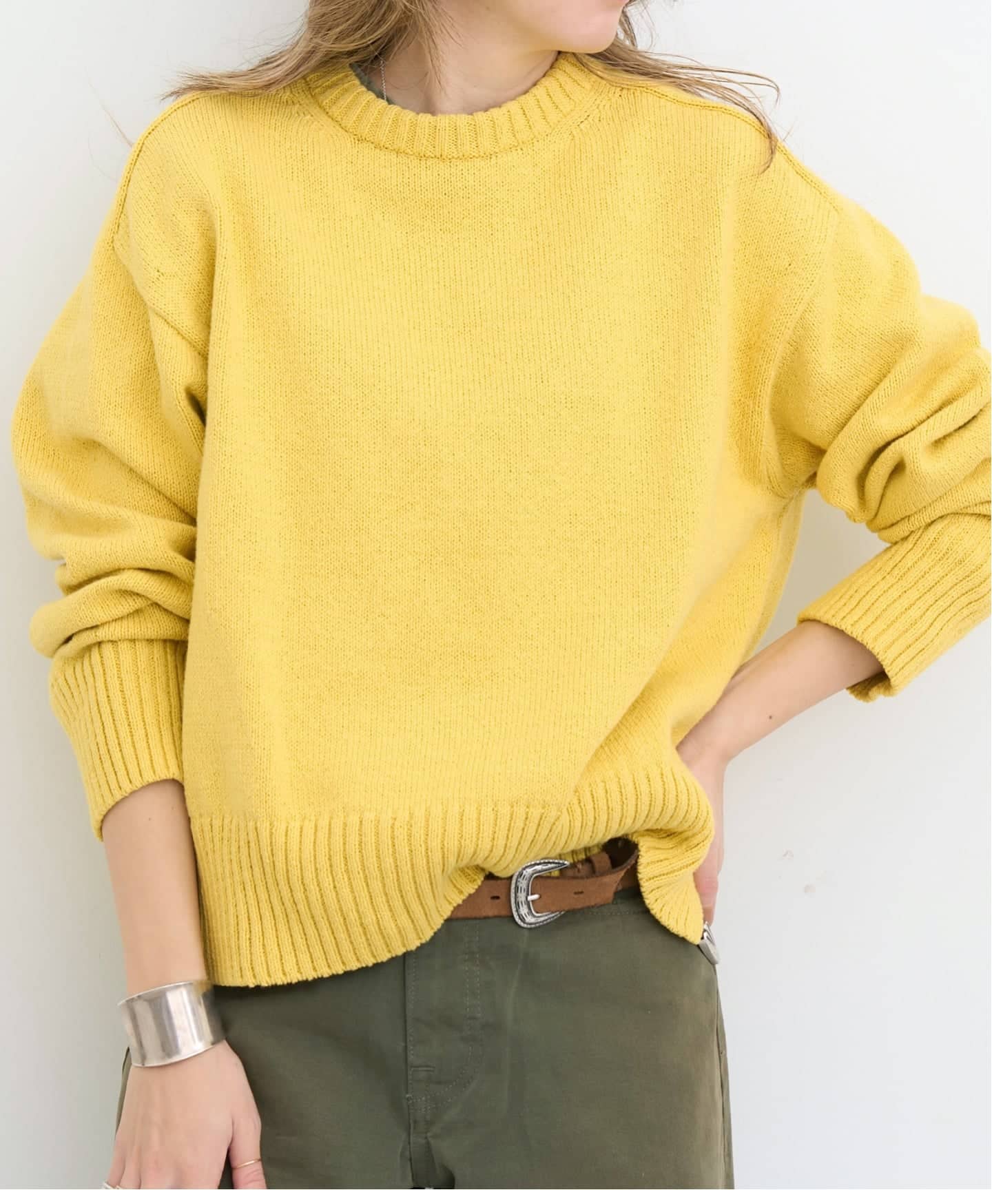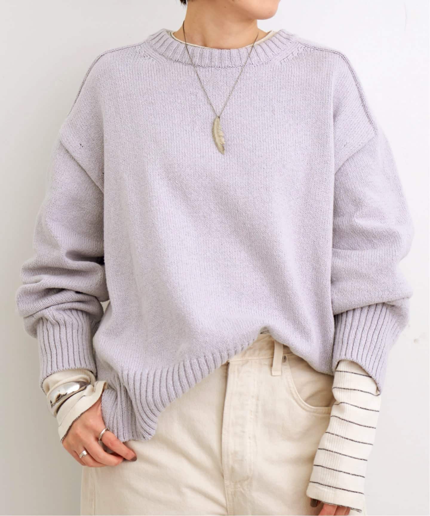 立体感のあるネックや、やや太めのリブデザインはそのままでも着映えする。ゆったりとしたデザインのシンプルながら味のあるニットです。