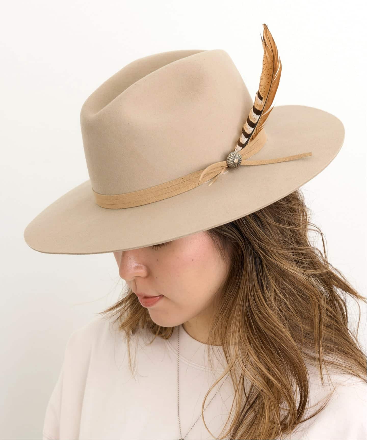 柔らかいオフホワイトのシンプルなデザインに、コンチョとフェザーがほど良いアクセントを添えてくれます。