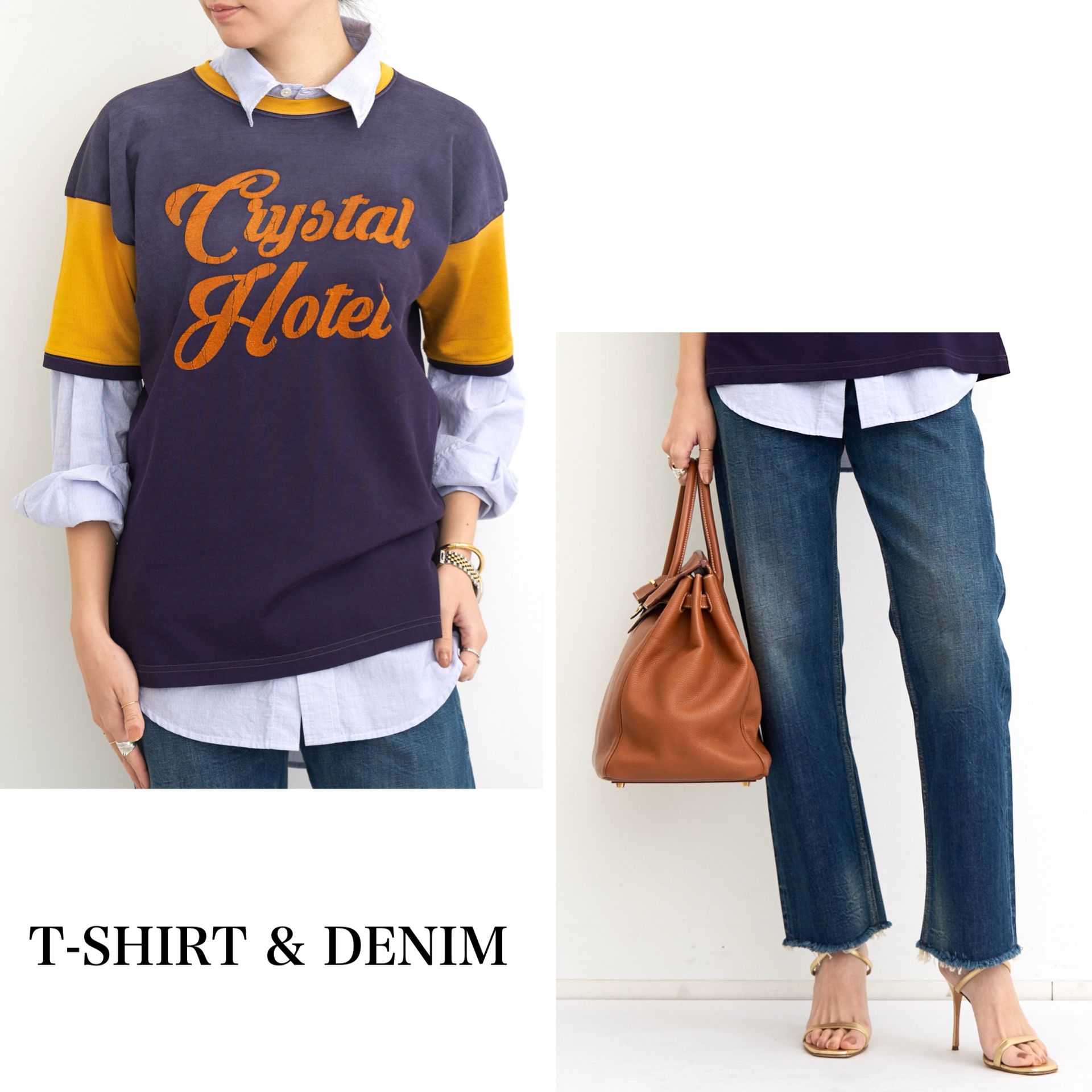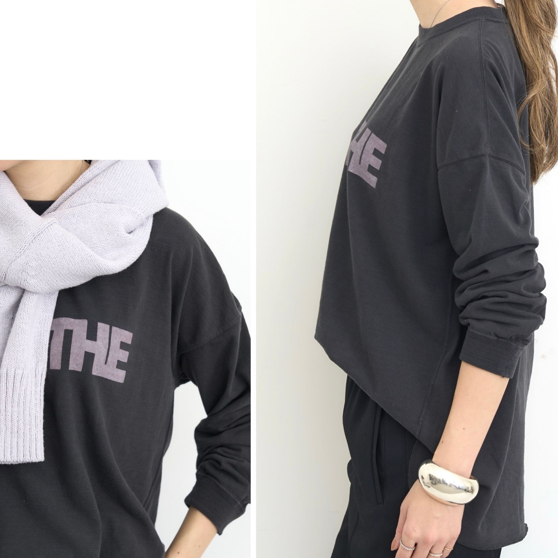 ヒビ割れた「Crystal Hotel」のプリントロゴがスタイリングのアクセントに。ゆったりとしたサイズ感でそのまま着ても、レイヤードスタイルにも重宝する一枚です。