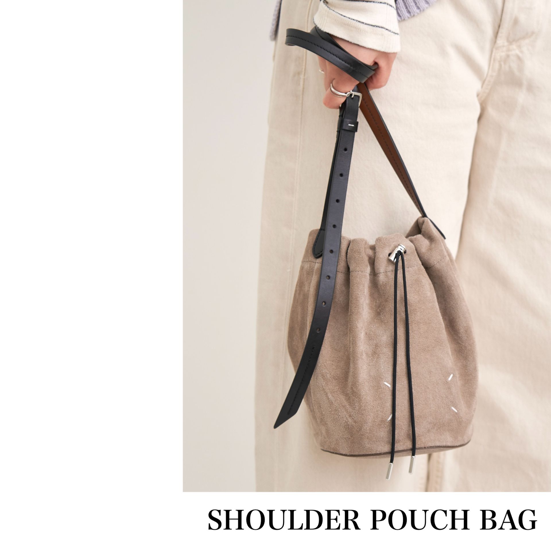 カジュアルなスエード素材もマルジェラならモダンで洗練された雰囲気に。コントラストの効いたベルト風ショルダーストラップは調整可能なので斜め掛けでも楽しめます。