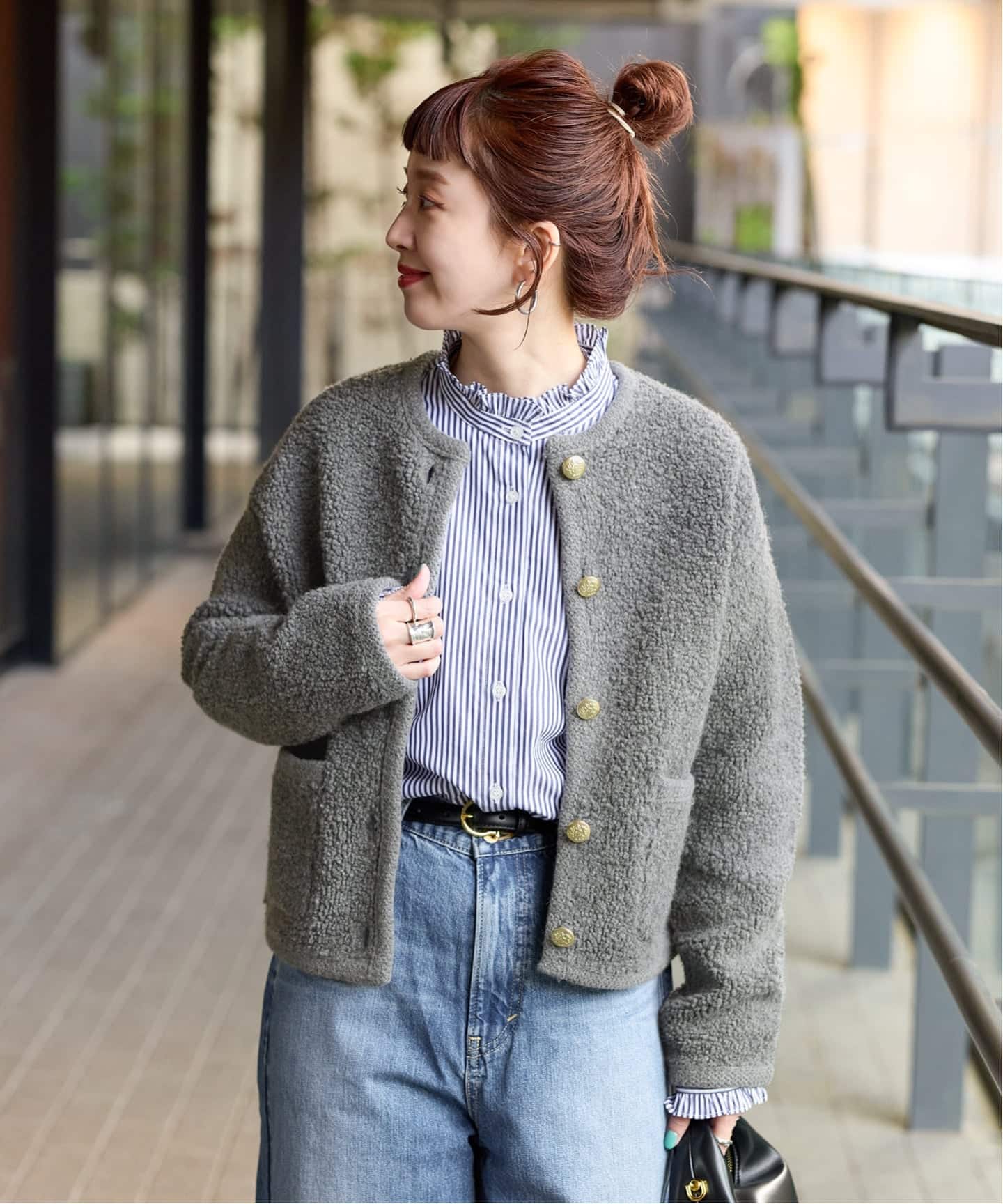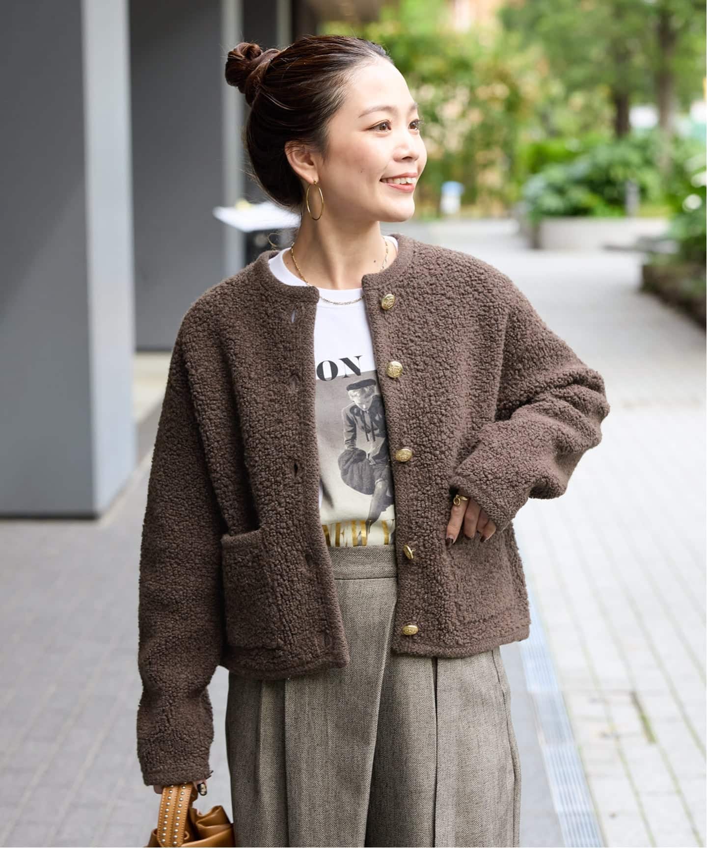 合わせるトップスはシンプルなスタイリングでも、羽織るだけで華やかな印象になるシャギーアウターです。今年らしいブラウンとブルーのチェックはオリジナルで組んだチェックになり、特別感が出ておすすめです。