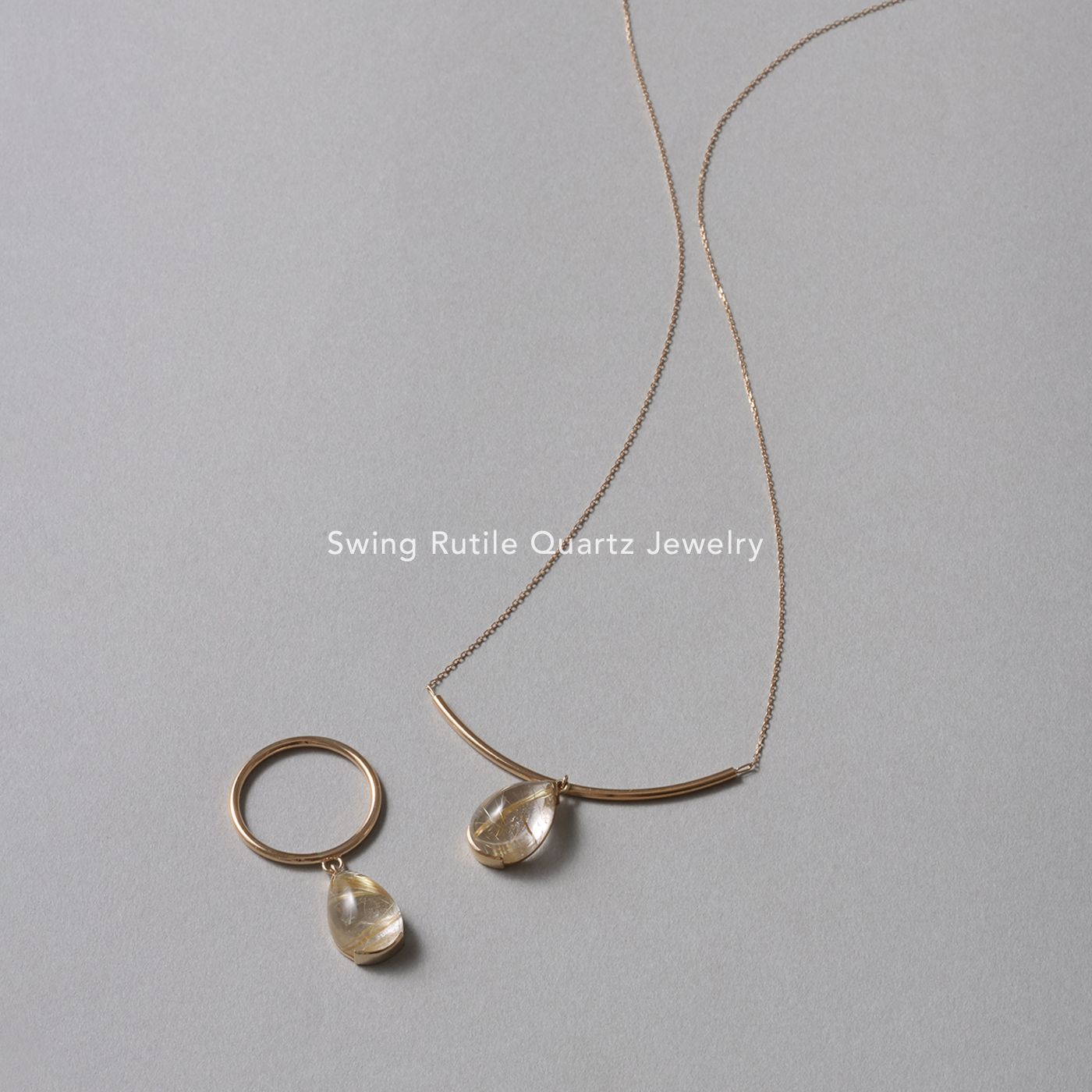 ティアドロップ型のルチルが、動くたびに繊細な輝きを放ち、シンプルなフォルムに洗練された表情を添えます。