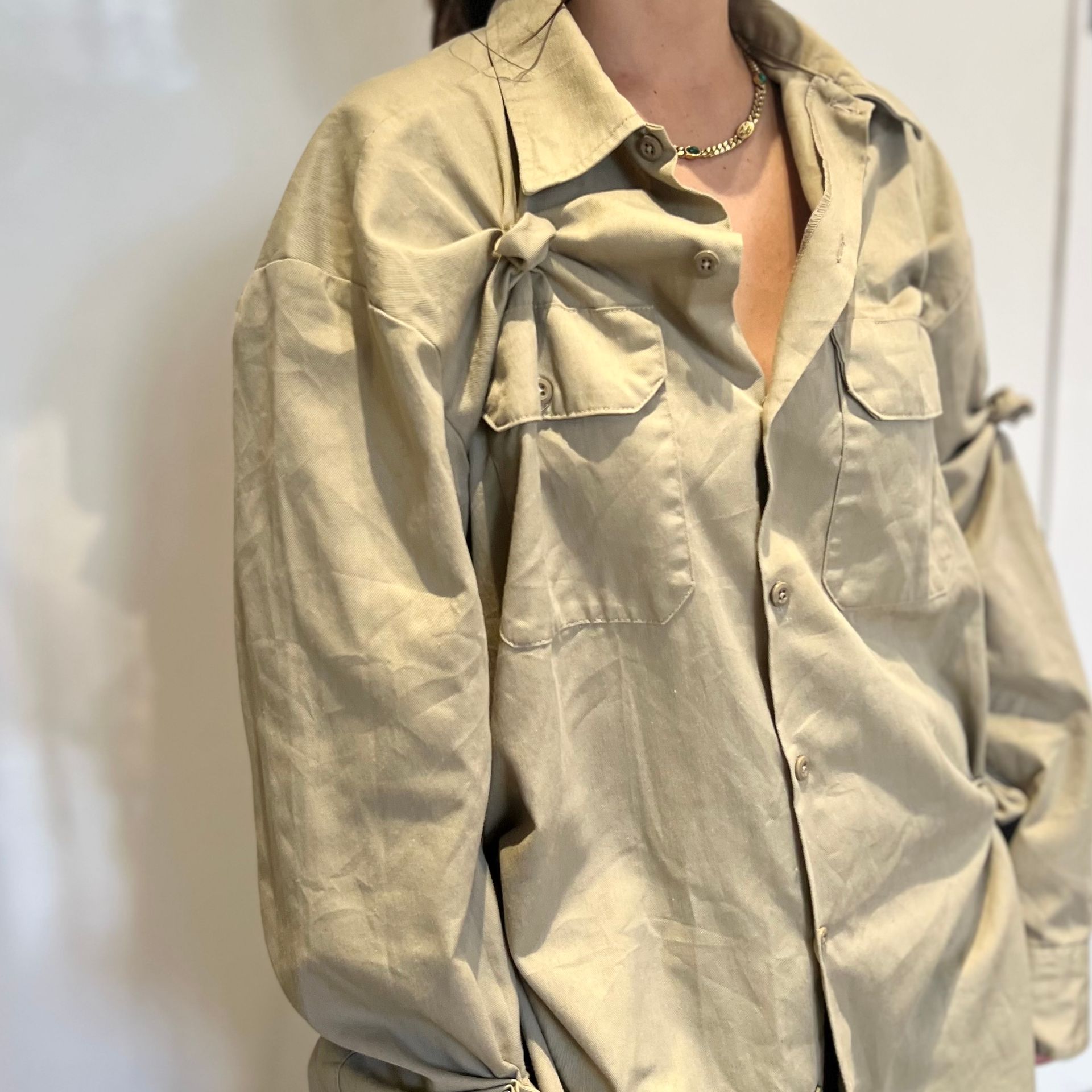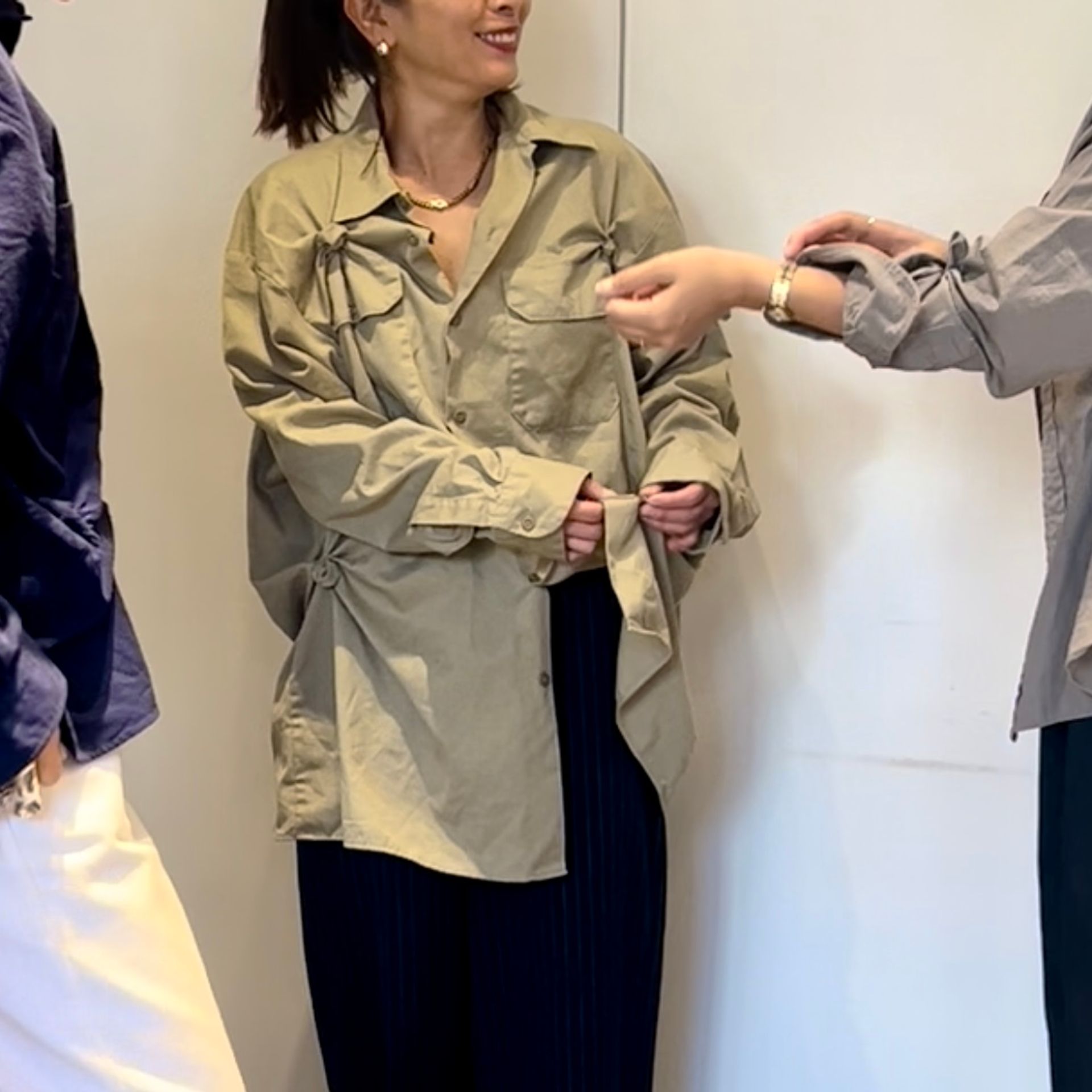 無骨な印象のワークシャツをベースに、 やわらかなバランスに整えたデザイン。控えめな佇まいに仕上げています。