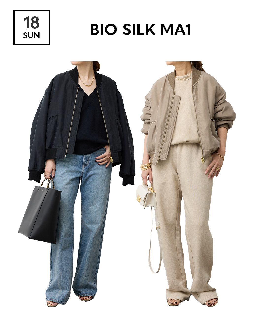 エレガントな大人のMA-1。贅沢なシルクの表地に中綿までシルク100%で軽やか。フィブリル加工を施しソフトな質感と色味がムードを宿す。