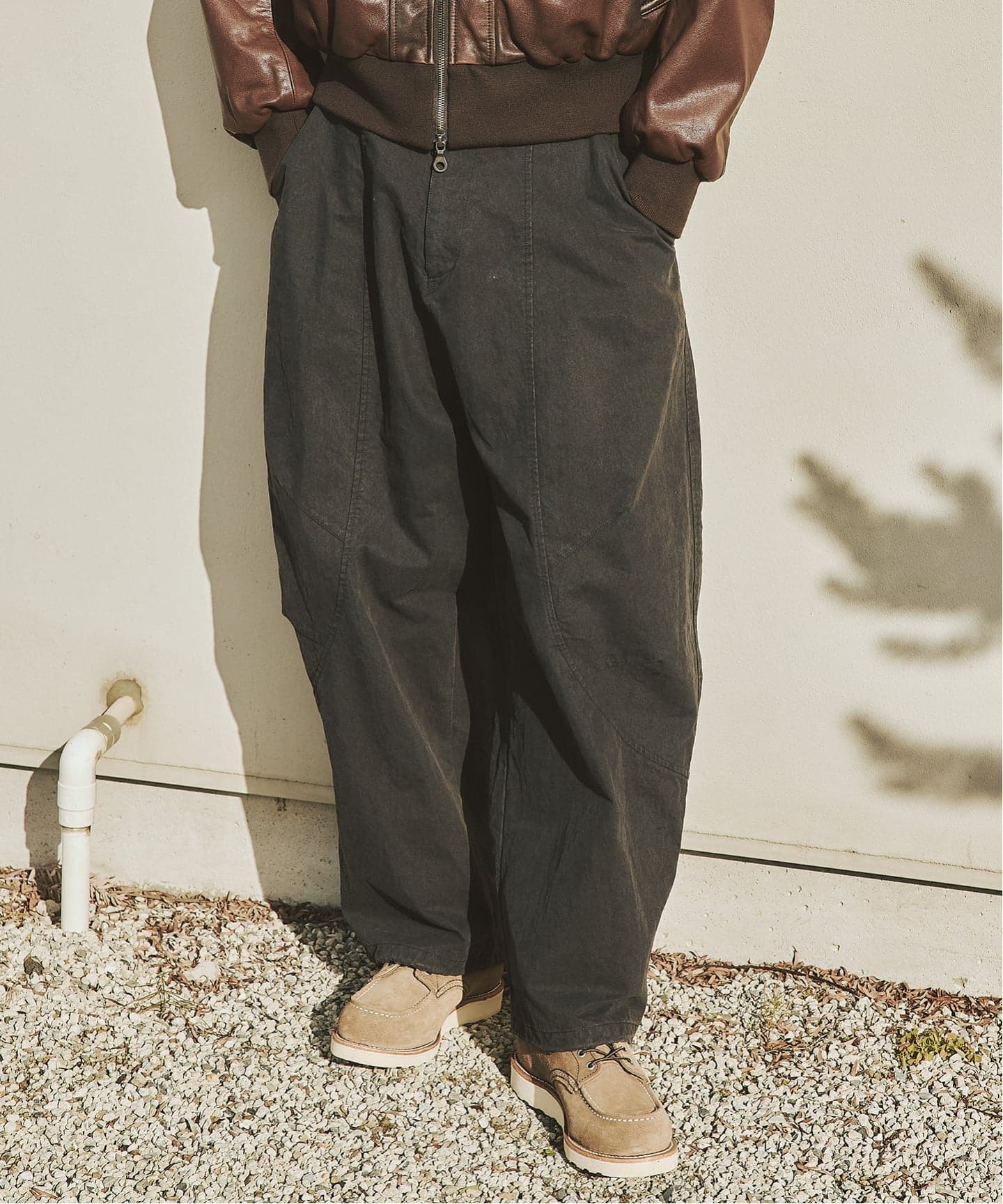 ゆったりとしたワタリから裾へ自然に落ちる立体的なシルエットで、リラックス感がありながらも野暮ったさを感じさせない仕上がりです。
