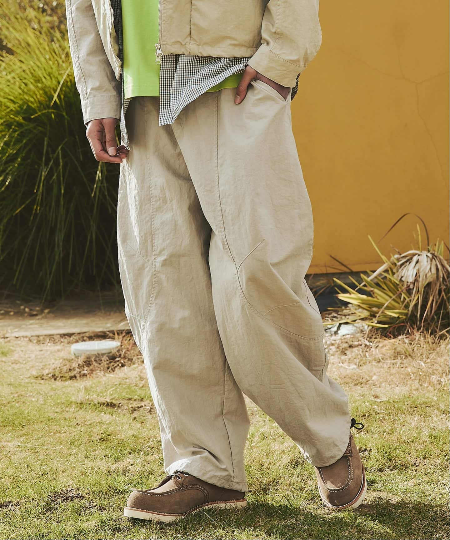 コットンのナチュラルな風合いに、ナイロンならではの軽さと耐久性を掛け合わせ、ハリ感がありつつも軽快な穿き心地を実現しています。程よいシワ感のある表情が、スタイリングにこなれた雰囲気を演出。