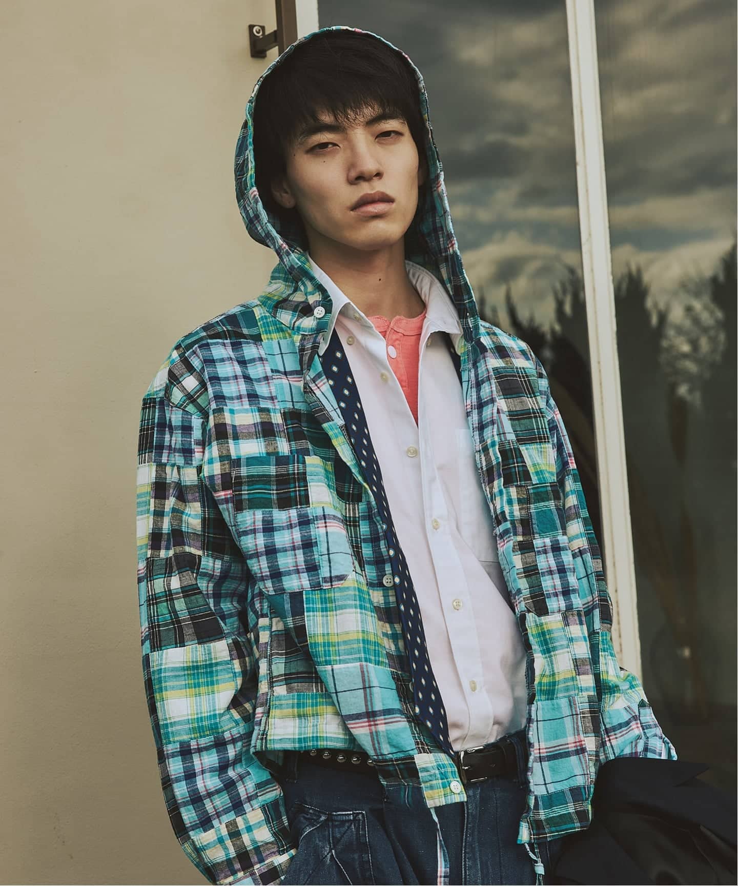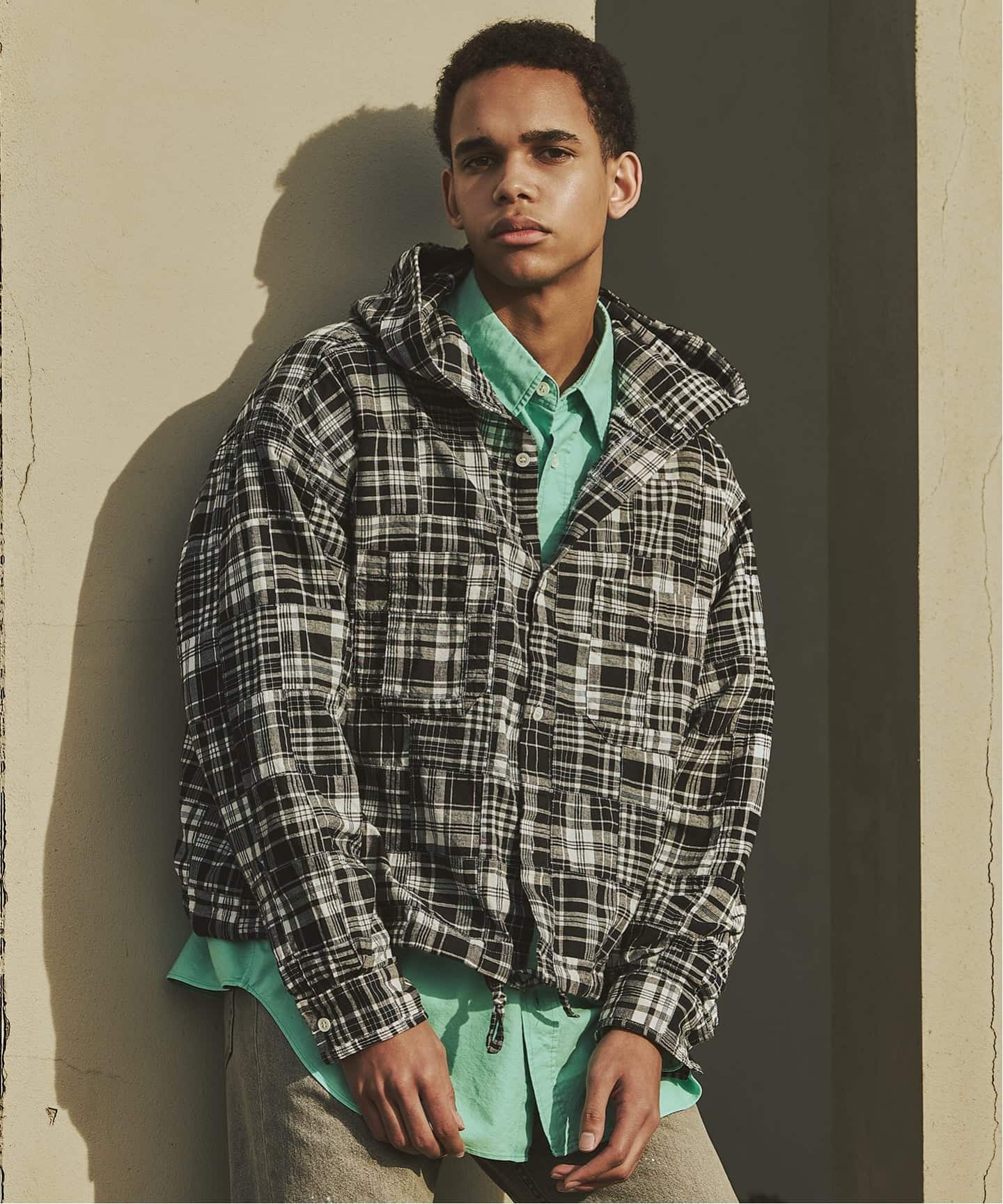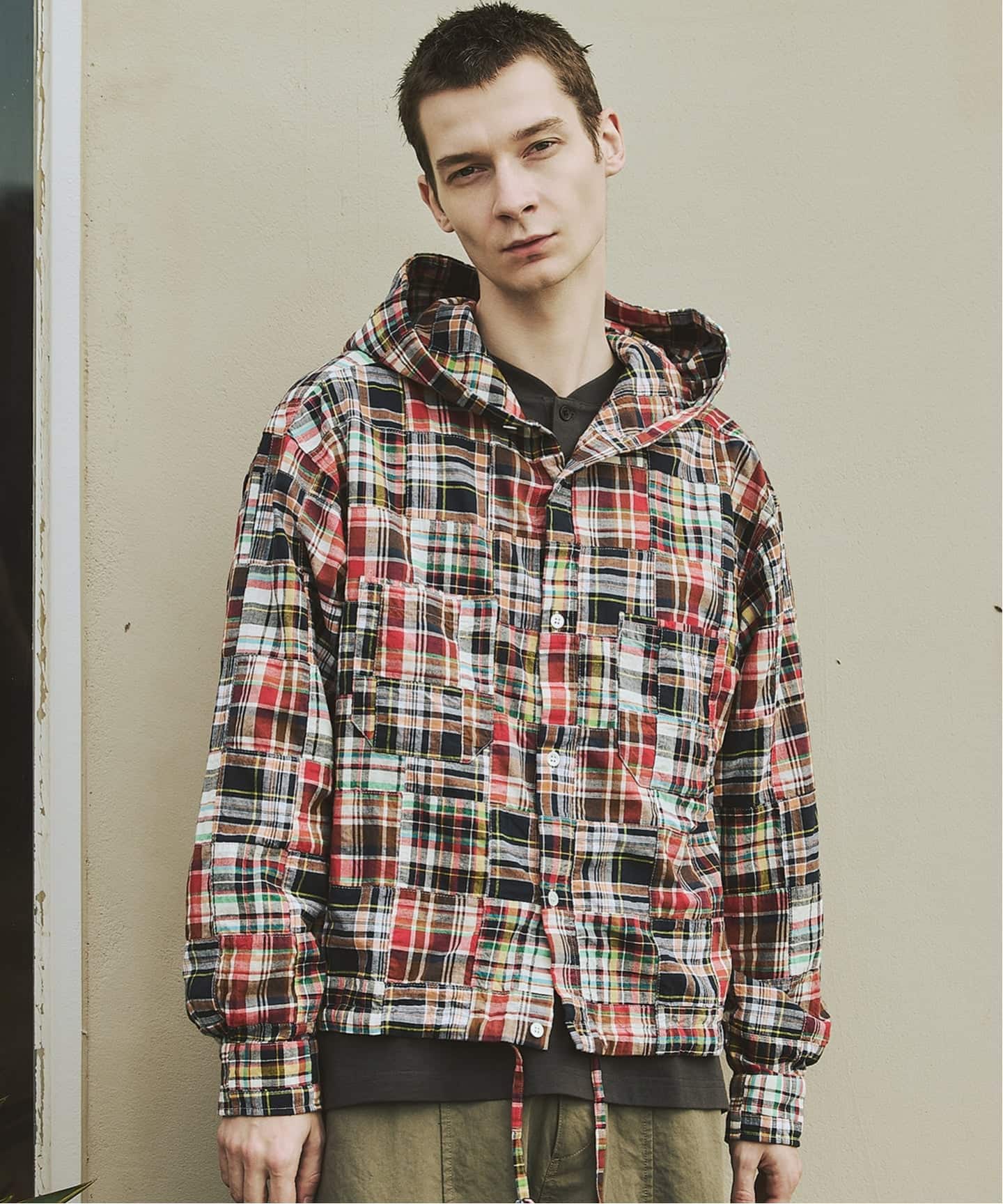 インド生産のマドラスチェックをパッチワークで仕立て、フード付きシャツ型に落とし込んだ存在感のある一着。