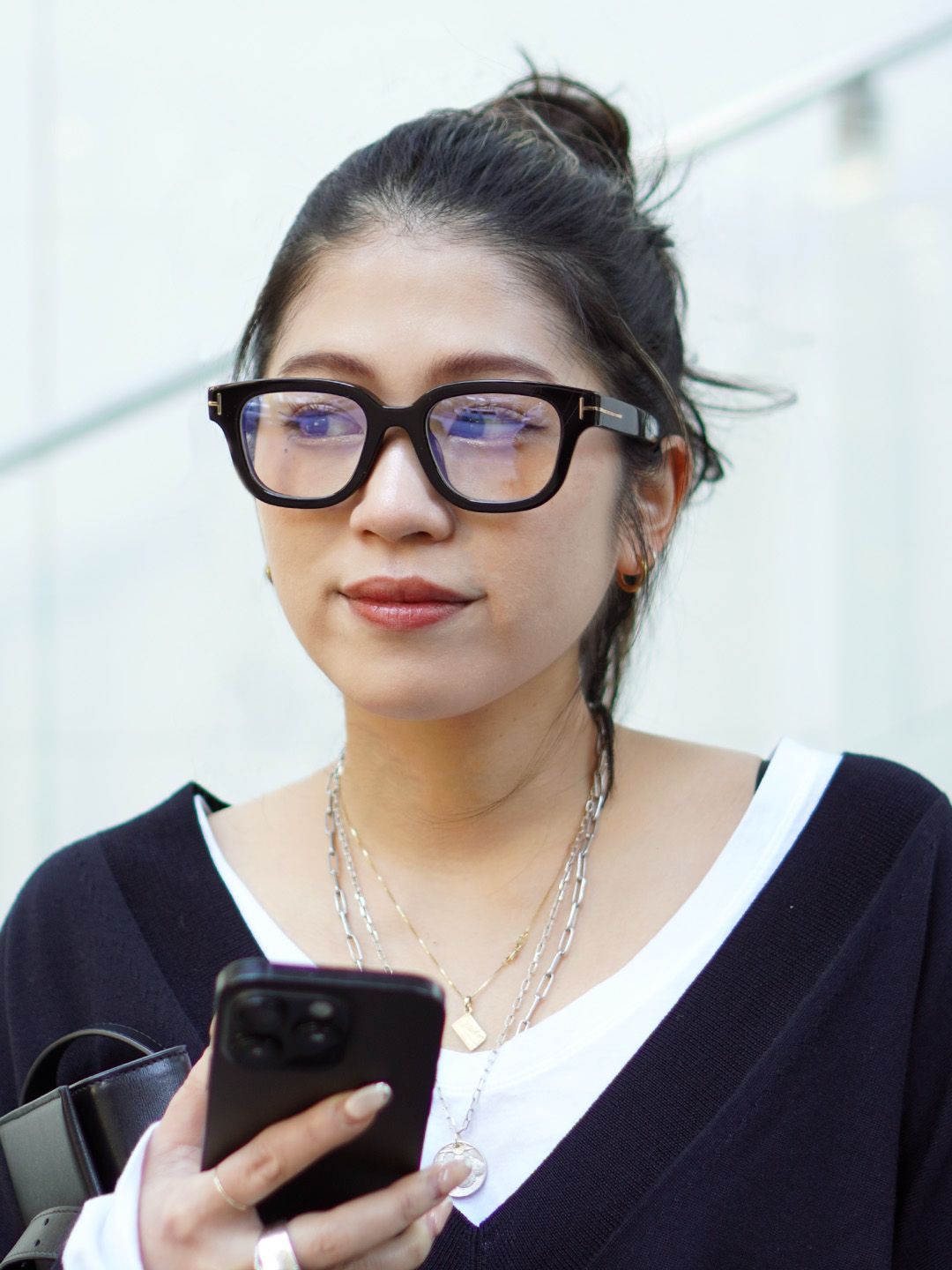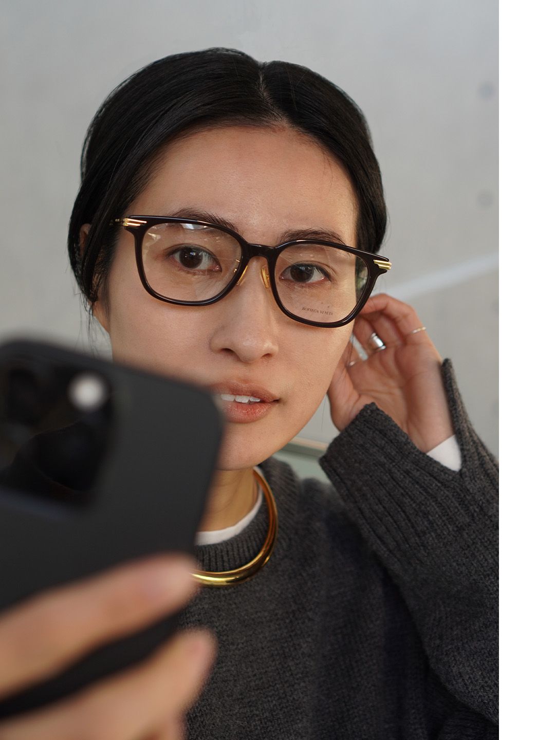 角のないスクエアシルエットが、硬くならずに顔の印象を高めてくれます。