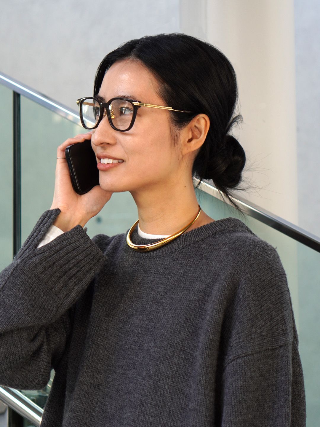 女性らしいニュアンスのあるニットには、あえて存在感のある端正なセルフレームを着けたい!