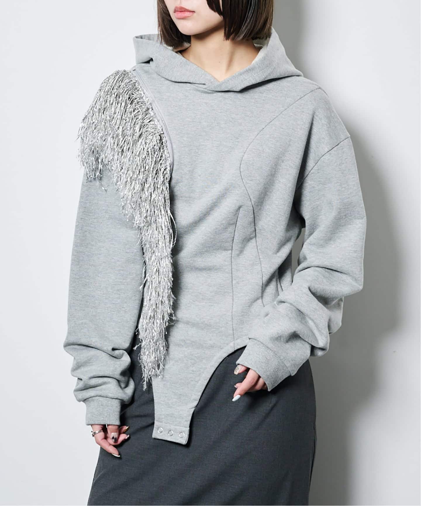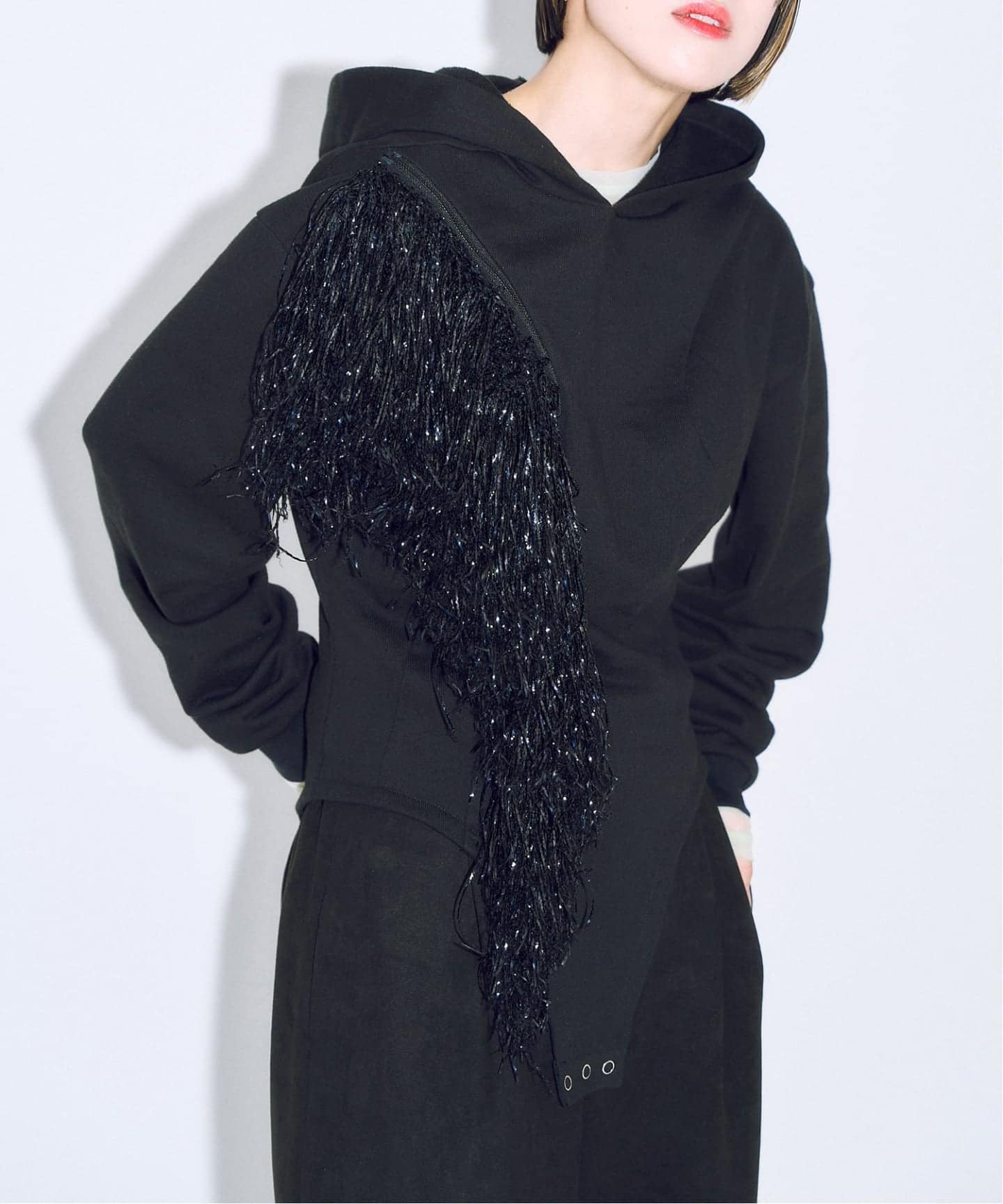フェティッシュでモード、そしてどこか知的。 オートクチュールの領域を感じさせるフリンジと、 ラフなスウェットという日常着が、美しいバランスで共存します。