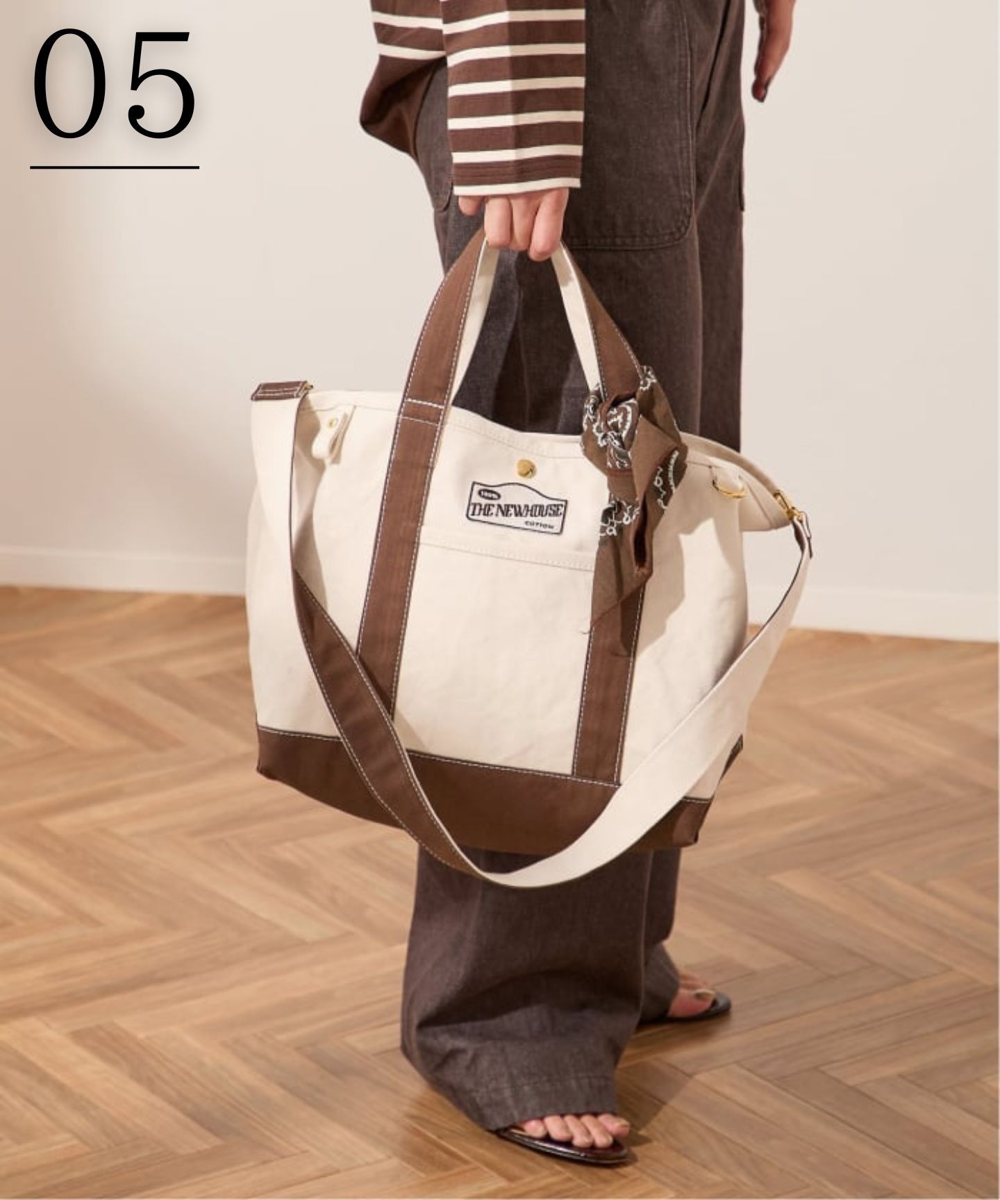 'L’ESSAGE別注で、さりげない上質感をプラスしたTHENEWHOUSEのトートバッグ。キャンバス地にブラウンを組み合わせた洗練されたデザインに、ゴールドの金具がアクセントとして映える特別仕様。付属でバンダナもついています。取り外し可能なショルダーストラップ付きで、シーンに合わせて使い分けが可能です。カジュアルな中にも品のある佇まいで、日常使いはもちろん、きれいめなスタイリングにもマッチする万能アイテムです。