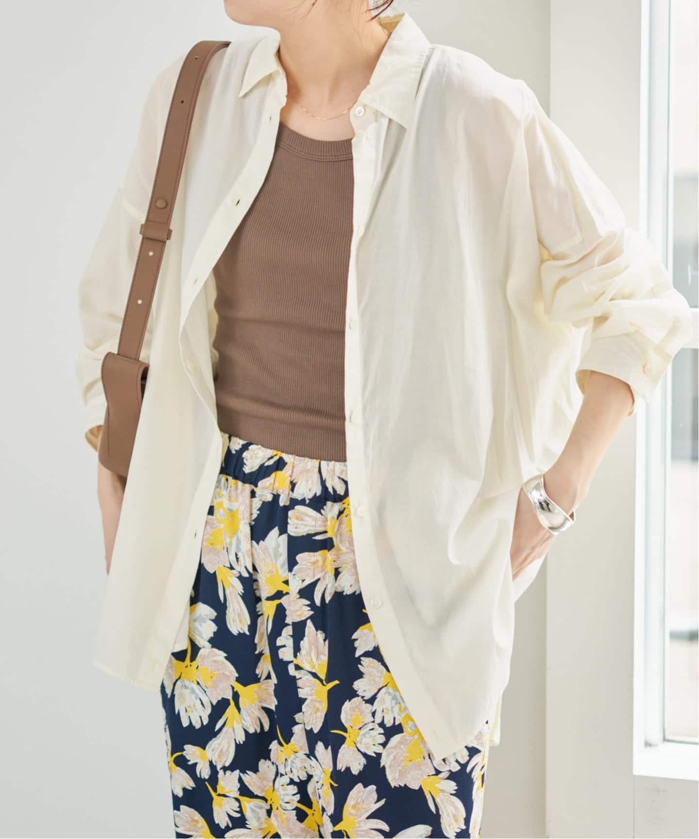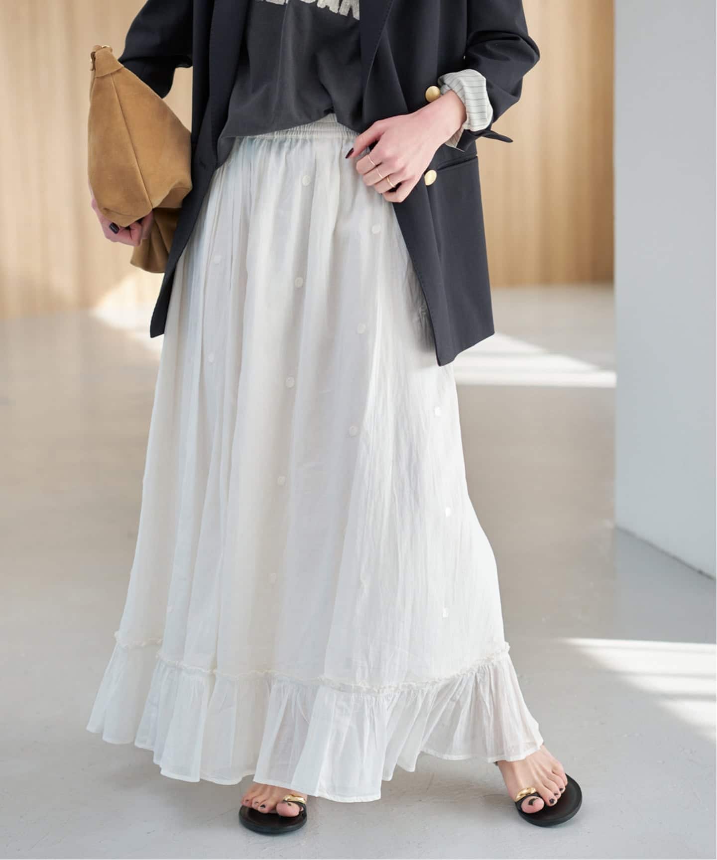 オンオフ問わず使えるミドル丈で、春のワードローブに欠かせない一着です。